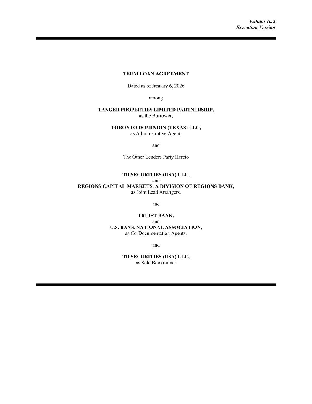 Exhibit 10.2 Execution Version TERM LOAN AGREEMENT Dated as of January 6, 2026 among TANGER PROPERTIES LIMITED PARTNERSHIP, as the Borrower, TORONTO DOMINION (TEXAS) LLC, as Administrative Agent, and The Other Lenders Party Hereto TD SECURITIES (USA) LLC, and REGIONS CAPITAL MARKETS, A DIVISION OF REGIONS BANK, as Joint Lead Arrangers, and TRUIST BANK, and U.S. BANK NATIONAL ASSOCIATION, as Co-Documentation Agents, and TD SECURITIES (USA) LLC, as Sole Bookrunner