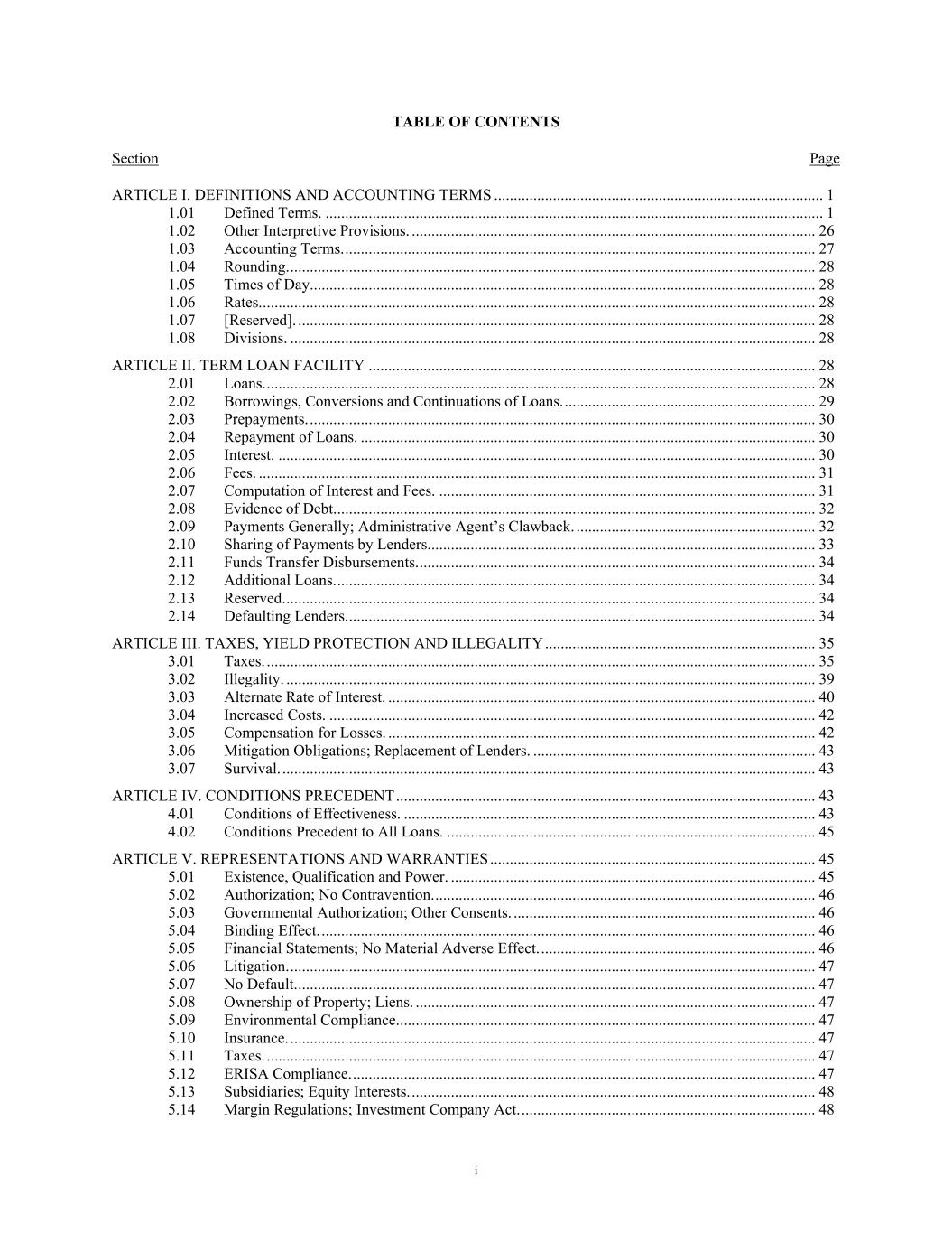 i TABLE OF CONTENTS Section Page ARTICLE I. DEFINITIONS AND ACCOUNTING TERMS .................................................................................... 1 1.01 Defined Terms. ............................................................................................................................... 1 1.02 Other Interpretive Provisions. ....................................................................................................... 26 1.03 Accounting Terms. ........................................................................................................................ 27 1.04 Rounding. ...................................................................................................................................... 28 1.05 Times of Day. ................................................................................................................................ 28 1.06 Rates. ............................................................................................................................................. 28 1.07 [Reserved]. .................................................................................................................................... 28 1.08 Divisions. ...................................................................................................................................... 28 ARTICLE II. TERM LOAN FACILITY .................................................................................................................. 28 2.01 Loans. ............................................................................................................................................ 28 2.02 Borrowings, Conversions and Continuations of Loans. ................................................................ 29 2.03 Prepayments. ................................................................................................................................. 30 2.04 Repayment of Loans. .................................................................................................................... 30 2.05 Interest. ......................................................................................................................................... 30 2.06 Fees. .............................................................................................................................................. 31 2.07 Computation of Interest and Fees. ................................................................................................ 31 2.08 Evidence of Debt. .......................................................................................................................... 32 2.09 Payments Generally; Administrative Agent’s Clawback. ............................................................. 32 2.10 Sharing of Payments by Lenders. .................................................................................................. 33 2.11 Funds Transfer Disbursements. ..................................................................................................... 34 2.12 Additional Loans. .......................................................................................................................... 34 2.13 Reserved. ....................................................................................................................................... 34 2.14 Defaulting Lenders. ....................................................................................................................... 34 ARTICLE III. TAXES, YIELD PROTECTION AND ILLEGALITY ..................................................................... 35 3.01 Taxes. ............................................................................................................................................ 35 3.02 Illegality. ....................................................................................................................................... 39 3.03 Alternate Rate of Interest. ............................................................................................................. 40 3.04 Increased Costs. ............................................................................................................................ 42 3.05 Compensation for Losses. ............................................................................................................. 42 3.06 Mitigation Obligations; Replacement of Lenders. ........................................................................ 43 3.07 Survival. ........................................................................................................................................ 43 ARTICLE IV. CONDITIONS PRECEDENT ........................................................................................................... 43 4.01 Conditions of Effectiveness. ......................................................................................................... 43 4.02 Conditions Precedent to All Loans. .............................................................................................. 45 ARTICLE V. REPRESENTATIONS AND WARRANTIES ................................................................................... 45 5.01 Existence, Qualification and Power. ............................................................................................. 45 5.02 Authorization; No Contravention. ................................................................................................. 46 5.03 Governmental Authorization; Other Consents. ............................................................................. 46 5.04 Binding Effect. .............................................................................................................................. 46 5.05 Financial Statements; No Material Adverse Effect. ...................................................................... 46 5.06 Litigation. ............................