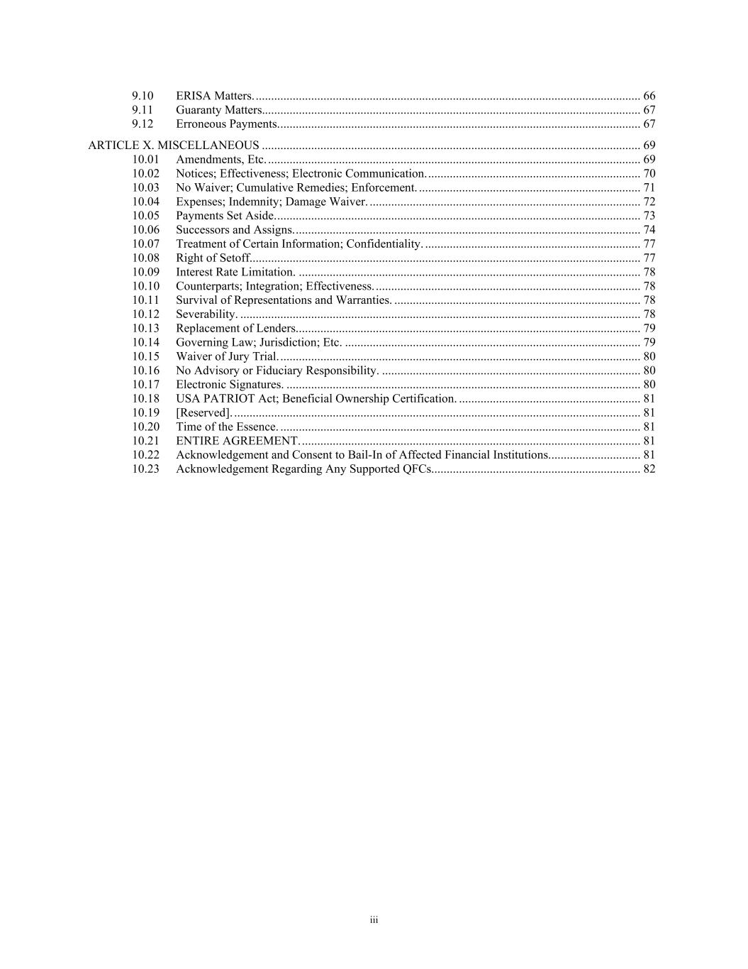 iii 9.10 ERISA Matters. ............................................................................................................................. 66 9.11 Guaranty Matters........................................................................................................................... 67 9.12 Erroneous Payments. ..................................................................................................................... 67 ARTICLE X. MISCELLANEOUS ........................................................................................................................... 69 10.01 Amendments, Etc. ......................................................................................................................... 69 10.02 Notices; Effectiveness; Electronic Communication. ..................................................................... 70 10.03 No Waiver; Cumulative Remedies; Enforcement. ........................................................................ 71 10.04 Expenses; Indemnity; Damage Waiver. ........................................................................................ 72 10.05 Payments Set Aside. ...................................................................................................................... 73 10.06 Successors and Assigns. ................................................................................................................ 74 10.07 Treatment of Certain Information; Confidentiality. ...................................................................... 77 10.08 Right of Setoff. .............................................................................................................................. 77 10.09 Interest Rate Limitation. ............................................................................................................... 78 10.10 Counterparts; Integration; Effectiveness. ...................................................................................... 78 10.11 Survival of Representations and Warranties. ................................................................................ 78 10.12 Severability. .................................................................................................................................. 78 10.13 Replacement of Lenders. ............................................................................................................... 79 10.14 Governing Law; Jurisdiction; Etc. ................................................................................................ 79 10.15 Waiver of Jury Trial. ..................................................................................................................... 80 10.16 No Advisory or Fiduciary Responsibility. .................................................................................... 80 10.17 Electronic Signatures. ................................................................................................................... 80 10.18 USA PATRIOT Act; Beneficial Ownership Certification. ........................................................... 81 10.19 [Reserved]. .................................................................................................................................... 81 10.20 Time of the Essence. ..................................................................................................................... 81 10.21 ENTIRE AGREEMENT. .............................................................................................................. 81 10.22 Acknowledgement and Consent to Bail-In of Affected Financial Institutions. ............................. 81 10.23 Acknowledgement Regarding Any Supported QFCs.................................................................... 82