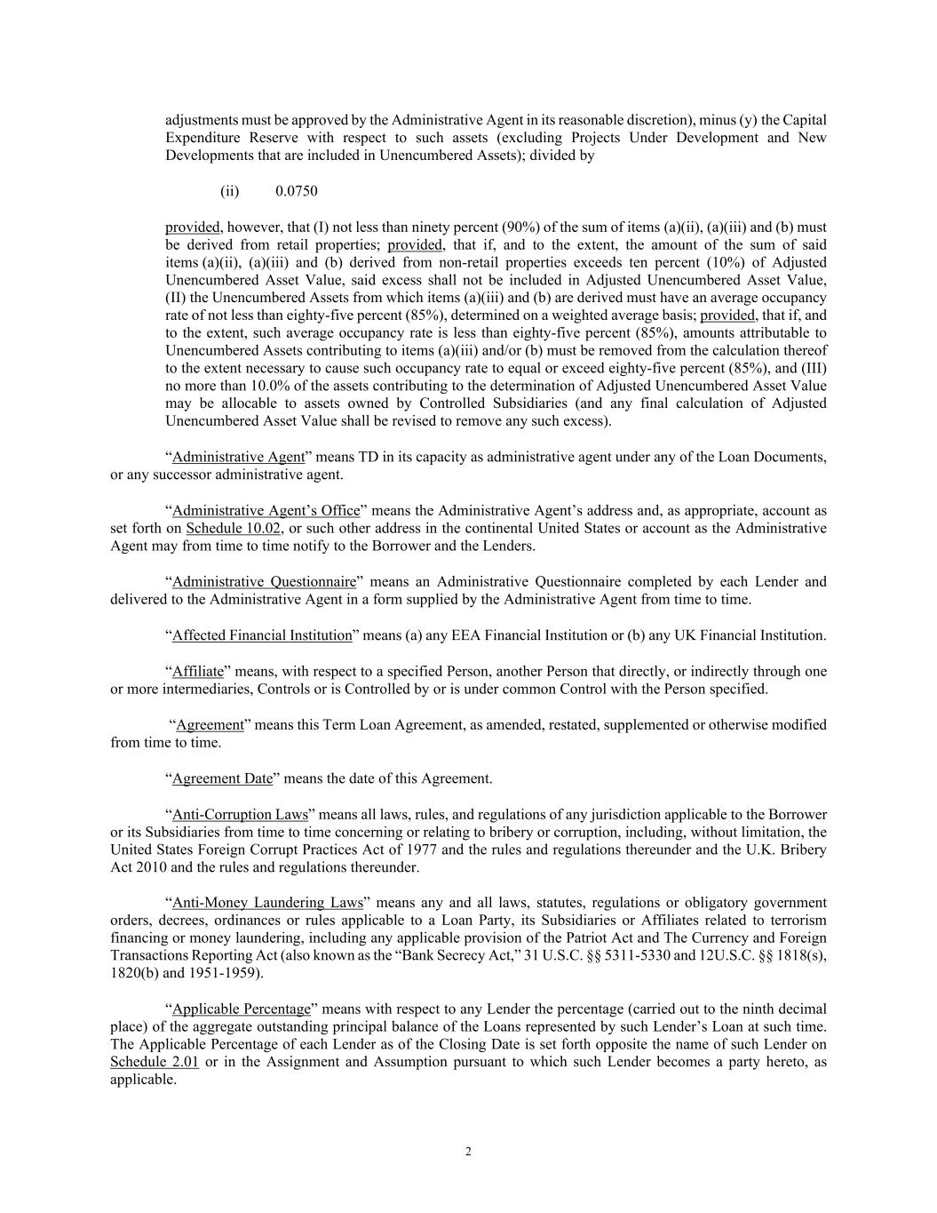 2 adjustments must be approved by the Administrative Agent in its reasonable discretion), minus (y) the Capital Expenditure Reserve with respect to such assets (excluding Projects Under Development and New Developments that are included in Unencumbered Assets); divided by (ii) 0.0750 provided, however, that (I) not less than ninety percent (90%) of the sum of items (a)(ii), (a)(iii) and (b) must be derived from retail properties; provided, that if, and to the extent, the amount of the sum of said items (a)(ii), (a)(iii) and (b) derived from non-retail properties exceeds ten percent (10%) of Adjusted Unencumbered Asset Value, said excess shall not be included in Adjusted Unencumbered Asset Value, (II) the Unencumbered Assets from which items (a)(iii) and (b) are derived must have an average occupancy rate of not less than eighty-five percent (85%), determined on a weighted average basis; provided, that if, and to the extent, such average occupancy rate is less than eighty-five percent (85%), amounts attributable to Unencumbered Assets contributing to items (a)(iii) and/or (b) must be removed from the calculation thereof to the extent necessary to cause such occupancy rate to equal or exceed eighty-five percent (85%), and (III) no more than 10.0% of the assets contributing to the determination of Adjusted Unencumbered Asset Value may be allocable to assets owned by Controlled Subsidiaries (and any final calculation of Adjusted Unencumbered Asset Value shall be revised to remove any such excess). “Administrative Agent” means TD in its capacity as administrative agent under any of the Loan Documents, or any successor administrative agent. “Administrative Agent’s Office” means the Administrative Agent’s address and, as appropriate, account as set forth on Schedule 10.02, or such other address in the continental United States or account as the Administrative Agent may from time to time notify to the Borrower and the Lenders. “Administrative Questionnaire” means an Administrative Questionnaire completed by each Lender and delivered to the Administrative Agent in a form supplied by the Administrative Agent from time to time. “Affected Financial Institution” means (a) any EEA Financial Institution or (b) any UK Financial Institution. “Affiliate” means, with respect to a specified Person, another Person that directly, or indirectly through one or more intermediaries, Controls or is Controlled by or is under common Control with the Person specified. “Agreement” means this Term Loan Agreement, as amended, restated, supplemented or otherwise modified from time to time. “Agreement Date” means the date of this Agreement. “Anti-Corruption Laws” means all laws, rules, and regulations of any jurisdiction applicable to the Borrower or its Subsidiaries from time to time concerning or relating to bribery or corruption, including, without limitation, the United States Foreign Corrupt Practices Act of 1977 and the rules and regulations thereunder and the U.K. Bribery Act 2010 and the rules and regulations thereunder. “Anti-Money Laundering Laws” means any and all laws, statutes, regulations or obligatory government orders, decrees, ordinances or rules applicable to a Loan Party, its Subsidiaries or Affiliates related to terrorism financing or money laundering, including any applicable provision of the Patriot Act and The Currency and Foreign Transactions Reporting Act (also known as the “Bank Secrecy Act,” 31 U.S.C. §§ 5311-5330 and 12U.S.C. §§ 1818(s), 1820(b) and 1951-1959). “Applicable Percentage” means with respect to any Lender the percentage (carried out to the ninth decimal place) of the aggregate outstanding principal balance of the Loans represented by such Lender’s Loan at such time. The Applicable Percentage of each Lender as of the Closing Date is set forth opposite the name of such Lender on Schedule 2.01 or in the Assignment and Assumption pursuant to which such Lender becomes a party hereto, as applicable.