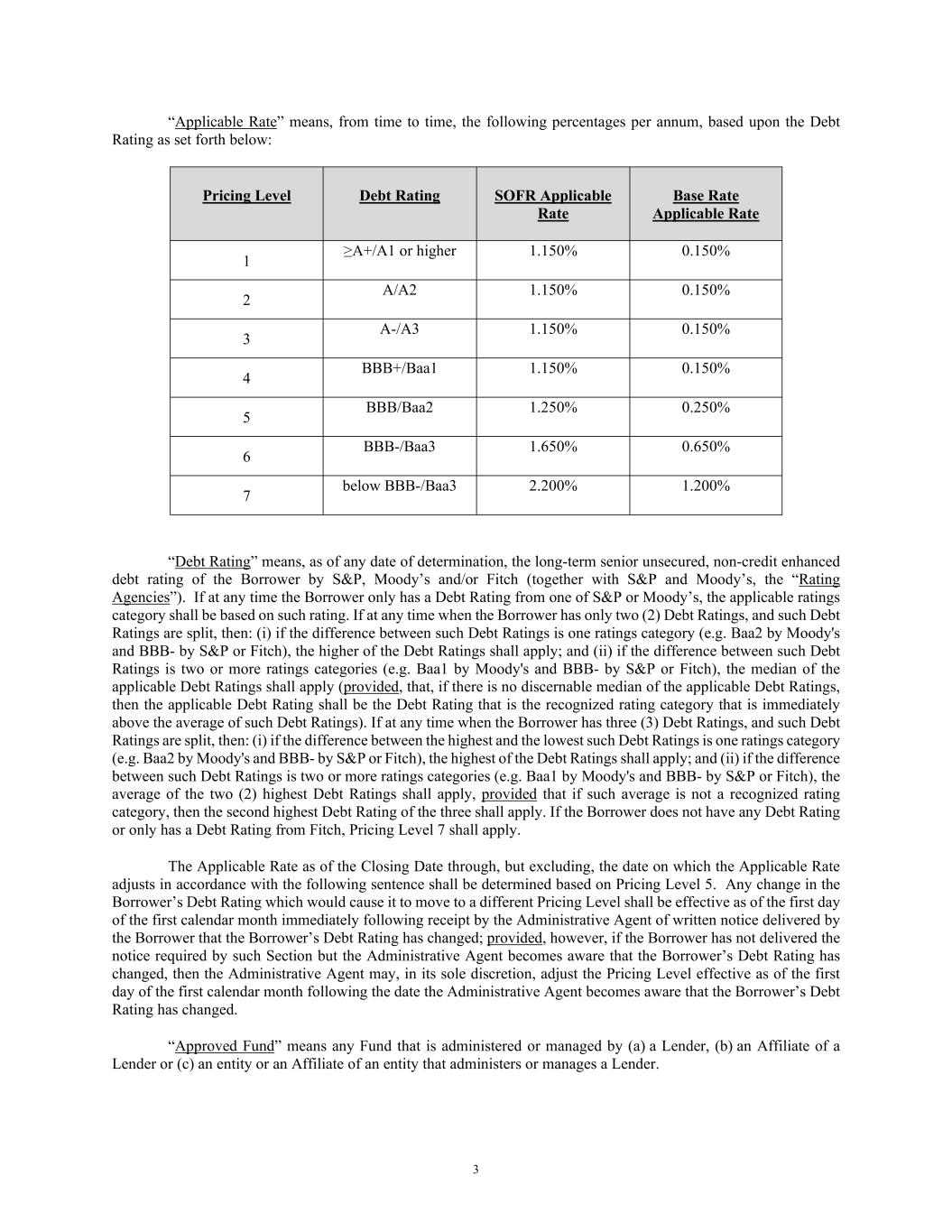 3 “Applicable Rate” means, from time to time, the following percentages per annum, based upon the Debt Rating as set forth below: Pricing Level Debt Rating SOFR Applicable Rate Base Rate Applicable Rate 1 ≥A+/A1 or higher 1.150% 0.150% 2 A/A2 1.150% 0.150% 3 A-/A3 1.150% 0.150% 4 BBB+/Baa1 1.150% 0.150% 5 BBB/Baa2 1.250% 0.250% 6 BBB-/Baa3 1.650% 0.650% 7 below BBB-/Baa3 2.200% 1.200% “Debt Rating” means, as of any date of determination, the long-term senior unsecured, non-credit enhanced debt rating of the Borrower by S&P, Moody’s and/or Fitch (together with S&P and Moody’s, the “Rating Agencies”). If at any time the Borrower only has a Debt Rating from one of S&P or Moody’s, the applicable ratings category shall be based on such rating. If at any time when the Borrower has only two (2) Debt Ratings, and such Debt Ratings are split, then: (i) if the difference between such Debt Ratings is one ratings category (e.g. Baa2 by Moody's and BBB- by S&P or Fitch), the higher of the Debt Ratings shall apply; and (ii) if the difference between such Debt Ratings is two or more ratings categories (e.g. Baa1 by Moody's and BBB- by S&P or Fitch), the median of the applicable Debt Ratings shall apply (provided, that, if there is no discernable median of the applicable Debt Ratings, then the applicable Debt Rating shall be the Debt Rating that is the recognized rating category that is immediately above the average of such Debt Ratings). If at any time when the Borrower has three (3) Debt Ratings, and such Debt Ratings are split, then: (i) if the difference between the highest and the lowest such Debt Ratings is one ratings category (e.g. Baa2 by Moody's and BBB- by S&P or Fitch), the highest of the Debt Ratings shall apply; and (ii) if the difference between such Debt Ratings is two or more ratings categories (e.g. Baa1 by Moody's and BBB- by S&P or Fitch), the average of the two (2) highest Debt Ratings shall apply, provided that if such average is not a recognized rating category, then the second highest Debt Rating of the three shall apply. If the Borrower does not have any Debt Rating or only has a Debt Rating from Fitch, Pricing Level 7 shall apply. The Applicable Rate as of the Closing Date through, but excluding, the date on which the Applicable Rate adjusts in accordance with the following sentence shall be determined based on Pricing Level 5. Any change in the Borrower’s Debt Rating which would cause it to move to a different Pricing Level shall be effective as of the first day of the first calendar month immediately following receipt by the Administrative Agent of written notice delivered by the Borrower that the Borrower’s Debt Rating has changed; provided, however, if the Borrower has not delivered the notice required by such Section but the Administrative Agent becomes aware that the Borrower’s Debt Rating has changed, then the Administrative Agent may, in its sole discretion, adjust the Pricing Level effective as of the first day of the first calendar month following the date the Administrative Agent becomes aware that the Borrower’s Debt Rating has changed. “Approved Fund” means any Fund that is administered or managed by (a) a Lender, (b) an Affiliate of a Lender or (c) an entity or an Affiliate of an entity that administers or manages a Lender.