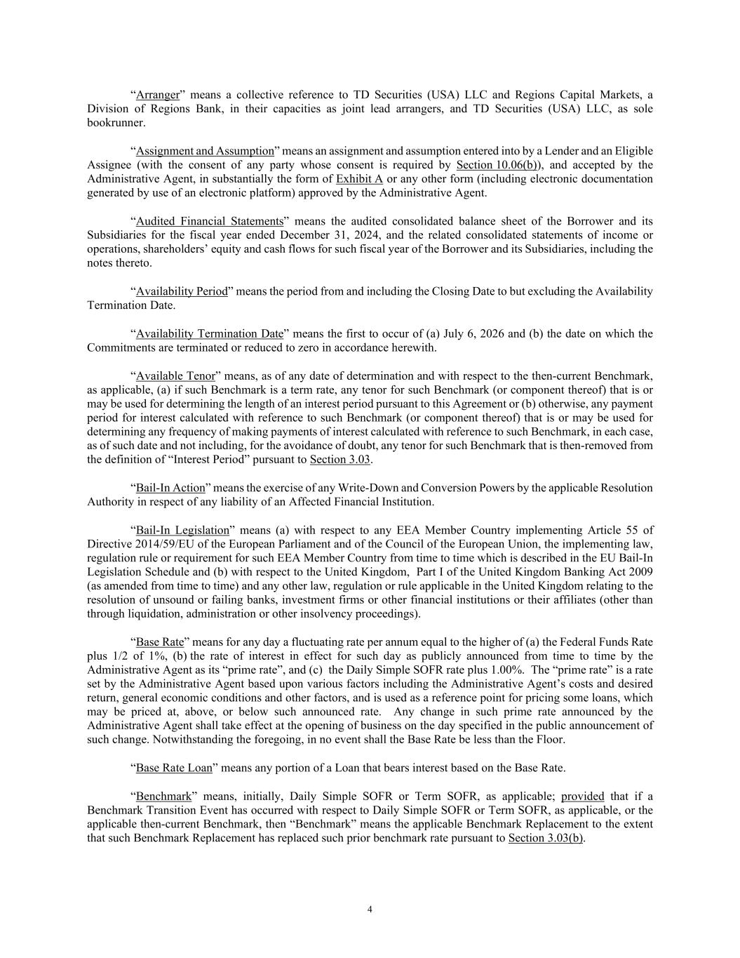 4 “Arranger” means a collective reference to TD Securities (USA) LLC and Regions Capital Markets, a Division of Regions Bank, in their capacities as joint lead arrangers, and TD Securities (USA) LLC, as sole bookrunner. “Assignment and Assumption” means an assignment and assumption entered into by a Lender and an Eligible Assignee (with the consent of any party whose consent is required by Section 10.06(b)), and accepted by the Administrative Agent, in substantially the form of Exhibit A or any other form (including electronic documentation generated by use of an electronic platform) approved by the Administrative Agent. “Audited Financial Statements” means the audited consolidated balance sheet of the Borrower and its Subsidiaries for the fiscal year ended December 31, 2024, and the related consolidated statements of income or operations, shareholders’ equity and cash flows for such fiscal year of the Borrower and its Subsidiaries, including the notes thereto. “Availability Period” means the period from and including the Closing Date to but excluding the Availability Termination Date. “Availability Termination Date” means the first to occur of (a) July 6, 2026 and (b) the date on which the Commitments are terminated or reduced to zero in accordance herewith. “Available Tenor” means, as of any date of determination and with respect to the then-current Benchmark, as applicable, (a) if such Benchmark is a term rate, any tenor for such Benchmark (or component thereof) that is or may be used for determining the length of an interest period pursuant to this Agreement or (b) otherwise, any payment period for interest calculated with reference to such Benchmark (or component thereof) that is or may be used for determining any frequency of making payments of interest calculated with reference to such Benchmark, in each case, as of such date and not including, for the avoidance of doubt, any tenor for such Benchmark that is then-removed from the definition of “Interest Period” pursuant to Section 3.03. “Bail-In Action” means the exercise of any Write-Down and Conversion Powers by the applicable Resolution Authority in respect of any liability of an Affected Financial Institution. “Bail-In Legislation” means (a) with respect to any EEA Member Country implementing Article 55 of Directive 2014/59/EU of the European Parliament and of the Council of the European Union, the implementing law, regulation rule or requirement for such EEA Member Country from time to time which is described in the EU Bail-In Legislation Schedule and (b) with respect to the United Kingdom, Part I of the United Kingdom Banking Act 2009 (as amended from time to time) and any other law, regulation or rule applicable in the United Kingdom relating to the resolution of unsound or failing banks, investment firms or other financial institutions or their affiliates (other than through liquidation, administration or other insolvency proceedings). “Base Rate” means for any day a fluctuating rate per annum equal to the higher of (a) the Federal Funds Rate plus 1/2 of 1%, (b) the rate of interest in effect for such day as publicly announced from time to time by the Administrative Agent as its “prime rate”, and (c) the Daily Simple SOFR rate plus 1.00%. The “prime rate” is a rate set by the Administrative Agent based upon various factors including the Administrative Agent’s costs and desired return, general economic conditions and other factors, and is used as a reference point for pricing some loans, which may be priced at, above, or below such announced rate. Any change in such prime rate announced by the Administrative Agent shall take effect at the opening of business on the day specified in the public announcement of such change. Notwithstanding the foregoing, in no event shall the Base Rate be less than the Floor. “Base Rate Loan” means any portion of a Loan that bears interest based on the Base Rate. “Benchmark” means, initially, Daily Simple SOFR or Term SOFR, as applicable; provided that if a Benchmark Transition Event has occurred with respect to Daily Simple SOFR or Term SOFR, as applicable, or the applicable then-current Benchmark, then “Benchmark” means the applicable Benchmark Replacement to the extent that such Benchmark Replacement has replaced such prior benchmark rate pursuant to Section 3.03(b).