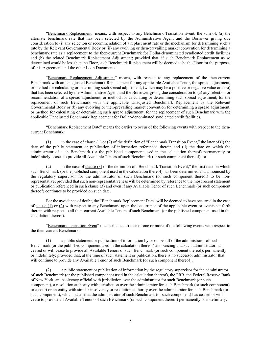 5 “Benchmark Replacement” means, with respect to any Benchmark Transition Event, the sum of: (a) the alternate benchmark rate that has been selected by the Administrative Agent and the Borrower giving due consideration to (i) any selection or recommendation of a replacement rate or the mechanism for determining such a rate by the Relevant Governmental Body or (ii) any evolving or then-prevailing market convention for determining a benchmark rate as a replacement to the then-current Benchmark for Dollar-denominated syndicated credit facilities and (b) the related Benchmark Replacement Adjustment; provided that, if such Benchmark Replacement as so determined would be less than the Floor, such Benchmark Replacement will be deemed to be the Floor for the purposes of this Agreement and the other Loan Documents. “Benchmark Replacement Adjustment” means, with respect to any replacement of the then-current Benchmark with an Unadjusted Benchmark Replacement for any applicable Available Tenor, the spread adjustment, or method for calculating or determining such spread adjustment, (which may be a positive or negative value or zero) that has been selected by the Administrative Agent and the Borrower giving due consideration to (a) any selection or recommendation of a spread adjustment, or method for calculating or determining such spread adjustment, for the replacement of such Benchmark with the applicable Unadjusted Benchmark Replacement by the Relevant Governmental Body or (b) any evolving or then-prevailing market convention for determining a spread adjustment, or method for calculating or determining such spread adjustment, for the replacement of such Benchmark with the applicable Unadjusted Benchmark Replacement for Dollar-denominated syndicated credit facilities. “Benchmark Replacement Date” means the earlier to occur of the following events with respect to the then- current Benchmark: (1) in the case of clause (1) or (2) of the definition of “Benchmark Transition Event,” the later of (i) the date of the public statement or publication of information referenced therein and (ii) the date on which the administrator of such Benchmark (or the published component used in the calculation thereof) permanently or indefinitely ceases to provide all Available Tenors of such Benchmark (or such component thereof); or (2) in the case of clause (3) of the definition of “Benchmark Transition Event,” the first date on which such Benchmark (or the published component used in the calculation thereof) has been determined and announced by the regulatory supervisor for the administrator of such Benchmark (or such component thereof) to be non- representative; provided that such non-representativeness will be determined by reference to the most recent statement or publication referenced in such clause (3) and even if any Available Tenor of such Benchmark (or such component thereof) continues to be provided on such date. For the avoidance of doubt, the “Benchmark Replacement Date” will be deemed to have occurred in the case of clause (1) or (2) with respect to any Benchmark upon the occurrence of the applicable event or events set forth therein with respect to all then-current Available Tenors of such Benchmark (or the published component used in the calculation thereof). “Benchmark Transition Event” means the occurrence of one or more of the following events with respect to the then-current Benchmark: (1) a public statement or publication of information by or on behalf of the administrator of such Benchmark (or the published component used in the calculation thereof) announcing that such administrator has ceased or will cease to provide all Available Tenors of such Benchmark (or such component thereof), permanently or indefinitely; provided that, at the time of such statement or publication, there is no successor administrator that will continue to provide any Available Tenor of such Benchmark (or such component thereof); (2) a public statement or publication of information by the regulatory supervisor for the administrator of such Benchmark (or the published component used in the calculation thereof), the FRB, the Federal Reserve Bank of New York, an insolvency official with jurisdiction over the administrator for such Benchmark (or such component), a resolution authority with jurisdiction over the administrator for such Benchmark (or such component) or a court or an entity with similar insolvency or resolution authority over the administrator for such Benchmark (or such component), which states that the administrator of such Benchmark (or such component) has ceased or will cease to provide all Available Tenors of such Benchmark (or such component thereof) permanently or indefinitely;