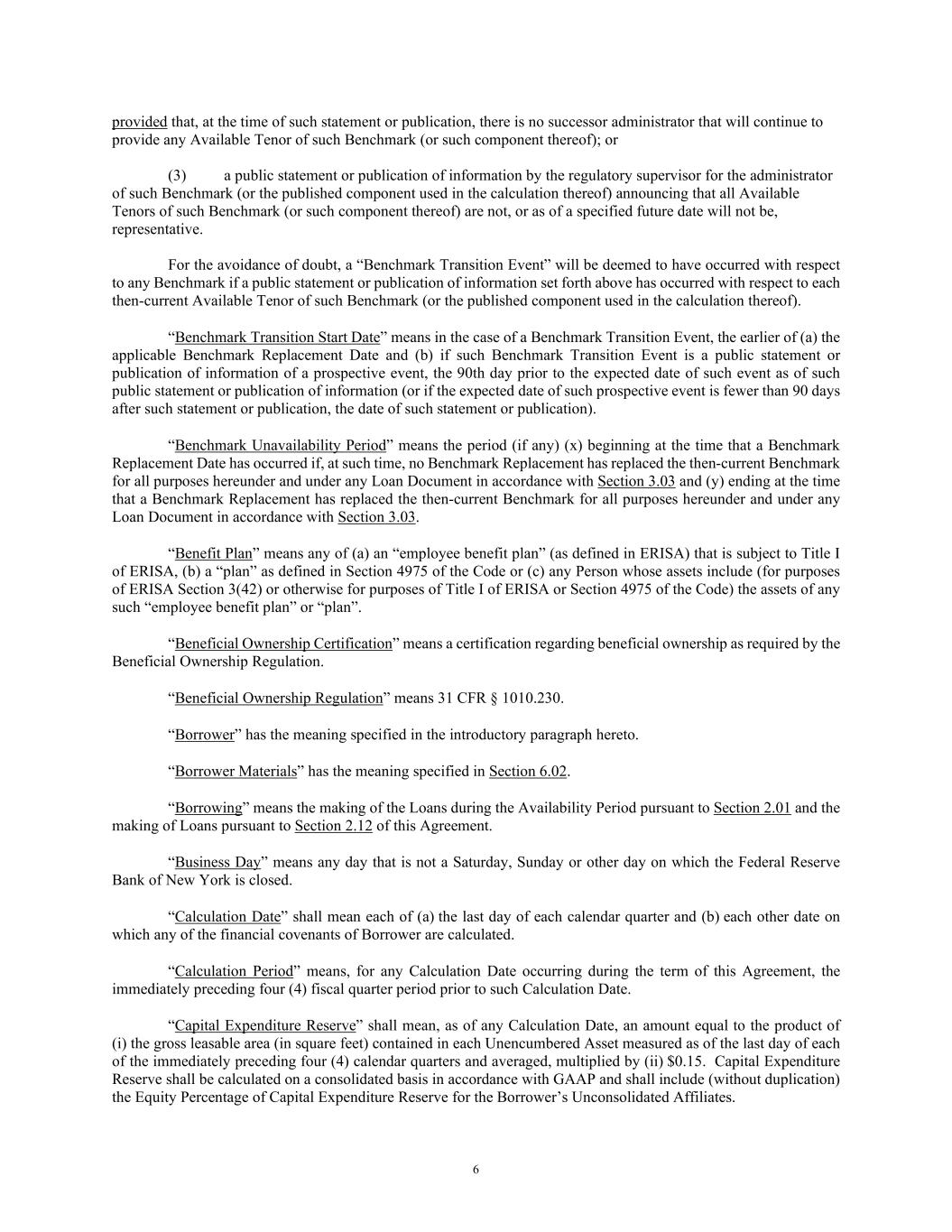 6 provided that, at the time of such statement or publication, there is no successor administrator that will continue to provide any Available Tenor of such Benchmark (or such component thereof); or (3) a public statement or publication of information by the regulatory supervisor for the administrator of such Benchmark (or the published component used in the calculation thereof) announcing that all Available Tenors of such Benchmark (or such component thereof) are not, or as of a specified future date will not be, representative. For the avoidance of doubt, a “Benchmark Transition Event” will be deemed to have occurred with respect to any Benchmark if a public statement or publication of information set forth above has occurred with respect to each then-current Available Tenor of such Benchmark (or the published component used in the calculation thereof). “Benchmark Transition Start Date” means in the case of a Benchmark Transition Event, the earlier of (a) the applicable Benchmark Replacement Date and (b) if such Benchmark Transition Event is a public statement or publication of information of a prospective event, the 90th day prior to the expected date of such event as of such public statement or publication of information (or if the expected date of such prospective event is fewer than 90 days after such statement or publication, the date of such statement or publication). “Benchmark Unavailability Period” means the period (if any) (x) beginning at the time that a Benchmark Replacement Date has occurred if, at such time, no Benchmark Replacement has replaced the then-current Benchmark for all purposes hereunder and under any Loan Document in accordance with Section 3.03 and (y) ending at the time that a Benchmark Replacement has replaced the then-current Benchmark for all purposes hereunder and under any Loan Document in accordance with Section 3.03. “Benefit Plan” means any of (a) an “employee benefit plan” (as defined in ERISA) that is subject to Title I of ERISA, (b) a “plan” as defined in Section 4975 of the Code or (c) any Person whose assets include (for purposes of ERISA Section 3(42) or otherwise for purposes of Title I of ERISA or Section 4975 of the Code) the assets of any such “employee benefit plan” or “plan”. “Beneficial Ownership Certification” means a certification regarding beneficial ownership as required by the Beneficial Ownership Regulation. “Beneficial Ownership Regulation” means 31 CFR § 1010.230. “Borrower” has the meaning specified in the introductory paragraph hereto. “Borrower Materials” has the meaning specified in Section 6.02. “Borrowing” means the making of the Loans during the Availability Period pursuant to Section 2.01 and the making of Loans pursuant to Section 2.12 of this Agreement. “Business Day” means any day that is not a Saturday, Sunday or other day on which the Federal Reserve Bank of New York is closed. “Calculation Date” shall mean each of (a) the last day of each calendar quarter and (b) each other date on which any of the financial covenants of Borrower are calculated. “Calculation Period” means, for any Calculation Date occurring during the term of this Agreement, the immediately preceding four (4) fiscal quarter period prior to such Calculation Date. “Capital Expenditure Reserve” shall mean, as of any Calculation Date, an amount equal to the product of (i) the gross leasable area (in square feet) contained in each Unencumbered Asset measured as of the last day of each of the immediately preceding four (4) calendar quarters and averaged, multiplied by (ii) $0.15. Capital Expenditure Reserve shall be calculated on a consolidated basis in accordance with GAAP and shall include (without duplication) the Equity Percentage of Capital Expenditure Reserve for the Borrower’s Unconsolidated Affiliates.