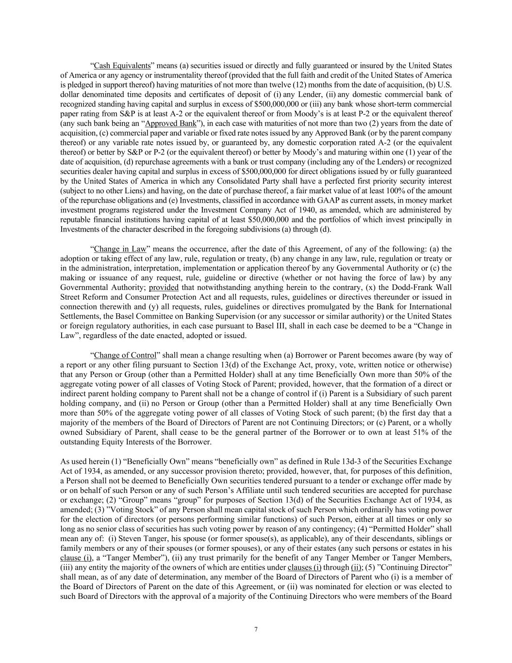 7 “Cash Equivalents” means (a) securities issued or directly and fully guaranteed or insured by the United States of America or any agency or instrumentality thereof (provided that the full faith and credit of the United States of America is pledged in support thereof) having maturities of not more than twelve (12) months from the date of acquisition, (b) U.S. dollar denominated time deposits and certificates of deposit of (i) any Lender, (ii) any domestic commercial bank of recognized standing having capital and surplus in excess of $500,000,000 or (iii) any bank whose short-term commercial paper rating from S&P is at least A-2 or the equivalent thereof or from Moody’s is at least P-2 or the equivalent thereof (any such bank being an “Approved Bank”), in each case with maturities of not more than two (2) years from the date of acquisition, (c) commercial paper and variable or fixed rate notes issued by any Approved Bank (or by the parent company thereof) or any variable rate notes issued by, or guaranteed by, any domestic corporation rated A-2 (or the equivalent thereof) or better by S&P or P-2 (or the equivalent thereof) or better by Moody’s and maturing within one (1) year of the date of acquisition, (d) repurchase agreements with a bank or trust company (including any of the Lenders) or recognized securities dealer having capital and surplus in excess of $500,000,000 for direct obligations issued by or fully guaranteed by the United States of America in which any Consolidated Party shall have a perfected first priority security interest (subject to no other Liens) and having, on the date of purchase thereof, a fair market value of at least 100% of the amount of the repurchase obligations and (e) Investments, classified in accordance with GAAP as current assets, in money market investment programs registered under the Investment Company Act of 1940, as amended, which are administered by reputable financial institutions having capital of at least $50,000,000 and the portfolios of which invest principally in Investments of the character described in the foregoing subdivisions (a) through (d). “Change in Law” means the occurrence, after the date of this Agreement, of any of the following: (a) the adoption or taking effect of any law, rule, regulation or treaty, (b) any change in any law, rule, regulation or treaty or in the administration, interpretation, implementation or application thereof by any Governmental Authority or (c) the making or issuance of any request, rule, guideline or directive (whether or not having the force of law) by any Governmental Authority; provided that notwithstanding anything herein to the contrary, (x) the Dodd-Frank Wall Street Reform and Consumer Protection Act and all requests, rules, guidelines or directives thereunder or issued in connection therewith and (y) all requests, rules, guidelines or directives promulgated by the Bank for International Settlements, the Basel Committee on Banking Supervision (or any successor or similar authority) or the United States or foreign regulatory authorities, in each case pursuant to Basel III, shall in each case be deemed to be a “Change in Law”, regardless of the date enacted, adopted or issued. “Change of Control” shall mean a change resulting when (a) Borrower or Parent becomes aware (by way of a report or any other filing pursuant to Section 13(d) of the Exchange Act, proxy, vote, written notice or otherwise) that any Person or Group (other than a Permitted Holder) shall at any time Beneficially Own more than 50% of the aggregate voting power of all classes of Voting Stock of Parent; provided, however, that the formation of a direct or indirect parent holding company to Parent shall not be a change of control if (i) Parent is a Subsidiary of such parent holding company, and (ii) no Person or Group (other than a Permitted Holder) shall at any time Beneficially Own more than 50% of the aggregate voting power of all classes of Voting Stock of such parent; (b) the first day that a majority of the members of the Board of Directors of Parent are not Continuing Directors; or (c) Parent, or a wholly owned Subsidiary of Parent, shall cease to be the general partner of the Borrower or to own at least 51% of the outstanding Equity Interests of the Borrower. As used herein (1) “Beneficially Own” means “beneficially own” as defined in Rule 13d-3 of the Securities Exchange Act of 1934, as amended, or any successor provision thereto; provided, however, that, for purposes of this definition, a Person shall not be deemed to Beneficially Own securities tendered pursuant to a tender or exchange offer made by or on behalf of such Person or any of such Person’s Affiliate until such tendered securities are accepted for purchase or exchange; (2) “Group” means “group” for purposes of Section 13(d) of the Securities Exchange Act of 1934, as amended; (3) ”Voting Stock” of any Person shall mean capital stock of such Person which ordinarily has voting power for the election of directors (or persons performing similar functions) of such Person, either at all times or only so long as no senior class of securities has such voting power by reason of any contingency; (4) “Permitted Holder” shall mean any of: (i) Steven Tanger, his spouse (or former spouse(s), as applicable), any of their descendants, siblings or family members or any of their spouses (or former spouses), or any of their estates (any such persons or estates in his clause (i), a “Tanger Member”), (ii) any trust primarily for the benefit of any Tanger Member or Tanger Members, (iii) any entity the majority of the owners of which are entities under clauses (i) through (ii); (5) ”Continuing Director” shall mean, as of any date of determination, any member of the Board of Directors of Parent who (i) is a member of the Board of Directors of Parent on the date of this Agreement, or (ii) was nominated for election or was elected t