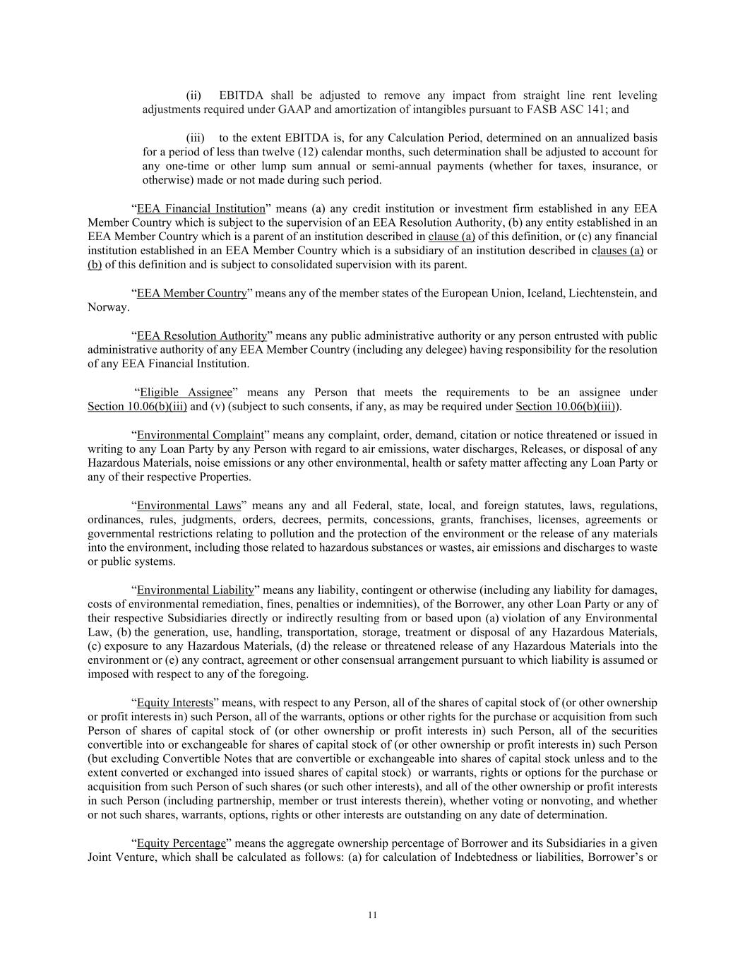 11 (ii) EBITDA shall be adjusted to remove any impact from straight line rent leveling adjustments required under GAAP and amortization of intangibles pursuant to FASB ASC 141; and (iii) to the extent EBITDA is, for any Calculation Period, determined on an annualized basis for a period of less than twelve (12) calendar months, such determination shall be adjusted to account for any one-time or other lump sum annual or semi-annual payments (whether for taxes, insurance, or otherwise) made or not made during such period. “EEA Financial Institution” means (a) any credit institution or investment firm established in any EEA Member Country which is subject to the supervision of an EEA Resolution Authority, (b) any entity established in an EEA Member Country which is a parent of an institution described in clause (a) of this definition, or (c) any financial institution established in an EEA Member Country which is a subsidiary of an institution described in clauses (a) or (b) of this definition and is subject to consolidated supervision with its parent. “EEA Member Country” means any of the member states of the European Union, Iceland, Liechtenstein, and Norway. “EEA Resolution Authority” means any public administrative authority or any person entrusted with public administrative authority of any EEA Member Country (including any delegee) having responsibility for the resolution of any EEA Financial Institution. “Eligible Assignee” means any Person that meets the requirements to be an assignee under Section 10.06(b)(iii) and (v) (subject to such consents, if any, as may be required under Section 10.06(b)(iii)). “Environmental Complaint” means any complaint, order, demand, citation or notice threatened or issued in writing to any Loan Party by any Person with regard to air emissions, water discharges, Releases, or disposal of any Hazardous Materials, noise emissions or any other environmental, health or safety matter affecting any Loan Party or any of their respective Properties. “Environmental Laws” means any and all Federal, state, local, and foreign statutes, laws, regulations, ordinances, rules, judgments, orders, decrees, permits, concessions, grants, franchises, licenses, agreements or governmental restrictions relating to pollution and the protection of the environment or the release of any materials into the environment, including those related to hazardous substances or wastes, air emissions and discharges to waste or public systems. “Environmental Liability” means any liability, contingent or otherwise (including any liability for damages, costs of environmental remediation, fines, penalties or indemnities), of the Borrower, any other Loan Party or any of their respective Subsidiaries directly or indirectly resulting from or based upon (a) violation of any Environmental Law, (b) the generation, use, handling, transportation, storage, treatment or disposal of any Hazardous Materials, (c) exposure to any Hazardous Materials, (d) the release or threatened release of any Hazardous Materials into the environment or (e) any contract, agreement or other consensual arrangement pursuant to which liability is assumed or imposed with respect to any of the foregoing. “Equity Interests” means, with respect to any Person, all of the shares of capital stock of (or other ownership or profit interests in) such Person, all of the warrants, options or other rights for the purchase or acquisition from such Person of shares of capital stock of (or other ownership or profit interests in) such Person, all of the securities convertible into or exchangeable for shares of capital stock of (or other ownership or profit interests in) such Person (but excluding Convertible Notes that are convertible or exchangeable into shares of capital stock unless and to the extent converted or exchanged into issued shares of capital stock) or warrants, rights or options for the purchase or acquisition from such Person of such shares (or such other interests), and all of the other ownership or profit interests in such Person (including partnership, member or trust interests therein), whether voting or nonvoting, and whether or not such shares, warrants, options, rights or other interests are outstanding on any date of determination. “Equity Percentage” means the aggregate ownership percentage of Borrower and its Subsidiaries in a given Joint Venture, which shall be calculated as follows: (a) for calculation of Indebtedness or liabilities, Borrower’s or