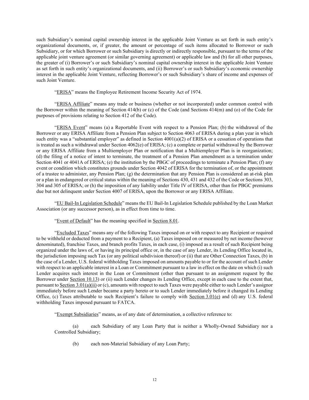12 such Subsidiary’s nominal capital ownership interest in the applicable Joint Venture as set forth in such entity’s organizational documents, or, if greater, the amount or percentage of such items allocated to Borrower or such Subsidiary, or for which Borrower or such Subsidiary is directly or indirectly responsible, pursuant to the terms of the applicable joint venture agreement (or similar governing agreement) or applicable law and (b) for all other purposes, the greater of (i) Borrower’s or such Subsidiary’s nominal capital ownership interest in the applicable Joint Venture as set forth in such entity’s organizational documents, and (ii) Borrower’s or such Subsidiary’s economic ownership interest in the applicable Joint Venture, reflecting Borrower’s or such Subsidiary’s share of income and expenses of such Joint Venture. “ERISA” means the Employee Retirement Income Security Act of 1974. “ERISA Affiliate” means any trade or business (whether or not incorporated) under common control with the Borrower within the meaning of Section 414(b) or (c) of the Code (and Sections 414(m) and (o) of the Code for purposes of provisions relating to Section 412 of the Code). “ERISA Event” means (a) a Reportable Event with respect to a Pension Plan; (b) the withdrawal of the Borrower or any ERISA Affiliate from a Pension Plan subject to Section 4063 of ERISA during a plan year in which such entity was a “substantial employer” as defined in Section 4001(a)(2) of ERISA or a cessation of operations that is treated as such a withdrawal under Section 4062(e) of ERISA; (c) a complete or partial withdrawal by the Borrower or any ERISA Affiliate from a Multiemployer Plan or notification that a Multiemployer Plan is in reorganization; (d) the filing of a notice of intent to terminate, the treatment of a Pension Plan amendment as a termination under Section 4041 or 4041A of ERISA; (e) the institution by the PBGC of proceedings to terminate a Pension Plan; (f) any event or condition which constitutes grounds under Section 4042 of ERISA for the termination of, or the appointment of a trustee to administer, any Pension Plan; (g) the determination that any Pension Plan is considered an at-risk plan or a plan in endangered or critical status within the meaning of Sections 430, 431 and 432 of the Code or Sections 303, 304 and 305 of ERISA; or (h) the imposition of any liability under Title IV of ERISA, other than for PBGC premiums due but not delinquent under Section 4007 of ERISA, upon the Borrower or any ERISA Affiliate. “EU Bail-In Legislation Schedule” means the EU Bail-In Legislation Schedule published by the Loan Market Association (or any successor person), as in effect from time to time. “Event of Default” has the meaning specified in Section 8.01. “Excluded Taxes” means any of the following Taxes imposed on or with respect to any Recipient or required to be withheld or deducted from a payment to a Recipient, (a) Taxes imposed on or measured by net income (however denominated), franchise Taxes, and branch profits Taxes, in each case, (i) imposed as a result of such Recipient being organized under the laws of, or having its principal office or, in the case of any Lender, its Lending Office located in, the jurisdiction imposing such Tax (or any political subdivision thereof) or (ii) that are Other Connection Taxes, (b) in the case of a Lender, U.S. federal withholding Taxes imposed on amounts payable to or for the account of such Lender with respect to an applicable interest in a Loan or Commitment pursuant to a law in effect on the date on which (i) such Lender acquires such interest in the Loan or Commitment (other than pursuant to an assignment request by the Borrower under Section 10.13) or (ii) such Lender changes its Lending Office, except in each case to the extent that, pursuant to Section 3.01(a)(ii) or (c), amounts with respect to such Taxes were payable either to such Lender’s assignor immediately before such Lender became a party hereto or to such Lender immediately before it changed its Lending Office, (c) Taxes attributable to such Recipient’s failure to comply with Section 3.01(e) and (d) any U.S. federal withholding Taxes imposed pursuant to FATCA. “Exempt Subsidiaries” means, as of any date of determination, a collective reference to: (a) each Subsidiary of any Loan Party that is neither a Wholly-Owned Subsidiary nor a Controlled Subsidiary; (b) each non-Material Subsidiary of any Loan Party;