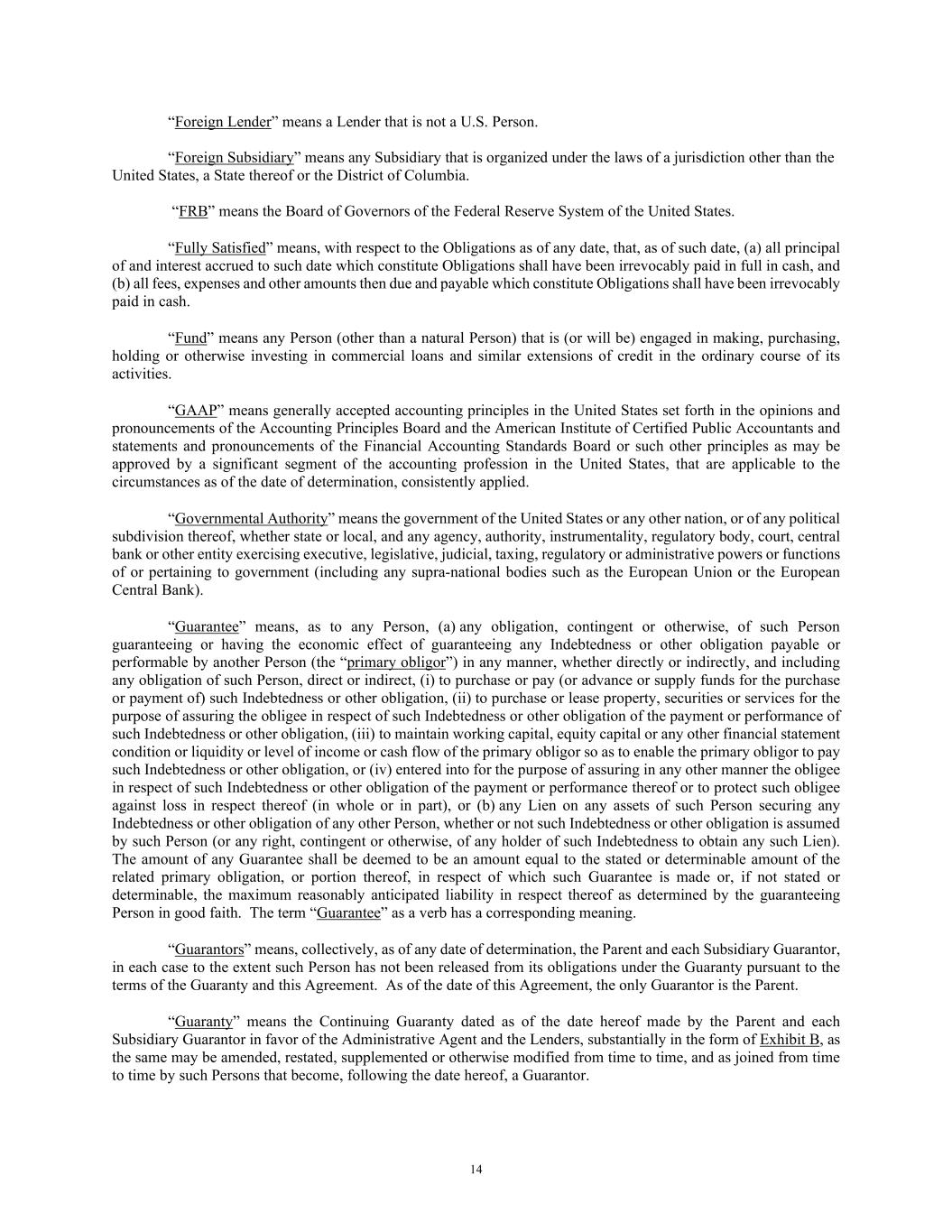 14 “Foreign Lender” means a Lender that is not a U.S. Person. “Foreign Subsidiary” means any Subsidiary that is organized under the laws of a jurisdiction other than the United States, a State thereof or the District of Columbia. “FRB” means the Board of Governors of the Federal Reserve System of the United States. “Fully Satisfied” means, with respect to the Obligations as of any date, that, as of such date, (a) all principal of and interest accrued to such date which constitute Obligations shall have been irrevocably paid in full in cash, and (b) all fees, expenses and other amounts then due and payable which constitute Obligations shall have been irrevocably paid in cash. “Fund” means any Person (other than a natural Person) that is (or will be) engaged in making, purchasing, holding or otherwise investing in commercial loans and similar extensions of credit in the ordinary course of its activities. “GAAP” means generally accepted accounting principles in the United States set forth in the opinions and pronouncements of the Accounting Principles Board and the American Institute of Certified Public Accountants and statements and pronouncements of the Financial Accounting Standards Board or such other principles as may be approved by a significant segment of the accounting profession in the United States, that are applicable to the circumstances as of the date of determination, consistently applied. “Governmental Authority” means the government of the United States or any other nation, or of any political subdivision thereof, whether state or local, and any agency, authority, instrumentality, regulatory body, court, central bank or other entity exercising executive, legislative, judicial, taxing, regulatory or administrative powers or functions of or pertaining to government (including any supra-national bodies such as the European Union or the European Central Bank). “Guarantee” means, as to any Person, (a) any obligation, contingent or otherwise, of such Person guaranteeing or having the economic effect of guaranteeing any Indebtedness or other obligation payable or performable by another Person (the “primary obligor”) in any manner, whether directly or indirectly, and including any obligation of such Person, direct or indirect, (i) to purchase or pay (or advance or supply funds for the purchase or payment of) such Indebtedness or other obligation, (ii) to purchase or lease property, securities or services for the purpose of assuring the obligee in respect of such Indebtedness or other obligation of the payment or performance of such Indebtedness or other obligation, (iii) to maintain working capital, equity capital or any other financial statement condition or liquidity or level of income or cash flow of the primary obligor so as to enable the primary obligor to pay such Indebtedness or other obligation, or (iv) entered into for the purpose of assuring in any other manner the obligee in respect of such Indebtedness or other obligation of the payment or performance thereof or to protect such obligee against loss in respect thereof (in whole or in part), or (b) any Lien on any assets of such Person securing any Indebtedness or other obligation of any other Person, whether or not such Indebtedness or other obligation is assumed by such Person (or any right, contingent or otherwise, of any holder of such Indebtedness to obtain any such Lien). The amount of any Guarantee shall be deemed to be an amount equal to the stated or determinable amount of the related primary obligation, or portion thereof, in respect of which such Guarantee is made or, if not stated or determinable, the maximum reasonably anticipated liability in respect thereof as determined by the guaranteeing Person in good faith. The term “Guarantee” as a verb has a corresponding meaning. “Guarantors” means, collectively, as of any date of determination, the Parent and each Subsidiary Guarantor, in each case to the extent such Person has not been released from its obligations under the Guaranty pursuant to the terms of the Guaranty and this Agreement. As of the date of this Agreement, the only Guarantor is the Parent. “Guaranty” means the Continuing Guaranty dated as of the date hereof made by the Parent and each Subsidiary Guarantor in favor of the Administrative Agent and the Lenders, substantially in the form of Exhibit B, as the same may be amended, restated, supplemented or otherwise modified from time to time, and as joined from time to time by such Persons that become, following the date hereof, a Guarantor.