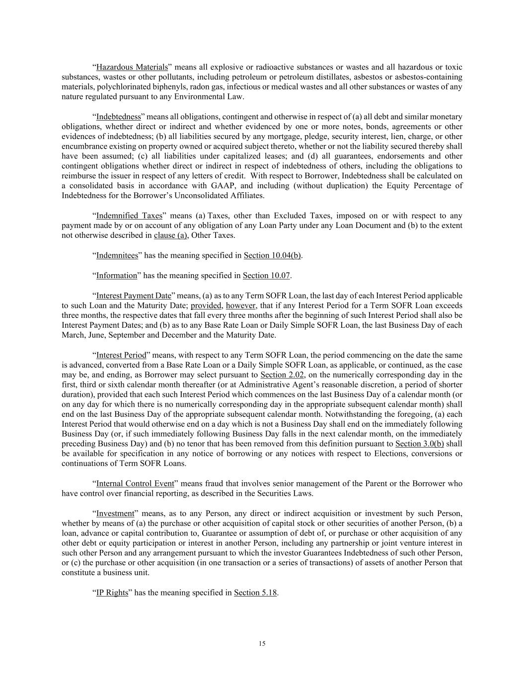 15 “Hazardous Materials” means all explosive or radioactive substances or wastes and all hazardous or toxic substances, wastes or other pollutants, including petroleum or petroleum distillates, asbestos or asbestos-containing materials, polychlorinated biphenyls, radon gas, infectious or medical wastes and all other substances or wastes of any nature regulated pursuant to any Environmental Law. “Indebtedness” means all obligations, contingent and otherwise in respect of (a) all debt and similar monetary obligations, whether direct or indirect and whether evidenced by one or more notes, bonds, agreements or other evidences of indebtedness; (b) all liabilities secured by any mortgage, pledge, security interest, lien, charge, or other encumbrance existing on property owned or acquired subject thereto, whether or not the liability secured thereby shall have been assumed; (c) all liabilities under capitalized leases; and (d) all guarantees, endorsements and other contingent obligations whether direct or indirect in respect of indebtedness of others, including the obligations to reimburse the issuer in respect of any letters of credit. With respect to Borrower, Indebtedness shall be calculated on a consolidated basis in accordance with GAAP, and including (without duplication) the Equity Percentage of Indebtedness for the Borrower’s Unconsolidated Affiliates. “Indemnified Taxes” means (a) Taxes, other than Excluded Taxes, imposed on or with respect to any payment made by or on account of any obligation of any Loan Party under any Loan Document and (b) to the extent not otherwise described in clause (a), Other Taxes. “Indemnitees” has the meaning specified in Section 10.04(b). “Information” has the meaning specified in Section 10.07. “Interest Payment Date” means, (a) as to any Term SOFR Loan, the last day of each Interest Period applicable to such Loan and the Maturity Date; provided, however, that if any Interest Period for a Term SOFR Loan exceeds three months, the respective dates that fall every three months after the beginning of such Interest Period shall also be Interest Payment Dates; and (b) as to any Base Rate Loan or Daily Simple SOFR Loan, the last Business Day of each March, June, September and December and the Maturity Date. “Interest Period” means, with respect to any Term SOFR Loan, the period commencing on the date the same is advanced, converted from a Base Rate Loan or a Daily Simple SOFR Loan, as applicable, or continued, as the case may be, and ending, as Borrower may select pursuant to Section 2.02, on the numerically corresponding day in the first, third or sixth calendar month thereafter (or at Administrative Agent’s reasonable discretion, a period of shorter duration), provided that each such Interest Period which commences on the last Business Day of a calendar month (or on any day for which there is no numerically corresponding day in the appropriate subsequent calendar month) shall end on the last Business Day of the appropriate subsequent calendar month. Notwithstanding the foregoing, (a) each Interest Period that would otherwise end on a day which is not a Business Day shall end on the immediately following Business Day (or, if such immediately following Business Day falls in the next calendar month, on the immediately preceding Business Day) and (b) no tenor that has been removed from this definition pursuant to Section 3.0(b) shall be available for specification in any notice of borrowing or any notices with respect to Elections, conversions or continuations of Term SOFR Loans. “Internal Control Event” means fraud that involves senior management of the Parent or the Borrower who have control over financial reporting, as described in the Securities Laws. “Investment” means, as to any Person, any direct or indirect acquisition or investment by such Person, whether by means of (a) the purchase or other acquisition of capital stock or other securities of another Person, (b) a loan, advance or capital contribution to, Guarantee or assumption of debt of, or purchase or other acquisition of any other debt or equity participation or interest in another Person, including any partnership or joint venture interest in such other Person and any arrangement pursuant to which the investor Guarantees Indebtedness of such other Person, or (c) the purchase or other acquisition (in one transaction or a series of transactions) of assets of another Person that constitute a business unit. “IP Rights” has the meaning specified in Section 5.18.