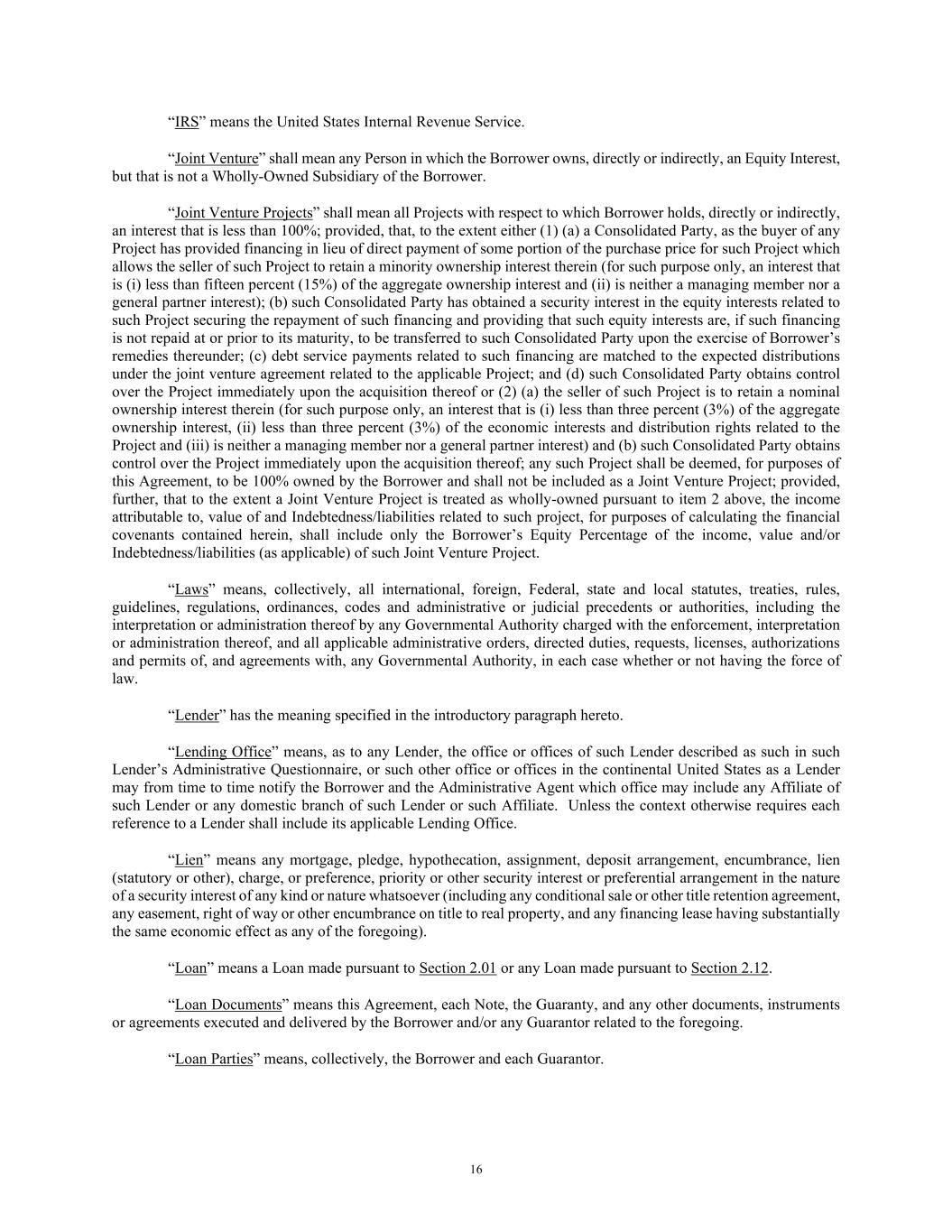 16 “IRS” means the United States Internal Revenue Service. “Joint Venture” shall mean any Person in which the Borrower owns, directly or indirectly, an Equity Interest, but that is not a Wholly-Owned Subsidiary of the Borrower. “Joint Venture Projects” shall mean all Projects with respect to which Borrower holds, directly or indirectly, an interest that is less than 100%; provided, that, to the extent either (1) (a) a Consolidated Party, as the buyer of any Project has provided financing in lieu of direct payment of some portion of the purchase price for such Project which allows the seller of such Project to retain a minority ownership interest therein (for such purpose only, an interest that is (i) less than fifteen percent (15%) of the aggregate ownership interest and (ii) is neither a managing member nor a general partner interest); (b) such Consolidated Party has obtained a security interest in the equity interests related to such Project securing the repayment of such financing and providing that such equity interests are, if such financing is not repaid at or prior to its maturity, to be transferred to such Consolidated Party upon the exercise of Borrower’s remedies thereunder; (c) debt service payments related to such financing are matched to the expected distributions under the joint venture agreement related to the applicable Project; and (d) such Consolidated Party obtains control over the Project immediately upon the acquisition thereof or (2) (a) the seller of such Project is to retain a nominal ownership interest therein (for such purpose only, an interest that is (i) less than three percent (3%) of the aggregate ownership interest, (ii) less than three percent (3%) of the economic interests and distribution rights related to the Project and (iii) is neither a managing member nor a general partner interest) and (b) such Consolidated Party obtains control over the Project immediately upon the acquisition thereof; any such Project shall be deemed, for purposes of this Agreement, to be 100% owned by the Borrower and shall not be included as a Joint Venture Project; provided, further, that to the extent a Joint Venture Project is treated as wholly-owned pursuant to item 2 above, the income attributable to, value of and Indebtedness/liabilities related to such project, for purposes of calculating the financial covenants contained herein, shall include only the Borrower’s Equity Percentage of the income, value and/or Indebtedness/liabilities (as applicable) of such Joint Venture Project. “Laws” means, collectively, all international, foreign, Federal, state and local statutes, treaties, rules, guidelines, regulations, ordinances, codes and administrative or judicial precedents or authorities, including the interpretation or administration thereof by any Governmental Authority charged with the enforcement, interpretation or administration thereof, and all applicable administrative orders, directed duties, requests, licenses, authorizations and permits of, and agreements with, any Governmental Authority, in each case whether or not having the force of law. “Lender” has the meaning specified in the introductory paragraph hereto. “Lending Office” means, as to any Lender, the office or offices of such Lender described as such in such Lender’s Administrative Questionnaire, or such other office or offices in the continental United States as a Lender may from time to time notify the Borrower and the Administrative Agent which office may include any Affiliate of such Lender or any domestic branch of such Lender or such Affiliate. Unless the context otherwise requires each reference to a Lender shall include its applicable Lending Office. “Lien” means any mortgage, pledge, hypothecation, assignment, deposit arrangement, encumbrance, lien (statutory or other), charge, or preference, priority or other security interest or preferential arrangement in the nature of a security interest of any kind or nature whatsoever (including any conditional sale or other title retention agreement, any easement, right of way or other encumbrance on title to real property, and any financing lease having substantially the same economic effect as any of the foregoing). “Loan” means a Loan made pursuant to Section 2.01 or any Loan made pursuant to Section 2.12. “Loan Documents” means this Agreement, each Note, the Guaranty, and any other documents, instruments or agreements executed and delivered by the Borrower and/or any Guarantor related to the foregoing. “Loan Parties” means, collectively, the Borrower and each Guarantor.