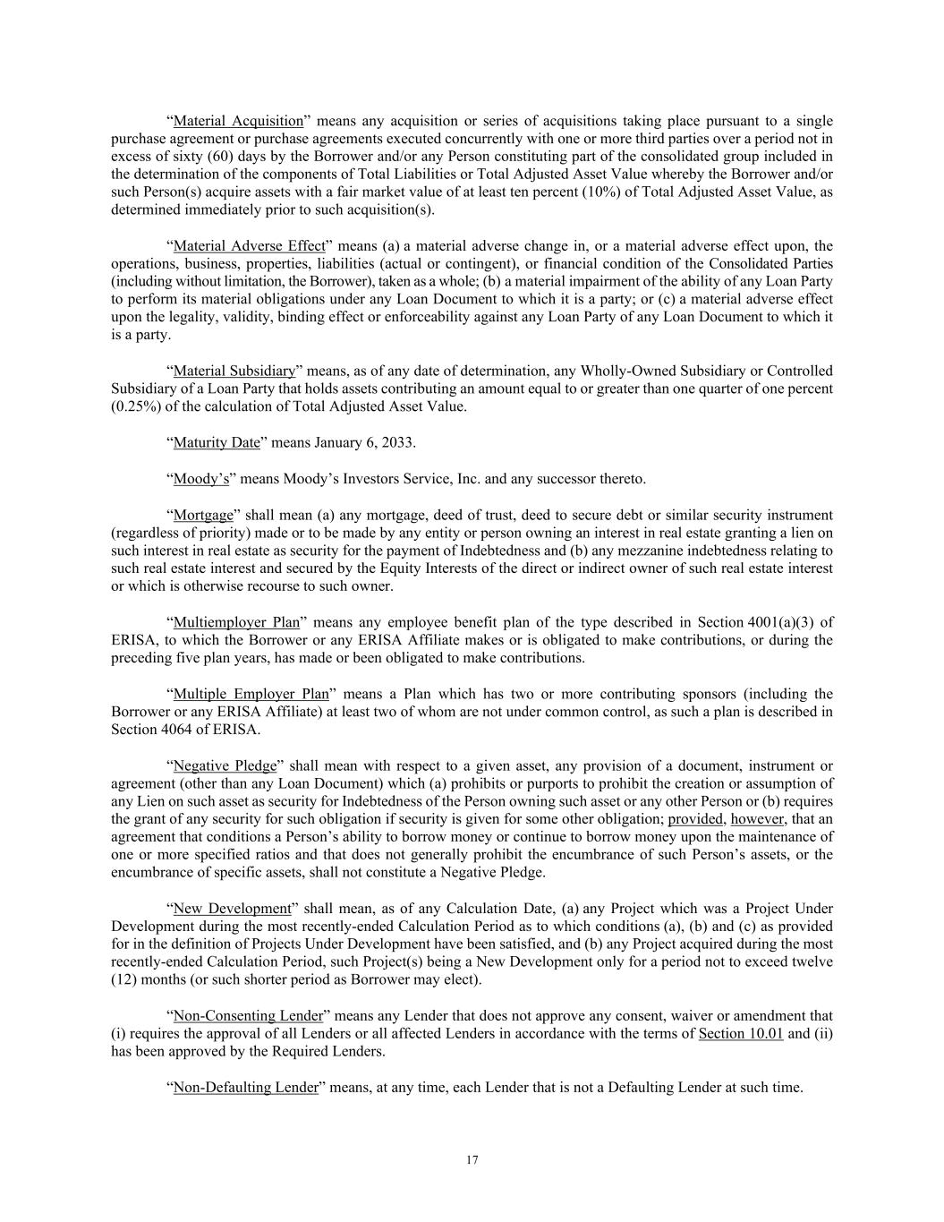 17 “Material Acquisition” means any acquisition or series of acquisitions taking place pursuant to a single purchase agreement or purchase agreements executed concurrently with one or more third parties over a period not in excess of sixty (60) days by the Borrower and/or any Person constituting part of the consolidated group included in the determination of the components of Total Liabilities or Total Adjusted Asset Value whereby the Borrower and/or such Person(s) acquire assets with a fair market value of at least ten percent (10%) of Total Adjusted Asset Value, as determined immediately prior to such acquisition(s). “Material Adverse Effect” means (a) a material adverse change in, or a material adverse effect upon, the operations, business, properties, liabilities (actual or contingent), or financial condition of the Consolidated Parties (including without limitation, the Borrower), taken as a whole; (b) a material impairment of the ability of any Loan Party to perform its material obligations under any Loan Document to which it is a party; or (c) a material adverse effect upon the legality, validity, binding effect or enforceability against any Loan Party of any Loan Document to which it is a party. “Material Subsidiary” means, as of any date of determination, any Wholly-Owned Subsidiary or Controlled Subsidiary of a Loan Party that holds assets contributing an amount equal to or greater than one quarter of one percent (0.25%) of the calculation of Total Adjusted Asset Value. “Maturity Date” means January 6, 2033. “Moody’s” means Moody’s Investors Service, Inc. and any successor thereto. “Mortgage” shall mean (a) any mortgage, deed of trust, deed to secure debt or similar security instrument (regardless of priority) made or to be made by any entity or person owning an interest in real estate granting a lien on such interest in real estate as security for the payment of Indebtedness and (b) any mezzanine indebtedness relating to such real estate interest and secured by the Equity Interests of the direct or indirect owner of such real estate interest or which is otherwise recourse to such owner. “Multiemployer Plan” means any employee benefit plan of the type described in Section 4001(a)(3) of ERISA, to which the Borrower or any ERISA Affiliate makes or is obligated to make contributions, or during the preceding five plan years, has made or been obligated to make contributions. “Multiple Employer Plan” means a Plan which has two or more contributing sponsors (including the Borrower or any ERISA Affiliate) at least two of whom are not under common control, as such a plan is described in Section 4064 of ERISA. “Negative Pledge” shall mean with respect to a given asset, any provision of a document, instrument or agreement (other than any Loan Document) which (a) prohibits or purports to prohibit the creation or assumption of any Lien on such asset as security for Indebtedness of the Person owning such asset or any other Person or (b) requires the grant of any security for such obligation if security is given for some other obligation; provided, however, that an agreement that conditions a Person’s ability to borrow money or continue to borrow money upon the maintenance of one or more specified ratios and that does not generally prohibit the encumbrance of such Person’s assets, or the encumbrance of specific assets, shall not constitute a Negative Pledge. “New Development” shall mean, as of any Calculation Date, (a) any Project which was a Project Under Development during the most recently-ended Calculation Period as to which conditions (a), (b) and (c) as provided for in the definition of Projects Under Development have been satisfied, and (b) any Project acquired during the most recently-ended Calculation Period, such Project(s) being a New Development only for a period not to exceed twelve (12) months (or such shorter period as Borrower may elect). “Non-Consenting Lender” means any Lender that does not approve any consent, waiver or amendment that (i) requires the approval of all Lenders or all affected Lenders in accordance with the terms of Section 10.01 and (ii) has been approved by the Required Lenders. “Non-Defaulting Lender” means, at any time, each Lender that is not a Defaulting Lender at such time.