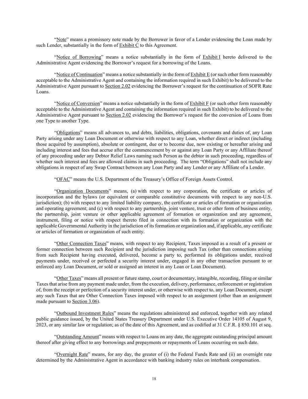 18 “Note” means a promissory note made by the Borrower in favor of a Lender evidencing the Loan made by such Lender, substantially in the form of Exhibit C to this Agreement. “Notice of Borrowing” means a notice substantially in the form of Exhibit I hereto delivered to the Administrative Agent evidencing the Borrower’s request for a borrowing of the Loans. “Notice of Continuation” means a notice substantially in the form of Exhibit E (or such other form reasonably acceptable to the Administrative Agent and containing the information required in such Exhibit) to be delivered to the Administrative Agent pursuant to Section 2.02 evidencing the Borrower’s request for the continuation of SOFR Rate Loans. “Notice of Conversion” means a notice substantially in the form of Exhibit F (or such other form reasonably acceptable to the Administrative Agent and containing the information required in such Exhibit) to be delivered to the Administrative Agent pursuant to Section 2.02 evidencing the Borrower’s request for the conversion of Loans from one Type to another Type. “Obligations” means all advances to, and debts, liabilities, obligations, covenants and duties of, any Loan Party arising under any Loan Document or otherwise with respect to any Loan, whether direct or indirect (including those acquired by assumption), absolute or contingent, due or to become due, now existing or hereafter arising and including interest and fees that accrue after the commencement by or against any Loan Party or any Affiliate thereof of any proceeding under any Debtor Relief Laws naming such Person as the debtor in such proceeding, regardless of whether such interest and fees are allowed claims in such proceeding. The term “Obligations” shall not include any obligations in respect of any Swap Contract between any Loan Party and any Lender or any Affiliate of a Lender. “OFAC” means the U.S. Department of the Treasury’s Office of Foreign Assets Control. “Organization Documents” means, (a) with respect to any corporation, the certificate or articles of incorporation and the bylaws (or equivalent or comparable constitutive documents with respect to any non-U.S. jurisdiction); (b) with respect to any limited liability company, the certificate or articles of formation or organization and operating agreement; and (c) with respect to any partnership, joint venture, trust or other form of business entity, the partnership, joint venture or other applicable agreement of formation or organization and any agreement, instrument, filing or notice with respect thereto filed in connection with its formation or organization with the applicable Governmental Authority in the jurisdiction of its formation or organization and, if applicable, any certificate or articles of formation or organization of such entity. “Other Connection Taxes” means, with respect to any Recipient, Taxes imposed as a result of a present or former connection between such Recipient and the jurisdiction imposing such Tax (other than connections arising from such Recipient having executed, delivered, become a party to, performed its obligations under, received payments under, received or perfected a security interest under, engaged in any other transaction pursuant to or enforced any Loan Document, or sold or assigned an interest in any Loan or Loan Document). “Other Taxes” means all present or future stamp, court or documentary, intangible, recording, filing or similar Taxes that arise from any payment made under, from the execution, delivery, performance, enforcement or registration of, from the receipt or perfection of a security interest under, or otherwise with respect to, any Loan Document, except any such Taxes that are Other Connection Taxes imposed with respect to an assignment (other than an assignment made pursuant to Section 3.06). “Outbound Investment Rules” means the regulations administered and enforced, together with any related public guidance issued, by the United States Treasury Department under U.S. Executive Order 14105 of August 9, 2023, or any similar law or regulation; as of the date of this Agreement, and as codified at 31 C.F.R. § 850.101 et seq. “Outstanding Amount” means with respect to Loans on any date, the aggregate outstanding principal amount thereof after giving effect to any borrowings and prepayments or repayments of Loans occurring on such date. “Overnight Rate” means, for any day, the greater of (i) the Federal Funds Rate and (ii) an overnight rate determined by the Administrative Agent in accordance with banking industry rules on interbank compensation.