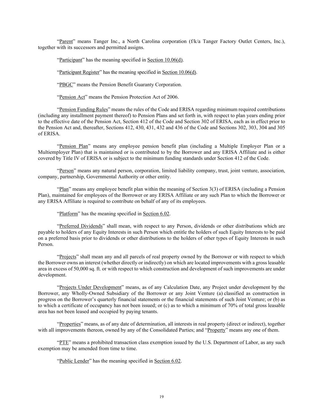 19 “Parent” means Tanger Inc., a North Carolina corporation (f/k/a Tanger Factory Outlet Centers, Inc.), together with its successors and permitted assigns. “Participant” has the meaning specified in Section 10.06(d). “Participant Register” has the meaning specified in Section 10.06(d). “PBGC” means the Pension Benefit Guaranty Corporation. “Pension Act” means the Pension Protection Act of 2006. “Pension Funding Rules” means the rules of the Code and ERISA regarding minimum required contributions (including any installment payment thereof) to Pension Plans and set forth in, with respect to plan years ending prior to the effective date of the Pension Act, Section 412 of the Code and Section 302 of ERISA, each as in effect prior to the Pension Act and, thereafter, Sections 412, 430, 431, 432 and 436 of the Code and Sections 302, 303, 304 and 305 of ERISA. “Pension Plan” means any employee pension benefit plan (including a Multiple Employer Plan or a Multiemployer Plan) that is maintained or is contributed to by the Borrower and any ERISA Affiliate and is either covered by Title IV of ERISA or is subject to the minimum funding standards under Section 412 of the Code. “Person” means any natural person, corporation, limited liability company, trust, joint venture, association, company, partnership, Governmental Authority or other entity. “Plan” means any employee benefit plan within the meaning of Section 3(3) of ERISA (including a Pension Plan), maintained for employees of the Borrower or any ERISA Affiliate or any such Plan to which the Borrower or any ERISA Affiliate is required to contribute on behalf of any of its employees. “Platform” has the meaning specified in Section 6.02. “Preferred Dividends” shall mean, with respect to any Person, dividends or other distributions which are payable to holders of any Equity Interests in such Person which entitle the holders of such Equity Interests to be paid on a preferred basis prior to dividends or other distributions to the holders of other types of Equity Interests in such Person. “Projects” shall mean any and all parcels of real property owned by the Borrower or with respect to which the Borrower owns an interest (whether directly or indirectly) on which are located improvements with a gross leasable area in excess of 50,000 sq. ft. or with respect to which construction and development of such improvements are under development. “Projects Under Development” means, as of any Calculation Date, any Project under development by the Borrower, any Wholly-Owned Subsidiary of the Borrower or any Joint Venture (a) classified as construction in progress on the Borrower’s quarterly financial statements or the financial statements of such Joint Venture; or (b) as to which a certificate of occupancy has not been issued; or (c) as to which a minimum of 70% of total gross leasable area has not been leased and occupied by paying tenants. “Properties” means, as of any date of determination, all interests in real property (direct or indirect), together with all improvements thereon, owned by any of the Consolidated Parties; and “Property” means any one of them. “PTE” means a prohibited transaction class exemption issued by the U.S. Department of Labor, as any such exemption may be amended from time to time. “Public Lender” has the meaning specified in Section 6.02.