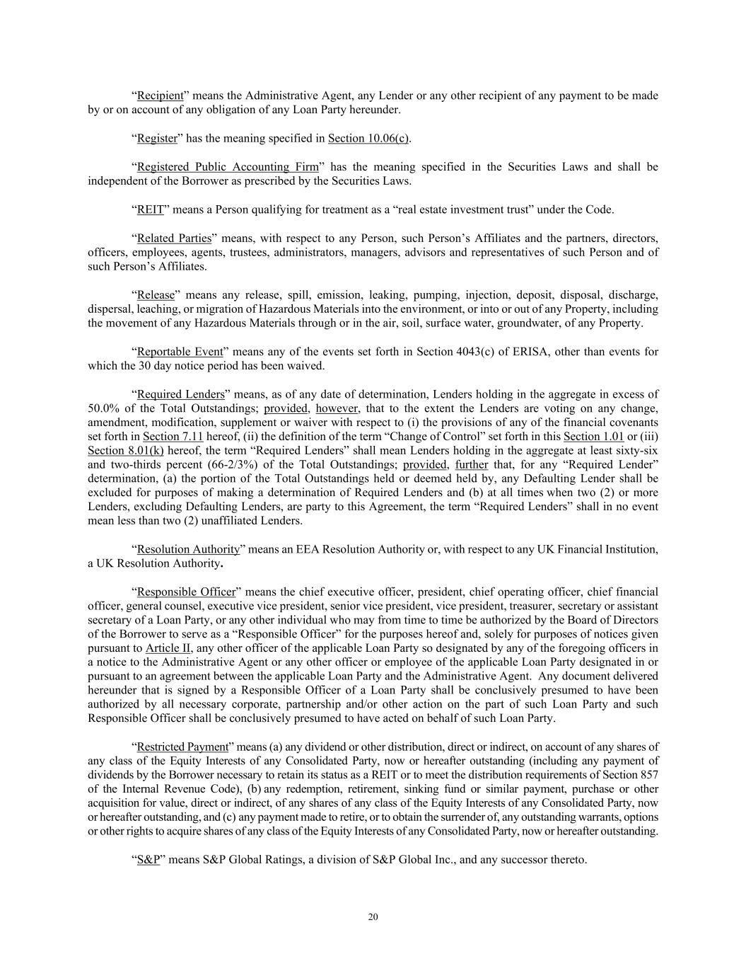 20 “Recipient” means the Administrative Agent, any Lender or any other recipient of any payment to be made by or on account of any obligation of any Loan Party hereunder. “Register” has the meaning specified in Section 10.06(c). “Registered Public Accounting Firm” has the meaning specified in the Securities Laws and shall be independent of the Borrower as prescribed by the Securities Laws. “REIT” means a Person qualifying for treatment as a “real estate investment trust” under the Code. “Related Parties” means, with respect to any Person, such Person’s Affiliates and the partners, directors, officers, employees, agents, trustees, administrators, managers, advisors and representatives of such Person and of such Person’s Affiliates. “Release” means any release, spill, emission, leaking, pumping, injection, deposit, disposal, discharge, dispersal, leaching, or migration of Hazardous Materials into the environment, or into or out of any Property, including the movement of any Hazardous Materials through or in the air, soil, surface water, groundwater, of any Property. “Reportable Event” means any of the events set forth in Section 4043(c) of ERISA, other than events for which the 30 day notice period has been waived. “Required Lenders” means, as of any date of determination, Lenders holding in the aggregate in excess of 50.0% of the Total Outstandings; provided, however, that to the extent the Lenders are voting on any change, amendment, modification, supplement or waiver with respect to (i) the provisions of any of the financial covenants set forth in Section 7.11 hereof, (ii) the definition of the term “Change of Control” set forth in this Section 1.01 or (iii) Section 8.01(k) hereof, the term “Required Lenders” shall mean Lenders holding in the aggregate at least sixty-six and two-thirds percent (66-2/3%) of the Total Outstandings; provided, further that, for any “Required Lender” determination, (a) the portion of the Total Outstandings held or deemed held by, any Defaulting Lender shall be excluded for purposes of making a determination of Required Lenders and (b) at all times when two (2) or more Lenders, excluding Defaulting Lenders, are party to this Agreement, the term “Required Lenders” shall in no event mean less than two (2) unaffiliated Lenders. “Resolution Authority” means an EEA Resolution Authority or, with respect to any UK Financial Institution, a UK Resolution Authority. “Responsible Officer” means the chief executive officer, president, chief operating officer, chief financial officer, general counsel, executive vice president, senior vice president, vice president, treasurer, secretary or assistant secretary of a Loan Party, or any other individual who may from time to time be authorized by the Board of Directors of the Borrower to serve as a “Responsible Officer” for the purposes hereof and, solely for purposes of notices given pursuant to Article II, any other officer of the applicable Loan Party so designated by any of the foregoing officers in a notice to the Administrative Agent or any other officer or employee of the applicable Loan Party designated in or pursuant to an agreement between the applicable Loan Party and the Administrative Agent. Any document delivered hereunder that is signed by a Responsible Officer of a Loan Party shall be conclusively presumed to have been authorized by all necessary corporate, partnership and/or other action on the part of such Loan Party and such Responsible Officer shall be conclusively presumed to have acted on behalf of such Loan Party. “Restricted Payment” means (a) any dividend or other distribution, direct or indirect, on account of any shares of any class of the Equity Interests of any Consolidated Party, now or hereafter outstanding (including any payment of dividends by the Borrower necessary to retain its status as a REIT or to meet the distribution requirements of Section 857 of the Internal Revenue Code), (b) any redemption, retirement, sinking fund or similar payment, purchase or other acquisition for value, direct or indirect, of any shares of any class of the Equity Interests of any Consolidated Party, now or hereafter outstanding, and (c) any payment made to retire, or to obtain the surrender of, any outstanding warrants, options or other rights to acquire shares of any class of the Equity Interests of any Consolidated Party, now or hereafter outstanding. “S&P” means S&P Global Ratings, a division of S&P Global Inc., and any successor thereto.