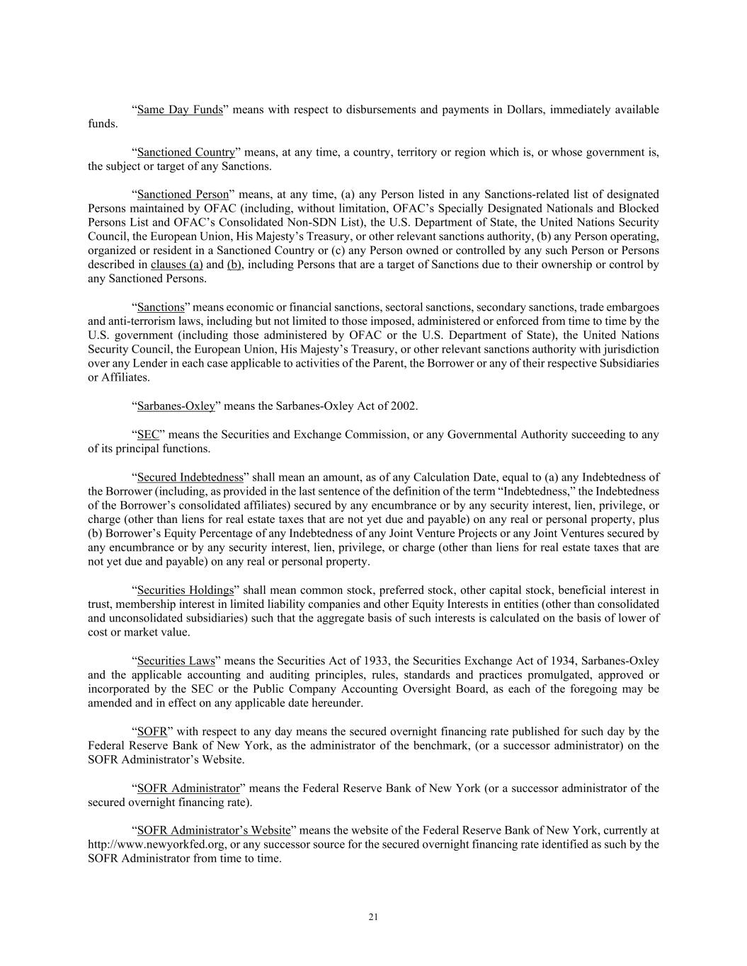 21 “Same Day Funds” means with respect to disbursements and payments in Dollars, immediately available funds. “Sanctioned Country” means, at any time, a country, territory or region which is, or whose government is, the subject or target of any Sanctions. “Sanctioned Person” means, at any time, (a) any Person listed in any Sanctions-related list of designated Persons maintained by OFAC (including, without limitation, OFAC’s Specially Designated Nationals and Blocked Persons List and OFAC’s Consolidated Non-SDN List), the U.S. Department of State, the United Nations Security Council, the European Union, His Majesty’s Treasury, or other relevant sanctions authority, (b) any Person operating, organized or resident in a Sanctioned Country or (c) any Person owned or controlled by any such Person or Persons described in clauses (a) and (b), including Persons that are a target of Sanctions due to their ownership or control by any Sanctioned Persons. “Sanctions” means economic or financial sanctions, sectoral sanctions, secondary sanctions, trade embargoes and anti-terrorism laws, including but not limited to those imposed, administered or enforced from time to time by the U.S. government (including those administered by OFAC or the U.S. Department of State), the United Nations Security Council, the European Union, His Majesty’s Treasury, or other relevant sanctions authority with jurisdiction over any Lender in each case applicable to activities of the Parent, the Borrower or any of their respective Subsidiaries or Affiliates. “Sarbanes-Oxley” means the Sarbanes-Oxley Act of 2002. “SEC” means the Securities and Exchange Commission, or any Governmental Authority succeeding to any of its principal functions. “Secured Indebtedness” shall mean an amount, as of any Calculation Date, equal to (a) any Indebtedness of the Borrower (including, as provided in the last sentence of the definition of the term “Indebtedness,” the Indebtedness of the Borrower’s consolidated affiliates) secured by any encumbrance or by any security interest, lien, privilege, or charge (other than liens for real estate taxes that are not yet due and payable) on any real or personal property, plus (b) Borrower’s Equity Percentage of any Indebtedness of any Joint Venture Projects or any Joint Ventures secured by any encumbrance or by any security interest, lien, privilege, or charge (other than liens for real estate taxes that are not yet due and payable) on any real or personal property. “Securities Holdings” shall mean common stock, preferred stock, other capital stock, beneficial interest in trust, membership interest in limited liability companies and other Equity Interests in entities (other than consolidated and unconsolidated subsidiaries) such that the aggregate basis of such interests is calculated on the basis of lower of cost or market value. “Securities Laws” means the Securities Act of 1933, the Securities Exchange Act of 1934, Sarbanes-Oxley and the applicable accounting and auditing principles, rules, standards and practices promulgated, approved or incorporated by the SEC or the Public Company Accounting Oversight Board, as each of the foregoing may be amended and in effect on any applicable date hereunder. “SOFR” with respect to any day means the secured overnight financing rate published for such day by the Federal Reserve Bank of New York, as the administrator of the benchmark, (or a successor administrator) on the SOFR Administrator’s Website. “SOFR Administrator” means the Federal Reserve Bank of New York (or a successor administrator of the secured overnight financing rate). “SOFR Administrator’s Website” means the website of the Federal Reserve Bank of New York, currently at http://www.newyorkfed.org, or any successor source for the secured overnight financing rate identified as such by the SOFR Administrator from time to time.