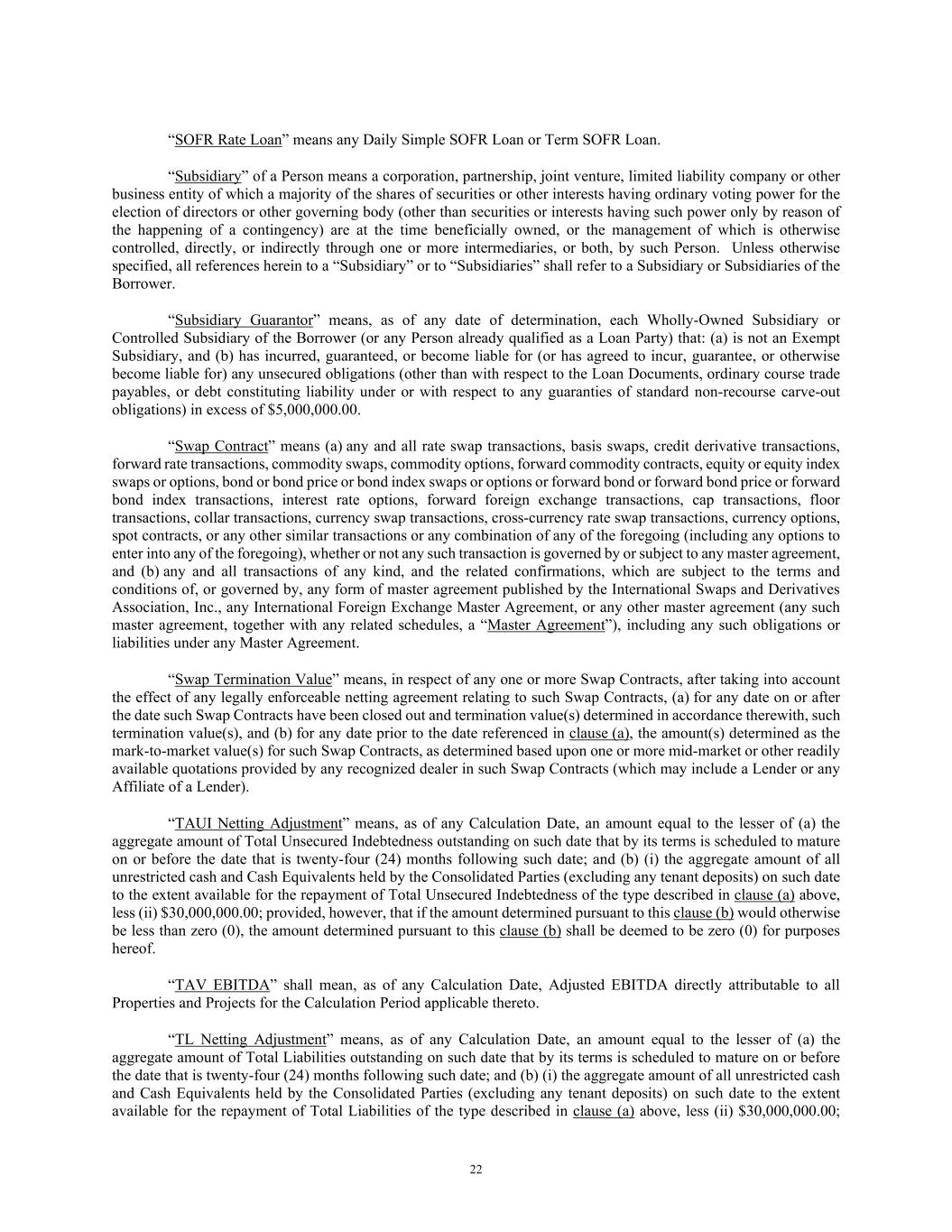 22 “SOFR Rate Loan” means any Daily Simple SOFR Loan or Term SOFR Loan. “Subsidiary” of a Person means a corporation, partnership, joint venture, limited liability company or other business entity of which a majority of the shares of securities or other interests having ordinary voting power for the election of directors or other governing body (other than securities or interests having such power only by reason of the happening of a contingency) are at the time beneficially owned, or the management of which is otherwise controlled, directly, or indirectly through one or more intermediaries, or both, by such Person. Unless otherwise specified, all references herein to a “Subsidiary” or to “Subsidiaries” shall refer to a Subsidiary or Subsidiaries of the Borrower. “Subsidiary Guarantor” means, as of any date of determination, each Wholly-Owned Subsidiary or Controlled Subsidiary of the Borrower (or any Person already qualified as a Loan Party) that: (a) is not an Exempt Subsidiary, and (b) has incurred, guaranteed, or become liable for (or has agreed to incur, guarantee, or otherwise become liable for) any unsecured obligations (other than with respect to the Loan Documents, ordinary course trade payables, or debt constituting liability under or with respect to any guaranties of standard non-recourse carve-out obligations) in excess of $5,000,000.00. “Swap Contract” means (a) any and all rate swap transactions, basis swaps, credit derivative transactions, forward rate transactions, commodity swaps, commodity options, forward commodity contracts, equity or equity index swaps or options, bond or bond price or bond index swaps or options or forward bond or forward bond price or forward bond index transactions, interest rate options, forward foreign exchange transactions, cap transactions, floor transactions, collar transactions, currency swap transactions, cross-currency rate swap transactions, currency options, spot contracts, or any other similar transactions or any combination of any of the foregoing (including any options to enter into any of the foregoing), whether or not any such transaction is governed by or subject to any master agreement, and (b) any and all transactions of any kind, and the related confirmations, which are subject to the terms and conditions of, or governed by, any form of master agreement published by the International Swaps and Derivatives Association, Inc., any International Foreign Exchange Master Agreement, or any other master agreement (any such master agreement, together with any related schedules, a “Master Agreement”), including any such obligations or liabilities under any Master Agreement. “Swap Termination Value” means, in respect of any one or more Swap Contracts, after taking into account the effect of any legally enforceable netting agreement relating to such Swap Contracts, (a) for any date on or after the date such Swap Contracts have been closed out and termination value(s) determined in accordance therewith, such termination value(s), and (b) for any date prior to the date referenced in clause (a), the amount(s) determined as the mark-to-market value(s) for such Swap Contracts, as determined based upon one or more mid-market or other readily available quotations provided by any recognized dealer in such Swap Contracts (which may include a Lender or any Affiliate of a Lender). “TAUI Netting Adjustment” means, as of any Calculation Date, an amount equal to the lesser of (a) the aggregate amount of Total Unsecured Indebtedness outstanding on such date that by its terms is scheduled to mature on or before the date that is twenty-four (24) months following such date; and (b) (i) the aggregate amount of all unrestricted cash and Cash Equivalents held by the Consolidated Parties (excluding any tenant deposits) on such date to the extent available for the repayment of Total Unsecured Indebtedness of the type described in clause (a) above, less (ii) $30,000,000.00; provided, however, that if the amount determined pursuant to this clause (b) would otherwise be less than zero (0), the amount determined pursuant to this clause (b) shall be deemed to be zero (0) for purposes hereof. “TAV EBITDA” shall mean, as of any Calculation Date, Adjusted EBITDA directly attributable to all Properties and Projects for the Calculation Period applicable thereto. “TL Netting Adjustment” means, as of any Calculation Date, an amount equal to the lesser of (a) the aggregate amount of Total Liabilities outstanding on such date that by its terms is scheduled to mature on or before the date that is twenty-four (24) months following such date; and (b) (i) the aggregate amount of all unrestricted cash and Cash Equivalents held by the Consolidated Parties (excluding any tenant deposits) on such date to the extent available for the repayment of Total Liabilities of the type described in clause (a) above, less (ii) $30,000,000.00;