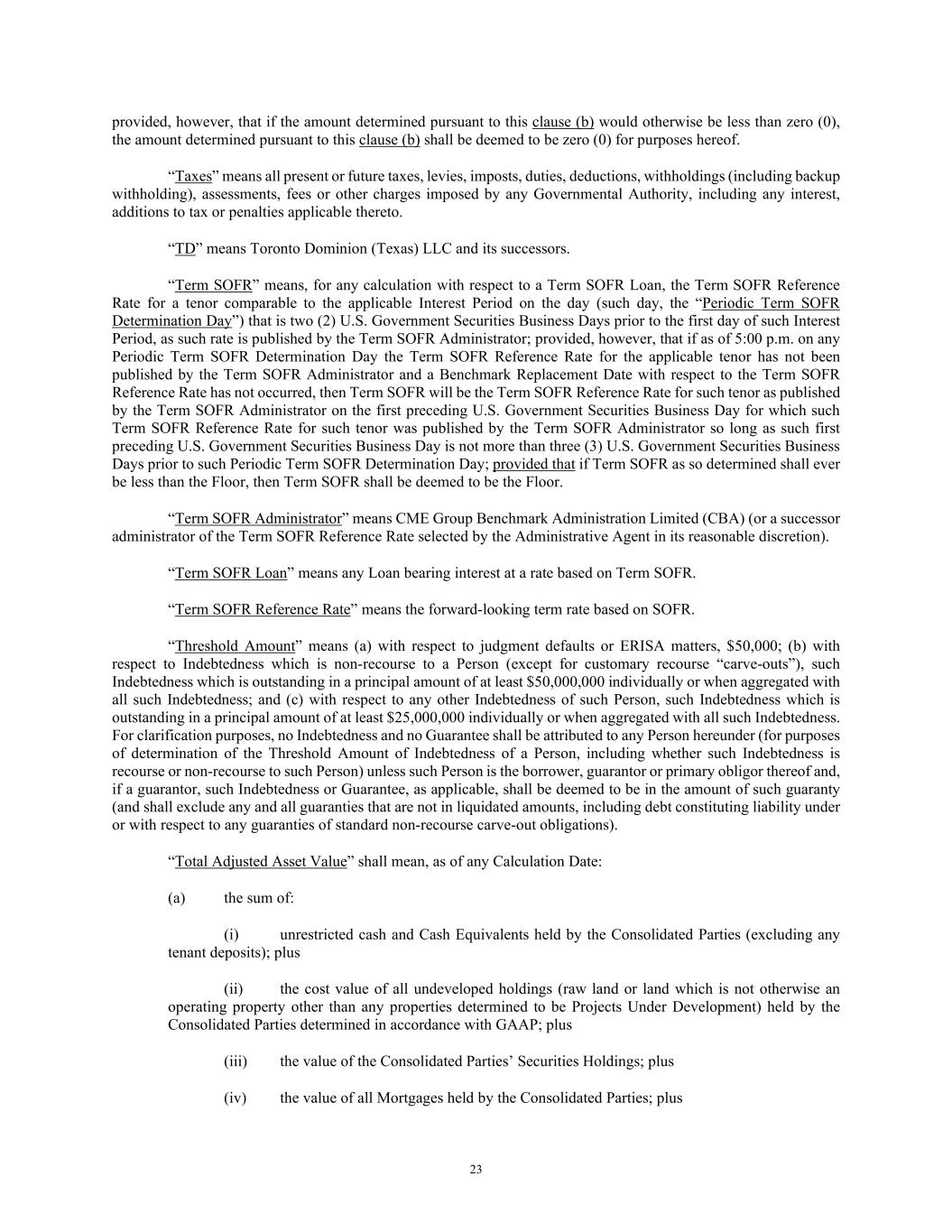 23 provided, however, that if the amount determined pursuant to this clause (b) would otherwise be less than zero (0), the amount determined pursuant to this clause (b) shall be deemed to be zero (0) for purposes hereof. “Taxes” means all present or future taxes, levies, imposts, duties, deductions, withholdings (including backup withholding), assessments, fees or other charges imposed by any Governmental Authority, including any interest, additions to tax or penalties applicable thereto. “TD” means Toronto Dominion (Texas) LLC and its successors. “Term SOFR” means, for any calculation with respect to a Term SOFR Loan, the Term SOFR Reference Rate for a tenor comparable to the applicable Interest Period on the day (such day, the “Periodic Term SOFR Determination Day”) that is two (2) U.S. Government Securities Business Days prior to the first day of such Interest Period, as such rate is published by the Term SOFR Administrator; provided, however, that if as of 5:00 p.m. on any Periodic Term SOFR Determination Day the Term SOFR Reference Rate for the applicable tenor has not been published by the Term SOFR Administrator and a Benchmark Replacement Date with respect to the Term SOFR Reference Rate has not occurred, then Term SOFR will be the Term SOFR Reference Rate for such tenor as published by the Term SOFR Administrator on the first preceding U.S. Government Securities Business Day for which such Term SOFR Reference Rate for such tenor was published by the Term SOFR Administrator so long as such first preceding U.S. Government Securities Business Day is not more than three (3) U.S. Government Securities Business Days prior to such Periodic Term SOFR Determination Day; provided that if Term SOFR as so determined shall ever be less than the Floor, then Term SOFR shall be deemed to be the Floor. “Term SOFR Administrator” means CME Group Benchmark Administration Limited (CBA) (or a successor administrator of the Term SOFR Reference Rate selected by the Administrative Agent in its reasonable discretion). “Term SOFR Loan” means any Loan bearing interest at a rate based on Term SOFR. “Term SOFR Reference Rate” means the forward-looking term rate based on SOFR. “Threshold Amount” means (a) with respect to judgment defaults or ERISA matters, $50,000; (b) with respect to Indebtedness which is non-recourse to a Person (except for customary recourse “carve-outs”), such Indebtedness which is outstanding in a principal amount of at least $50,000,000 individually or when aggregated with all such Indebtedness; and (c) with respect to any other Indebtedness of such Person, such Indebtedness which is outstanding in a principal amount of at least $25,000,000 individually or when aggregated with all such Indebtedness. For clarification purposes, no Indebtedness and no Guarantee shall be attributed to any Person hereunder (for purposes of determination of the Threshold Amount of Indebtedness of a Person, including whether such Indebtedness is recourse or non-recourse to such Person) unless such Person is the borrower, guarantor or primary obligor thereof and, if a guarantor, such Indebtedness or Guarantee, as applicable, shall be deemed to be in the amount of such guaranty (and shall exclude any and all guaranties that are not in liquidated amounts, including debt constituting liability under or with respect to any guaranties of standard non-recourse carve-out obligations). “Total Adjusted Asset Value” shall mean, as of any Calculation Date: (a) the sum of: (i) unrestricted cash and Cash Equivalents held by the Consolidated Parties (excluding any tenant deposits); plus (ii) the cost value of all undeveloped holdings (raw land or land which is not otherwise an operating property other than any properties determined to be Projects Under Development) held by the Consolidated Parties determined in accordance with GAAP; plus (iii) the value of the Consolidated Parties’ Securities Holdings; plus (iv) the value of all Mortgages held by the Consolidated Parties; plus