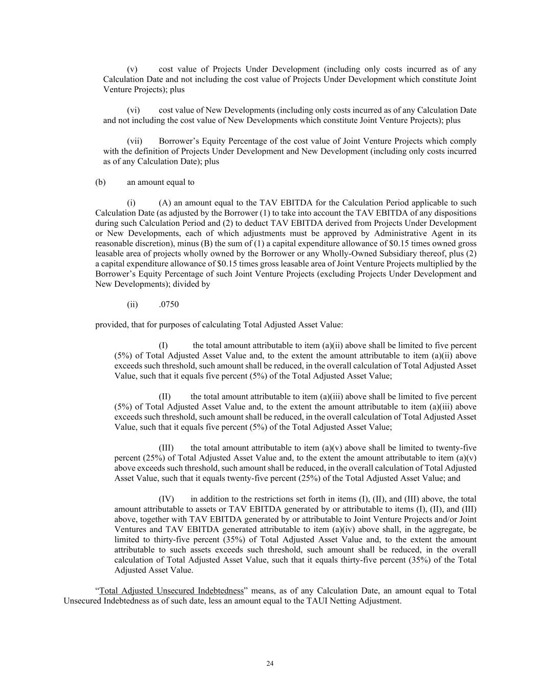 24 (v) cost value of Projects Under Development (including only costs incurred as of any Calculation Date and not including the cost value of Projects Under Development which constitute Joint Venture Projects); plus (vi) cost value of New Developments (including only costs incurred as of any Calculation Date and not including the cost value of New Developments which constitute Joint Venture Projects); plus (vii) Borrower’s Equity Percentage of the cost value of Joint Venture Projects which comply with the definition of Projects Under Development and New Development (including only costs incurred as of any Calculation Date); plus (b) an amount equal to (i) (A) an amount equal to the TAV EBITDA for the Calculation Period applicable to such Calculation Date (as adjusted by the Borrower (1) to take into account the TAV EBITDA of any dispositions during such Calculation Period and (2) to deduct TAV EBITDA derived from Projects Under Development or New Developments, each of which adjustments must be approved by Administrative Agent in its reasonable discretion), minus (B) the sum of (1) a capital expenditure allowance of $0.15 times owned gross leasable area of projects wholly owned by the Borrower or any Wholly-Owned Subsidiary thereof, plus (2) a capital expenditure allowance of $0.15 times gross leasable area of Joint Venture Projects multiplied by the Borrower’s Equity Percentage of such Joint Venture Projects (excluding Projects Under Development and New Developments); divided by (ii) .0750 provided, that for purposes of calculating Total Adjusted Asset Value: (I) the total amount attributable to item (a)(ii) above shall be limited to five percent (5%) of Total Adjusted Asset Value and, to the extent the amount attributable to item (a)(ii) above exceeds such threshold, such amount shall be reduced, in the overall calculation of Total Adjusted Asset Value, such that it equals five percent (5%) of the Total Adjusted Asset Value; (II) the total amount attributable to item (a)(iii) above shall be limited to five percent (5%) of Total Adjusted Asset Value and, to the extent the amount attributable to item (a)(iii) above exceeds such threshold, such amount shall be reduced, in the overall calculation of Total Adjusted Asset Value, such that it equals five percent (5%) of the Total Adjusted Asset Value; (III) the total amount attributable to item (a)(v) above shall be limited to twenty-five percent (25%) of Total Adjusted Asset Value and, to the extent the amount attributable to item (a)(v) above exceeds such threshold, such amount shall be reduced, in the overall calculation of Total Adjusted Asset Value, such that it equals twenty-five percent (25%) of the Total Adjusted Asset Value; and (IV) in addition to the restrictions set forth in items (I), (II), and (III) above, the total amount attributable to assets or TAV EBITDA generated by or attributable to items (I), (II), and (III) above, together with TAV EBITDA generated by or attributable to Joint Venture Projects and/or Joint Ventures and TAV EBITDA generated attributable to item (a)(iv) above shall, in the aggregate, be limited to thirty-five percent (35%) of Total Adjusted Asset Value and, to the extent the amount attributable to such assets exceeds such threshold, such amount shall be reduced, in the overall calculation of Total Adjusted Asset Value, such that it equals thirty-five percent (35%) of the Total Adjusted Asset Value. “Total Adjusted Unsecured Indebtedness” means, as of any Calculation Date, an amount equal to Total Unsecured Indebtedness as of such date, less an amount equal to the TAUI Netting Adjustment.