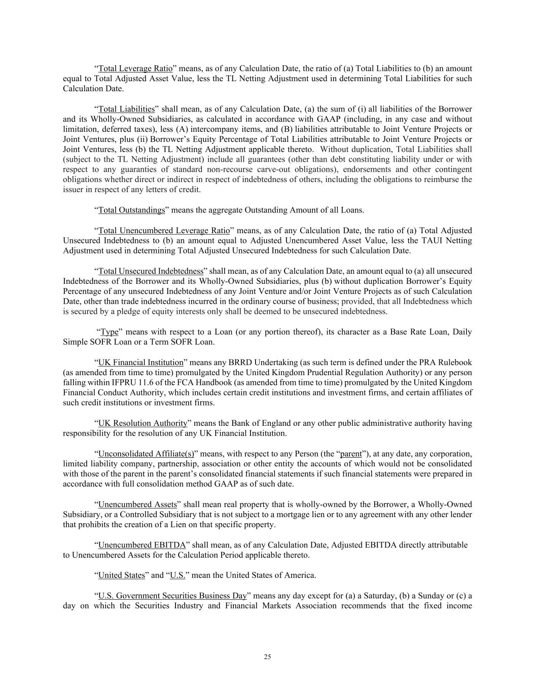 25 “Total Leverage Ratio” means, as of any Calculation Date, the ratio of (a) Total Liabilities to (b) an amount equal to Total Adjusted Asset Value, less the TL Netting Adjustment used in determining Total Liabilities for such Calculation Date. “Total Liabilities” shall mean, as of any Calculation Date, (a) the sum of (i) all liabilities of the Borrower and its Wholly-Owned Subsidiaries, as calculated in accordance with GAAP (including, in any case and without limitation, deferred taxes), less (A) intercompany items, and (B) liabilities attributable to Joint Venture Projects or Joint Ventures, plus (ii) Borrower’s Equity Percentage of Total Liabilities attributable to Joint Venture Projects or Joint Ventures, less (b) the TL Netting Adjustment applicable thereto. Without duplication, Total Liabilities shall (subject to the TL Netting Adjustment) include all guarantees (other than debt constituting liability under or with respect to any guaranties of standard non-recourse carve-out obligations), endorsements and other contingent obligations whether direct or indirect in respect of indebtedness of others, including the obligations to reimburse the issuer in respect of any letters of credit. “Total Outstandings” means the aggregate Outstanding Amount of all Loans. “Total Unencumbered Leverage Ratio” means, as of any Calculation Date, the ratio of (a) Total Adjusted Unsecured Indebtedness to (b) an amount equal to Adjusted Unencumbered Asset Value, less the TAUI Netting Adjustment used in determining Total Adjusted Unsecured Indebtedness for such Calculation Date. “Total Unsecured Indebtedness” shall mean, as of any Calculation Date, an amount equal to (a) all unsecured Indebtedness of the Borrower and its Wholly-Owned Subsidiaries, plus (b) without duplication Borrower’s Equity Percentage of any unsecured Indebtedness of any Joint Venture and/or Joint Venture Projects as of such Calculation Date, other than trade indebtedness incurred in the ordinary course of business; provided, that all Indebtedness which is secured by a pledge of equity interests only shall be deemed to be unsecured indebtedness. “Type” means with respect to a Loan (or any portion thereof), its character as a Base Rate Loan, Daily Simple SOFR Loan or a Term SOFR Loan. “UK Financial Institution” means any BRRD Undertaking (as such term is defined under the PRA Rulebook (as amended from time to time) promulgated by the United Kingdom Prudential Regulation Authority) or any person falling within IFPRU 11.6 of the FCA Handbook (as amended from time to time) promulgated by the United Kingdom Financial Conduct Authority, which includes certain credit institutions and investment firms, and certain affiliates of such credit institutions or investment firms. “UK Resolution Authority” means the Bank of England or any other public administrative authority having responsibility for the resolution of any UK Financial Institution. “Unconsolidated Affiliate(s)” means, with respect to any Person (the “parent”), at any date, any corporation, limited liability company, partnership, association or other entity the accounts of which would not be consolidated with those of the parent in the parent’s consolidated financial statements if such financial statements were prepared in accordance with full consolidation method GAAP as of such date. “Unencumbered Assets” shall mean real property that is wholly-owned by the Borrower, a Wholly-Owned Subsidiary, or a Controlled Subsidiary that is not subject to a mortgage lien or to any agreement with any other lender that prohibits the creation of a Lien on that specific property. “Unencumbered EBITDA” shall mean, as of any Calculation Date, Adjusted EBITDA directly attributable to Unencumbered Assets for the Calculation Period applicable thereto. “United States” and “U.S.” mean the United States of America. “U.S. Government Securities Business Day” means any day except for (a) a Saturday, (b) a Sunday or (c) a day on which the Securities Industry and Financial Markets Association recommends that the fixed income