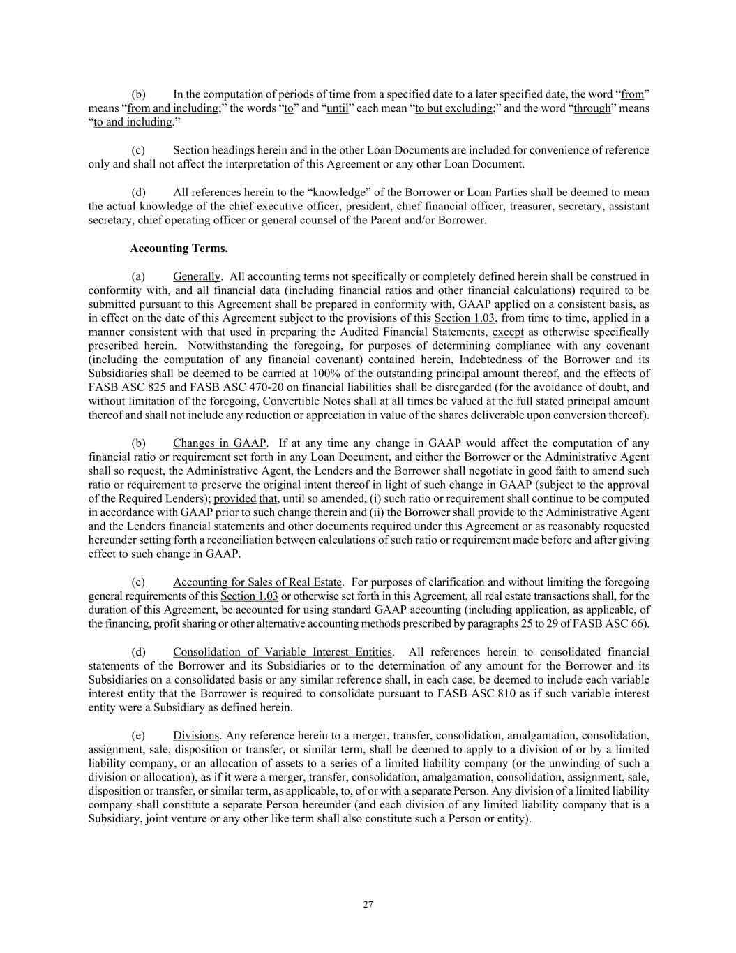 27 (b) In the computation of periods of time from a specified date to a later specified date, the word “from” means “from and including;” the words “to” and “until” each mean “to but excluding;” and the word “through” means “to and including.” (c) Section headings herein and in the other Loan Documents are included for convenience of reference only and shall not affect the interpretation of this Agreement or any other Loan Document. (d) All references herein to the “knowledge” of the Borrower or Loan Parties shall be deemed to mean the actual knowledge of the chief executive officer, president, chief financial officer, treasurer, secretary, assistant secretary, chief operating officer or general counsel of the Parent and/or Borrower. Accounting Terms. (a) Generally. All accounting terms not specifically or completely defined herein shall be construed in conformity with, and all financial data (including financial ratios and other financial calculations) required to be submitted pursuant to this Agreement shall be prepared in conformity with, GAAP applied on a consistent basis, as in effect on the date of this Agreement subject to the provisions of this Section 1.03, from time to time, applied in a manner consistent with that used in preparing the Audited Financial Statements, except as otherwise specifically prescribed herein. Notwithstanding the foregoing, for purposes of determining compliance with any covenant (including the computation of any financial covenant) contained herein, Indebtedness of the Borrower and its Subsidiaries shall be deemed to be carried at 100% of the outstanding principal amount thereof, and the effects of FASB ASC 825 and FASB ASC 470-20 on financial liabilities shall be disregarded (for the avoidance of doubt, and without limitation of the foregoing, Convertible Notes shall at all times be valued at the full stated principal amount thereof and shall not include any reduction or appreciation in value of the shares deliverable upon conversion thereof). (b) Changes in GAAP. If at any time any change in GAAP would affect the computation of any financial ratio or requirement set forth in any Loan Document, and either the Borrower or the Administrative Agent shall so request, the Administrative Agent, the Lenders and the Borrower shall negotiate in good faith to amend such ratio or requirement to preserve the original intent thereof in light of such change in GAAP (subject to the approval of the Required Lenders); provided that, until so amended, (i) such ratio or requirement shall continue to be computed in accordance with GAAP prior to such change therein and (ii) the Borrower shall provide to the Administrative Agent and the Lenders financial statements and other documents required under this Agreement or as reasonably requested hereunder setting forth a reconciliation between calculations of such ratio or requirement made before and after giving effect to such change in GAAP. (c) Accounting for Sales of Real Estate. For purposes of clarification and without limiting the foregoing general requirements of this Section 1.03 or otherwise set forth in this Agreement, all real estate transactions shall, for the duration of this Agreement, be accounted for using standard GAAP accounting (including application, as applicable, of the financing, profit sharing or other alternative accounting methods prescribed by paragraphs 25 to 29 of FASB ASC 66). (d) Consolidation of Variable Interest Entities. All references herein to consolidated financial statements of the Borrower and its Subsidiaries or to the determination of any amount for the Borrower and its Subsidiaries on a consolidated basis or any similar reference shall, in each case, be deemed to include each variable interest entity that the Borrower is required to consolidate pursuant to FASB ASC 810 as if such variable interest entity were a Subsidiary as defined herein. (e) Divisions. Any reference herein to a merger, transfer, consolidation, amalgamation, consolidation, assignment, sale, disposition or transfer, or similar term, shall be deemed to apply to a division of or by a limited liability company, or an allocation of assets to a series of a limited liability company (or the unwinding of such a division or allocation), as if it were a merger, transfer, consolidation, amalgamation, consolidation, assignment, sale, disposition or transfer, or similar term, as applicable, to, of or with a separate Person. Any division of a limited liability company shall constitute a separate Person hereunder (and each division of any limited liability company that is a Subsidiary, joint venture or any other like term shall also constitute such a Person or entity).
