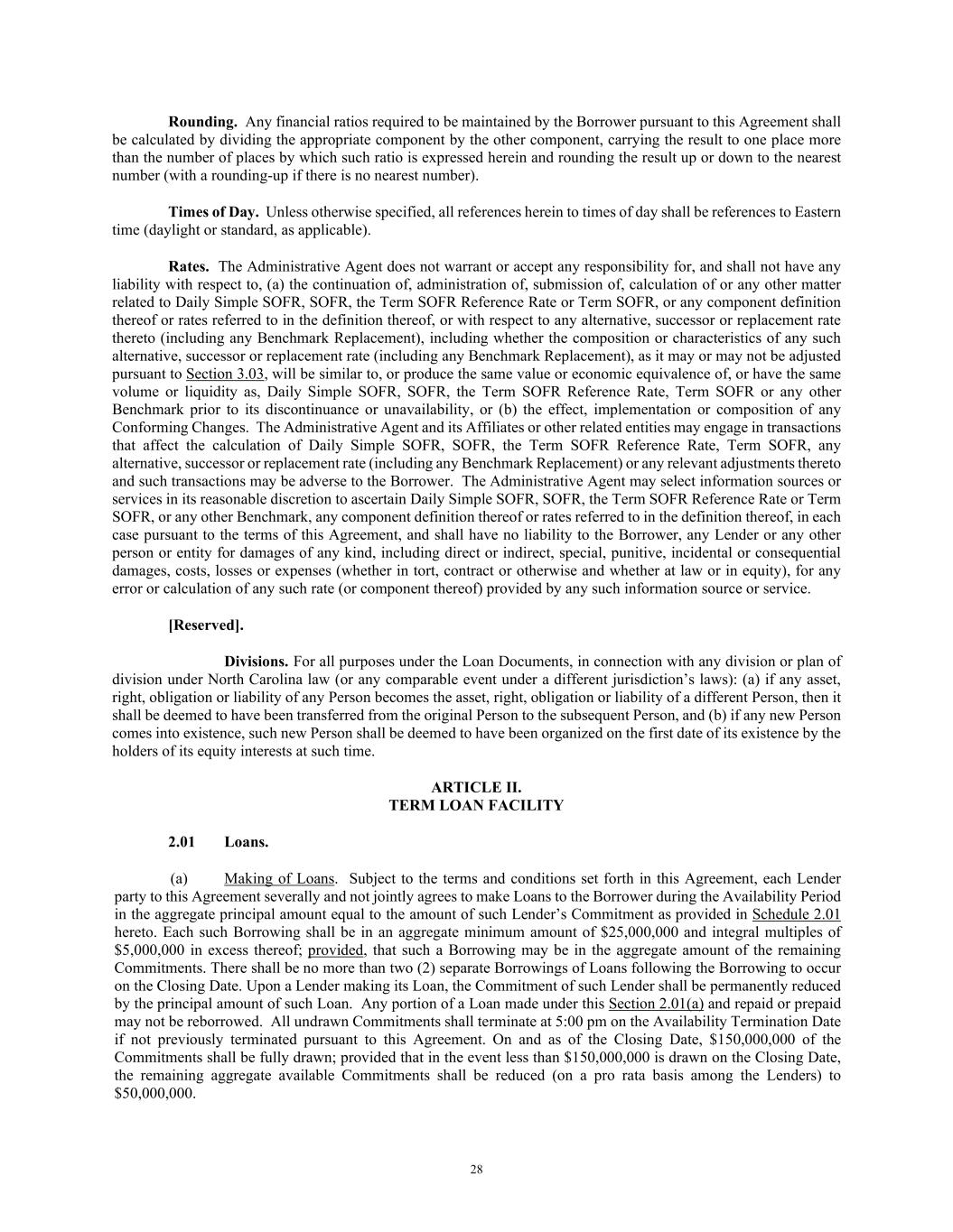 28 Rounding. Any financial ratios required to be maintained by the Borrower pursuant to this Agreement shall be calculated by dividing the appropriate component by the other component, carrying the result to one place more than the number of places by which such ratio is expressed herein and rounding the result up or down to the nearest number (with a rounding-up if there is no nearest number). Times of Day. Unless otherwise specified, all references herein to times of day shall be references to Eastern time (daylight or standard, as applicable). Rates. The Administrative Agent does not warrant or accept any responsibility for, and shall not have any liability with respect to, (a) the continuation of, administration of, submission of, calculation of or any other matter related to Daily Simple SOFR, SOFR, the Term SOFR Reference Rate or Term SOFR, or any component definition thereof or rates referred to in the definition thereof, or with respect to any alternative, successor or replacement rate thereto (including any Benchmark Replacement), including whether the composition or characteristics of any such alternative, successor or replacement rate (including any Benchmark Replacement), as it may or may not be adjusted pursuant to Section 3.03, will be similar to, or produce the same value or economic equivalence of, or have the same volume or liquidity as, Daily Simple SOFR, SOFR, the Term SOFR Reference Rate, Term SOFR or any other Benchmark prior to its discontinuance or unavailability, or (b) the effect, implementation or composition of any Conforming Changes. The Administrative Agent and its Affiliates or other related entities may engage in transactions that affect the calculation of Daily Simple SOFR, SOFR, the Term SOFR Reference Rate, Term SOFR, any alternative, successor or replacement rate (including any Benchmark Replacement) or any relevant adjustments thereto and such transactions may be adverse to the Borrower. The Administrative Agent may select information sources or services in its reasonable discretion to ascertain Daily Simple SOFR, SOFR, the Term SOFR Reference Rate or Term SOFR, or any other Benchmark, any component definition thereof or rates referred to in the definition thereof, in each case pursuant to the terms of this Agreement, and shall have no liability to the Borrower, any Lender or any other person or entity for damages of any kind, including direct or indirect, special, punitive, incidental or consequential damages, costs, losses or expenses (whether in tort, contract or otherwise and whether at law or in equity), for any error or calculation of any such rate (or component thereof) provided by any such information source or service. [Reserved]. Divisions. For all purposes under the Loan Documents, in connection with any division or plan of division under North Carolina law (or any comparable event under a different jurisdiction’s laws): (a) if any asset, right, obligation or liability of any Person becomes the asset, right, obligation or liability of a different Person, then it shall be deemed to have been transferred from the original Person to the subsequent Person, and (b) if any new Person comes into existence, such new Person shall be deemed to have been organized on the first date of its existence by the holders of its equity interests at such time. ARTICLE II. TERM LOAN FACILITY 2.01 Loans. (a) Making of Loans. Subject to the terms and conditions set forth in this Agreement, each Lender party to this Agreement severally and not jointly agrees to make Loans to the Borrower during the Availability Period in the aggregate principal amount equal to the amount of such Lender’s Commitment as provided in Schedule 2.01 hereto. Each such Borrowing shall be in an aggregate minimum amount of $25,000,000 and integral multiples of $5,000,000 in excess thereof; provided, that such a Borrowing may be in the aggregate amount of the remaining Commitments. There shall be no more than two (2) separate Borrowings of Loans following the Borrowing to occur on the Closing Date. Upon a Lender making its Loan, the Commitment of such Lender shall be permanently reduced by the principal amount of such Loan. Any portion of a Loan made under this Section 2.01(a) and repaid or prepaid may not be reborrowed. All undrawn Commitments shall terminate at 5:00 pm on the Availability Termination Date if not previously terminated pursuant to this Agreement. On and as of the Closing Date, $150,000,000 of the Commitments shall be fully drawn; provided that in the event less than $150,000,000 is drawn on the Closing Date, the remaining aggregate available Commitments shall be reduced (on a pro rata basis among the Lenders) to $50,000,000.