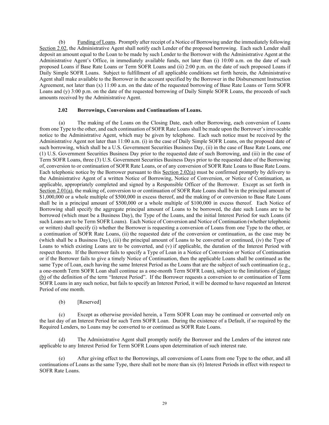 29 (b) Funding of Loans. Promptly after receipt of a Notice of Borrowing under the immediately following Section 2.02, the Administrative Agent shall notify each Lender of the proposed borrowing. Each such Lender shall deposit an amount equal to the Loan to be made by such Lender to the Borrower with the Administrative Agent at the Administrative Agent’s Office, in immediately available funds, not later than (i) 10:00 a.m. on the date of such proposed Loans if Base Rate Loans or Term SOFR Loans and (ii) 2:00 p.m. on the date of such proposed Loans if Daily Simple SOFR Loans. Subject to fulfillment of all applicable conditions set forth herein, the Administrative Agent shall make available to the Borrower in the account specified by the Borrower in the Disbursement Instruction Agreement, not later than (x) 11:00 a.m. on the date of the requested borrowing of Base Rate Loans or Term SOFR Loans and (y) 3:00 p.m. on the date of the requested borrowing of Daily Simple SOFR Loans, the proceeds of such amounts received by the Administrative Agent. 2.02 Borrowings, Conversions and Continuations of Loans. (a) The making of the Loans on the Closing Date, each other Borrowing, each conversion of Loans from one Type to the other, and each continuation of SOFR Rate Loans shall be made upon the Borrower’s irrevocable notice to the Administrative Agent, which may be given by telephone. Each such notice must be received by the Administrative Agent not later than 11:00 a.m. (i) in the case of Daily Simple SOFR Loans, on the proposed date of such borrowing, which shall be a U.S. Government Securities Business Day, (ii) in the case of Base Rate Loans, one (1) U.S. Government Securities Business Day prior to the requested date of such Borrowing, and (iii) in the case of Term SOFR Loans, three (3) U.S. Government Securities Business Days prior to the requested date of the Borrowing of, conversion to or continuation of SOFR Rate Loans, or of any conversion of SOFR Rate Loans to Base Rate Loans. Each telephonic notice by the Borrower pursuant to this Section 2.02(a) must be confirmed promptly by delivery to the Administrative Agent of a written Notice of Borrowing, Notice of Conversion, or Notice of Continuation, as applicable, appropriately completed and signed by a Responsible Officer of the Borrower. Except as set forth in Section 2.01(a), the making of, conversion to or continuation of SOFR Rate Loans shall be in the principal amount of $1,000,000 or a whole multiple of $500,000 in excess thereof, and the making of or conversion to Base Rate Loans shall be in a principal amount of $500,000 or a whole multiple of $100,000 in excess thereof. Each Notice of Borrowing shall specify the aggregate principal amount of Loans to be borrowed, the date such Loans are to be borrowed (which must be a Business Day), the Type of the Loans, and the initial Interest Period for such Loans (if such Loans are to be Term SOFR Loans). Each Notice of Conversion and Notice of Continuation (whether telephonic or written) shall specify (i) whether the Borrower is requesting a conversion of Loans from one Type to the other, or a continuation of SOFR Rate Loans, (ii) the requested date of the conversion or continuation, as the case may be (which shall be a Business Day), (iii) the principal amount of Loans to be converted or continued, (iv) the Type of Loans to which existing Loans are to be converted, and (v) if applicable, the duration of the Interest Period with respect thereto. If the Borrower fails to specify a Type of Loan in a Notice of Conversion or Notice of Continuation or if the Borrower fails to give a timely Notice of Continuation, then the applicable Loans shall be continued as the same Type of Loan, each having the same Interest Period as the Loans that are the subject of such continuation (e.g., a one-month Term SOFR Loan shall continue as a one-month Term SOFR Loan), subject to the limitations of clause (b) of the definition of the term “Interest Period”. If the Borrower requests a conversion to or continuation of Term SOFR Loans in any such notice, but fails to specify an Interest Period, it will be deemed to have requested an Interest Period of one month. (b) [Reserved] (c) Except as otherwise provided herein, a Term SOFR Loan may be continued or converted only on the last day of an Interest Period for such Term SOFR Loan. During the existence of a Default, if so required by the Required Lenders, no Loans may be converted to or continued as SOFR Rate Loans. (d) The Administrative Agent shall promptly notify the Borrower and the Lenders of the interest rate applicable to any Interest Period for Term SOFR Loans upon determination of such interest rate. (e) After giving effect to the Borrowings, all conversions of Loans from one Type to the other, and all continuations of Loans as the same Type, there shall not be more than six (6) Interest Periods in effect with respect to SOFR Rate Loans.