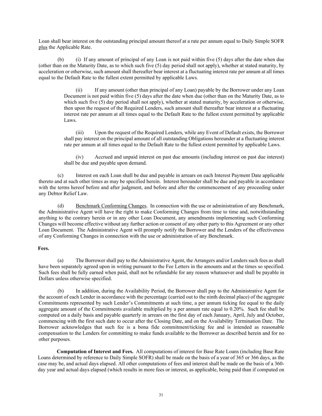 31 Loan shall bear interest on the outstanding principal amount thereof at a rate per annum equal to Daily Simple SOFR plus the Applicable Rate. (b) (i) If any amount of principal of any Loan is not paid within five (5) days after the date when due (other than on the Maturity Date, as to which such five (5) day period shall not apply), whether at stated maturity, by acceleration or otherwise, such amount shall thereafter bear interest at a fluctuating interest rate per annum at all times equal to the Default Rate to the fullest extent permitted by applicable Laws. (ii) If any amount (other than principal of any Loan) payable by the Borrower under any Loan Document is not paid within five (5) days after the date when due (other than on the Maturity Date, as to which such five (5) day period shall not apply), whether at stated maturity, by acceleration or otherwise, then upon the request of the Required Lenders, such amount shall thereafter bear interest at a fluctuating interest rate per annum at all times equal to the Default Rate to the fullest extent permitted by applicable Laws. (iii) Upon the request of the Required Lenders, while any Event of Default exists, the Borrower shall pay interest on the principal amount of all outstanding Obligations hereunder at a fluctuating interest rate per annum at all times equal to the Default Rate to the fullest extent permitted by applicable Laws. (iv) Accrued and unpaid interest on past due amounts (including interest on past due interest) shall be due and payable upon demand. (c) Interest on each Loan shall be due and payable in arrears on each Interest Payment Date applicable thereto and at such other times as may be specified herein. Interest hereunder shall be due and payable in accordance with the terms hereof before and after judgment, and before and after the commencement of any proceeding under any Debtor Relief Law. (d) Benchmark Conforming Changes. In connection with the use or administration of any Benchmark, the Administrative Agent will have the right to make Conforming Changes from time to time and, notwithstanding anything to the contrary herein or in any other Loan Document, any amendments implementing such Conforming Changes will become effective without any further action or consent of any other party to this Agreement or any other Loan Document. The Administrative Agent will promptly notify the Borrower and the Lenders of the effectiveness of any Conforming Changes in connection with the use or administration of any Benchmark. Fees. (a) The Borrower shall pay to the Administrative Agent, the Arrangers and/or Lenders such fees as shall have been separately agreed upon in writing pursuant to the Fee Letters in the amounts and at the times so specified. Such fees shall be fully earned when paid, shall not be refundable for any reason whatsoever and shall be payable in Dollars unless otherwise specified. (b) In addition, during the Availability Period, the Borrower shall pay to the Administrative Agent for the account of each Lender in accordance with the percentage (carried out to the ninth decimal place) of the aggregate Commitments represented by such Lender’s Commitments at such time, a per annum ticking fee equal to the daily aggregate amount of the Commitments available multiplied by a per annum rate equal to 0.20%. Such fee shall be computed on a daily basis and payable quarterly in arrears on the first day of each January, April, July and October, commencing with the first such date to occur after the Closing Date, and on the Availability Termination Date. The Borrower acknowledges that such fee is a bona fide commitment/ticking fee and is intended as reasonable compensation to the Lenders for committing to make funds available to the Borrower as described herein and for no other purposes. Computation of Interest and Fees. All computations of interest for Base Rate Loans (including Base Rate Loans determined by reference to Daily Simple SOFR) shall be made on the basis of a year of 365 or 366 days, as the case may be, and actual days elapsed. All other computations of fees and interest shall be made on the basis of a 360- day year and actual days elapsed (which results in more fees or interest, as applicable, being paid than if computed on