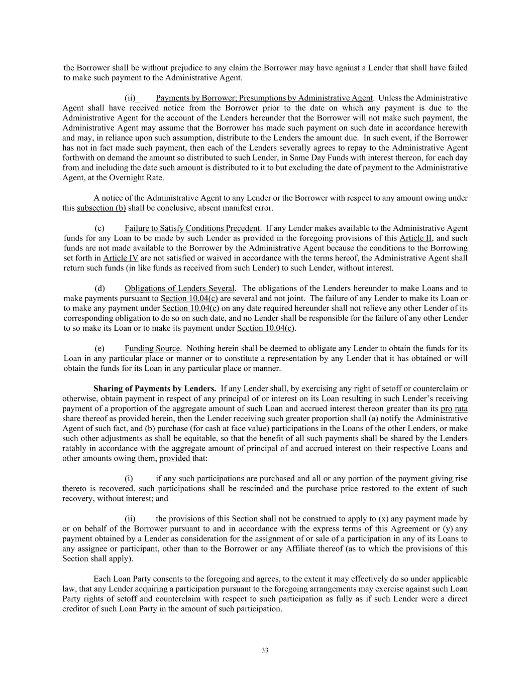 33 the Borrower shall be without prejudice to any claim the Borrower may have against a Lender that shall have failed to make such payment to the Administrative Agent. (ii)_ Payments by Borrower; Presumptions by Administrative Agent. Unless the Administrative Agent shall have received notice from the Borrower prior to the date on which any payment is due to the Administrative Agent for the account of the Lenders hereunder that the Borrower will not make such payment, the Administrative Agent may assume that the Borrower has made such payment on such date in accordance herewith and may, in reliance upon such assumption, distribute to the Lenders the amount due. In such event, if the Borrower has not in fact made such payment, then each of the Lenders severally agrees to repay to the Administrative Agent forthwith on demand the amount so distributed to such Lender, in Same Day Funds with interest thereon, for each day from and including the date such amount is distributed to it to but excluding the date of payment to the Administrative Agent, at the Overnight Rate. A notice of the Administrative Agent to any Lender or the Borrower with respect to any amount owing under this subsection (b) shall be conclusive, absent manifest error. (c) Failure to Satisfy Conditions Precedent. If any Lender makes available to the Administrative Agent funds for any Loan to be made by such Lender as provided in the foregoing provisions of this Article II, and such funds are not made available to the Borrower by the Administrative Agent because the conditions to the Borrowing set forth in Article IV are not satisfied or waived in accordance with the terms hereof, the Administrative Agent shall return such funds (in like funds as received from such Lender) to such Lender, without interest. (d) Obligations of Lenders Several. The obligations of the Lenders hereunder to make Loans and to make payments pursuant to Section 10.04(c) are several and not joint. The failure of any Lender to make its Loan or to make any payment under Section 10.04(c) on any date required hereunder shall not relieve any other Lender of its corresponding obligation to do so on such date, and no Lender shall be responsible for the failure of any other Lender to so make its Loan or to make its payment under Section 10.04(c). (e) Funding Source. Nothing herein shall be deemed to obligate any Lender to obtain the funds for its Loan in any particular place or manner or to constitute a representation by any Lender that it has obtained or will obtain the funds for its Loan in any particular place or manner. Sharing of Payments by Lenders. If any Lender shall, by exercising any right of setoff or counterclaim or otherwise, obtain payment in respect of any principal of or interest on its Loan resulting in such Lender’s receiving payment of a proportion of the aggregate amount of such Loan and accrued interest thereon greater than its pro rata share thereof as provided herein, then the Lender receiving such greater proportion shall (a) notify the Administrative Agent of such fact, and (b) purchase (for cash at face value) participations in the Loans of the other Lenders, or make such other adjustments as shall be equitable, so that the benefit of all such payments shall be shared by the Lenders ratably in accordance with the aggregate amount of principal of and accrued interest on their respective Loans and other amounts owing them, provided that: (i) if any such participations are purchased and all or any portion of the payment giving rise thereto is recovered, such participations shall be rescinded and the purchase price restored to the extent of such recovery, without interest; and (ii) the provisions of this Section shall not be construed to apply to (x) any payment made by or on behalf of the Borrower pursuant to and in accordance with the express terms of this Agreement or (y) any payment obtained by a Lender as consideration for the assignment of or sale of a participation in any of its Loans to any assignee or participant, other than to the Borrower or any Affiliate thereof (as to which the provisions of this Section shall apply). Each Loan Party consents to the foregoing and agrees, to the extent it may effectively do so under applicable law, that any Lender acquiring a participation pursuant to the foregoing arrangements may exercise against such Loan Party rights of setoff and counterclaim with respect to such participation as fully as if such Lender were a direct creditor of such Loan Party in the amount of such participation.