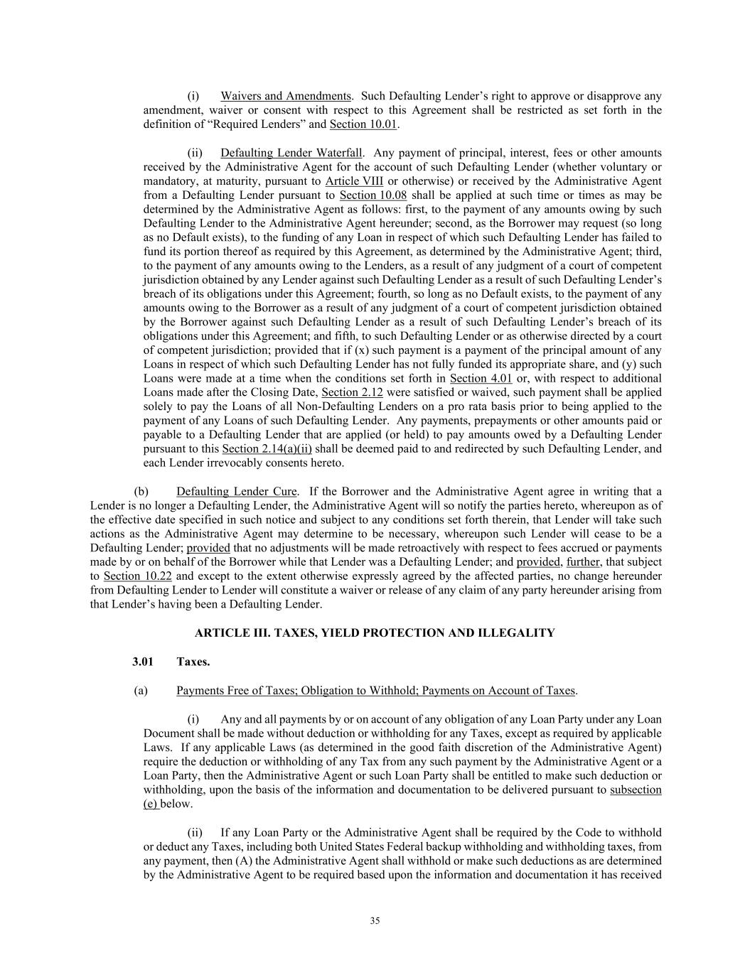 35 (i) Waivers and Amendments. Such Defaulting Lender’s right to approve or disapprove any amendment, waiver or consent with respect to this Agreement shall be restricted as set forth in the definition of “Required Lenders” and Section 10.01. (ii) Defaulting Lender Waterfall. Any payment of principal, interest, fees or other amounts received by the Administrative Agent for the account of such Defaulting Lender (whether voluntary or mandatory, at maturity, pursuant to Article VIII or otherwise) or received by the Administrative Agent from a Defaulting Lender pursuant to Section 10.08 shall be applied at such time or times as may be determined by the Administrative Agent as follows: first, to the payment of any amounts owing by such Defaulting Lender to the Administrative Agent hereunder; second, as the Borrower may request (so long as no Default exists), to the funding of any Loan in respect of which such Defaulting Lender has failed to fund its portion thereof as required by this Agreement, as determined by the Administrative Agent; third, to the payment of any amounts owing to the Lenders, as a result of any judgment of a court of competent jurisdiction obtained by any Lender against such Defaulting Lender as a result of such Defaulting Lender’s breach of its obligations under this Agreement; fourth, so long as no Default exists, to the payment of any amounts owing to the Borrower as a result of any judgment of a court of competent jurisdiction obtained by the Borrower against such Defaulting Lender as a result of such Defaulting Lender’s breach of its obligations under this Agreement; and fifth, to such Defaulting Lender or as otherwise directed by a court of competent jurisdiction; provided that if (x) such payment is a payment of the principal amount of any Loans in respect of which such Defaulting Lender has not fully funded its appropriate share, and (y) such Loans were made at a time when the conditions set forth in Section 4.01 or, with respect to additional Loans made after the Closing Date, Section 2.12 were satisfied or waived, such payment shall be applied solely to pay the Loans of all Non-Defaulting Lenders on a pro rata basis prior to being applied to the payment of any Loans of such Defaulting Lender. Any payments, prepayments or other amounts paid or payable to a Defaulting Lender that are applied (or held) to pay amounts owed by a Defaulting Lender pursuant to this Section 2.14(a)(ii) shall be deemed paid to and redirected by such Defaulting Lender, and each Lender irrevocably consents hereto. (b) Defaulting Lender Cure. If the Borrower and the Administrative Agent agree in writing that a Lender is no longer a Defaulting Lender, the Administrative Agent will so notify the parties hereto, whereupon as of the effective date specified in such notice and subject to any conditions set forth therein, that Lender will take such actions as the Administrative Agent may determine to be necessary, whereupon such Lender will cease to be a Defaulting Lender; provided that no adjustments will be made retroactively with respect to fees accrued or payments made by or on behalf of the Borrower while that Lender was a Defaulting Lender; and provided, further, that subject to Section 10.22 and except to the extent otherwise expressly agreed by the affected parties, no change hereunder from Defaulting Lender to Lender will constitute a waiver or release of any claim of any party hereunder arising from that Lender’s having been a Defaulting Lender. ARTICLE III. TAXES, YIELD PROTECTION AND ILLEGALITY 3.01 Taxes. (a) Payments Free of Taxes; Obligation to Withhold; Payments on Account of Taxes. (i) Any and all payments by or on account of any obligation of any Loan Party under any Loan Document shall be made without deduction or withholding for any Taxes, except as required by applicable Laws. If any applicable Laws (as determined in the good faith discretion of the Administrative Agent) require the deduction or withholding of any Tax from any such payment by the Administrative Agent or a Loan Party, then the Administrative Agent or such Loan Party shall be entitled to make such deduction or withholding, upon the basis of the information and documentation to be delivered pursuant to subsection (e) below. (ii) If any Loan Party or the Administrative Agent shall be required by the Code to withhold or deduct any Taxes, including both United States Federal backup withholding and withholding taxes, from any payment, then (A) the Administrative Agent shall withhold or make such deductions as are determined by the Administrative Agent to be required based upon the information and documentation it has received