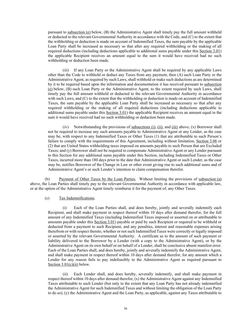 36 pursuant to subsection (e) below, (B) the Administrative Agent shall timely pay the full amount withheld or deducted to the relevant Governmental Authority in accordance with the Code, and (C) to the extent that the withholding or deduction is made on account of Indemnified Taxes, the sum payable by the applicable Loan Party shall be increased as necessary so that after any required withholding or the making of all required deductions (including deductions applicable to additional sums payable under this Section 3.01) the applicable Recipient receives an amount equal to the sum it would have received had no such withholding or deduction been made. (iii) If any Loan Party or the Administrative Agent shall be required by any applicable Laws other than the Code to withhold or deduct any Taxes from any payment, then (A) such Loan Party or the Administrative Agent, as required by such Laws, shall withhold or make such deductions as are determined by it to be required based upon the information and documentation it has received pursuant to subsection (e) below, (B) such Loan Party or the Administrative Agent, to the extent required by such Laws, shall timely pay the full amount withheld or deducted to the relevant Governmental Authority in accordance with such Laws, and (C) to the extent that the withholding or deduction is made on account of Indemnified Taxes, the sum payable by the applicable Loan Party shall be increased as necessary so that after any required withholding or the making of all required deductions (including deductions applicable to additional sums payable under this Section 3.01) the applicable Recipient receives an amount equal to the sum it would have received had no such withholding or deduction been made. (iv) Notwithstanding the provisions of subsections (i), (ii), and (iii) above, (x) Borrower shall not be required to increase any such amounts payable to Administrative Agent or any Lender, as the case may be, with respect to any Indemnified Taxes or Other Taxes (1) that are attributable to such Person’s failure to comply with the requirements of this Agreement, including without limitation, Section 3.06 or (2) that are United States withholding taxes imposed on amounts payable to such Person that are Excluded Taxes; and (y) Borrower shall not be required to compensate Administrative Agent or any Lender pursuant to this Section for any additional sums payable under this Section, including Indemnified Taxes or Other Taxes, incurred more than 180 days prior to the date that Administrative Agent or such Lender, as the case may be, notifies Borrower of the Change in Law or other event giving rise to such additional sums and of Administrative Agent’s or such Lender’s intention to claim compensation therefor. (b) Payment of Other Taxes by the Loan Parties. Without limiting the provisions of subsection (a) above, the Loan Parties shall timely pay to the relevant Governmental Authority in accordance with applicable law, or at the option of the Administrative Agent timely reimburse it for the payment of, any Other Taxes. (c) Tax Indemnifications. (i) Each of the Loan Parties shall, and does hereby, jointly and severally indemnify each Recipient, and shall make payment in respect thereof within 10 days after demand therefor, for the full amount of any Indemnified Taxes (including Indemnified Taxes imposed or asserted on or attributable to amounts payable under this Section 3.01) payable or paid by such Recipient or required to be withheld or deducted from a payment to such Recipient, and any penalties, interest and reasonable expenses arising therefrom or with respect thereto, whether or not such Indemnified Taxes were correctly or legally imposed or asserted by the relevant Governmental Authority. A certificate as to the amount of such payment or liability delivered to the Borrower by a Lender (with a copy to the Administrative Agent), or by the Administrative Agent on its own behalf or on behalf of a Lender, shall be conclusive absent manifest error. Each of the Loan Parties shall, and does hereby, jointly and severally indemnify the Administrative Agent, and shall make payment in respect thereof within 10 days after demand therefor, for any amount which a Lender for any reason fails to pay indefeasibly to the Administrative Agent as required pursuant to Section 3.01(c)(ii) below. (ii) Each Lender shall, and does hereby, severally indemnify, and shall make payment in respect thereof within 10 days after demand therefor, (x) the Administrative Agent against any Indemnified Taxes attributable to such Lender (but only to the extent that any Loan Party has not already indemnified the Administrative Agent for such Indemnified Taxes and without limiting the obligation of the Loan Party to do so), (y) the Administrative Agent and the Loan Party, as applicable, against any Taxes attributable to