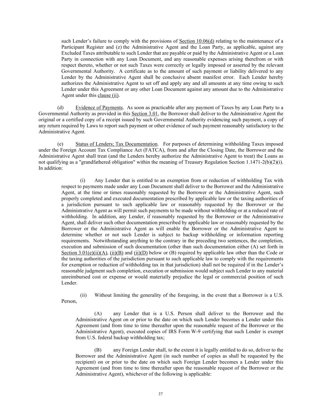 37 such Lender’s failure to comply with the provisions of Section 10.06(d) relating to the maintenance of a Participant Register and (z) the Administrative Agent and the Loan Party, as applicable, against any Excluded Taxes attributable to such Lender that are payable or paid by the Administrative Agent or a Loan Party in connection with any Loan Document, and any reasonable expenses arising therefrom or with respect thereto, whether or not such Taxes were correctly or legally imposed or asserted by the relevant Governmental Authority. A certificate as to the amount of such payment or liability delivered to any Lender by the Administrative Agent shall be conclusive absent manifest error. Each Lender hereby authorizes the Administrative Agent to set off and apply any and all amounts at any time owing to such Lender under this Agreement or any other Loan Document against any amount due to the Administrative Agent under this clause (ii). (d) Evidence of Payments. As soon as practicable after any payment of Taxes by any Loan Party to a Governmental Authority as provided in this Section 3.01, the Borrower shall deliver to the Administrative Agent the original or a certified copy of a receipt issued by such Governmental Authority evidencing such payment, a copy of any return required by Laws to report such payment or other evidence of such payment reasonably satisfactory to the Administrative Agent. (e) Status of Lenders; Tax Documentation. For purposes of determining withholding Taxes imposed under the Foreign Account Tax Compliance Act (FATCA), from and after the Closing Date, the Borrower and the Administrative Agent shall treat (and the Lenders hereby authorize the Administrative Agent to treat) the Loans as not qualifying as a "grandfathered obligation" within the meaning of Treasury Regulation Section 1.1471-2(b)(2)(i). In addition: (i) Any Lender that is entitled to an exemption from or reduction of withholding Tax with respect to payments made under any Loan Document shall deliver to the Borrower and the Administrative Agent, at the time or times reasonably requested by the Borrower or the Administrative Agent, such properly completed and executed documentation prescribed by applicable law or the taxing authorities of a jurisdiction pursuant to such applicable law or reasonably requested by the Borrower or the Administrative Agent as will permit such payments to be made without withholding or at a reduced rate of withholding. In addition, any Lender, if reasonably requested by the Borrower or the Administrative Agent, shall deliver such other documentation prescribed by applicable law or reasonably requested by the Borrower or the Administrative Agent as will enable the Borrower or the Administrative Agent to determine whether or not such Lender is subject to backup withholding or information reporting requirements. Notwithstanding anything to the contrary in the preceding two sentences, the completion, execution and submission of such documentation (other than such documentation either (A) set forth in Section 3.01(e)(ii)(A), (ii)(B) and (ii)(D) below or (B) required by applicable law other than the Code or the taxing authorities of the jurisdiction pursuant to such applicable law to comply with the requirements for exemption or reduction of withholding tax in that jurisdiction) shall not be required if in the Lender’s reasonable judgment such completion, execution or submission would subject such Lender to any material unreimbursed cost or expense or would materially prejudice the legal or commercial position of such Lender. (ii) Without limiting the generality of the foregoing, in the event that a Borrower is a U.S. Person, (A) any Lender that is a U.S. Person shall deliver to the Borrower and the Administrative Agent on or prior to the date on which such Lender becomes a Lender under this Agreement (and from time to time thereafter upon the reasonable request of the Borrower or the Administrative Agent), executed copies of IRS Form W-9 certifying that such Lender is exempt from U.S. federal backup withholding tax; (B) any Foreign Lender shall, to the extent it is legally entitled to do so, deliver to the Borrower and the Administrative Agent (in such number of copies as shall be requested by the recipient) on or prior to the date on which such Foreign Lender becomes a Lender under this Agreement (and from time to time thereafter upon the reasonable request of the Borrower or the Administrative Agent), whichever of the following is applicable: