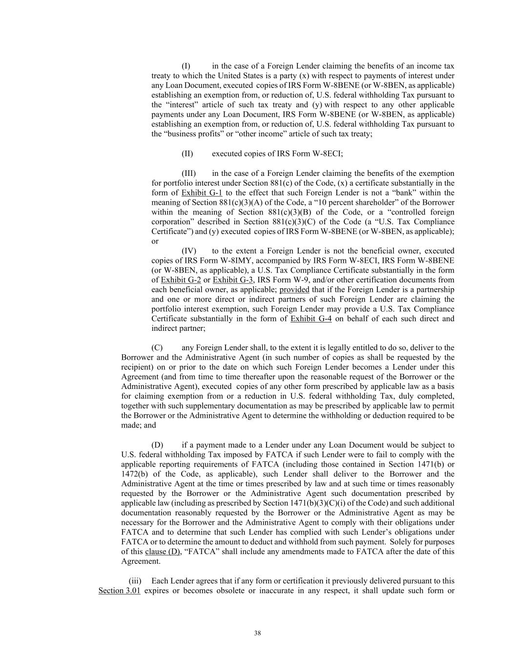 38 (I) in the case of a Foreign Lender claiming the benefits of an income tax treaty to which the United States is a party (x) with respect to payments of interest under any Loan Document, executed copies of IRS Form W-8BENE (or W-8BEN, as applicable) establishing an exemption from, or reduction of, U.S. federal withholding Tax pursuant to the “interest” article of such tax treaty and (y) with respect to any other applicable payments under any Loan Document, IRS Form W-8BENE (or W-8BEN, as applicable) establishing an exemption from, or reduction of, U.S. federal withholding Tax pursuant to the “business profits” or “other income” article of such tax treaty; (II) executed copies of IRS Form W-8ECI; (III) in the case of a Foreign Lender claiming the benefits of the exemption for portfolio interest under Section 881(c) of the Code, (x) a certificate substantially in the form of Exhibit G-1 to the effect that such Foreign Lender is not a “bank” within the meaning of Section 881(c)(3)(A) of the Code, a “10 percent shareholder” of the Borrower within the meaning of Section 881(c)(3)(B) of the Code, or a “controlled foreign corporation” described in Section 881(c)(3)(C) of the Code (a “U.S. Tax Compliance Certificate”) and (y) executed copies of IRS Form W-8BENE (or W-8BEN, as applicable); or (IV) to the extent a Foreign Lender is not the beneficial owner, executed copies of IRS Form W-8IMY, accompanied by IRS Form W-8ECI, IRS Form W-8BENE (or W-8BEN, as applicable), a U.S. Tax Compliance Certificate substantially in the form of Exhibit G-2 or Exhibit G-3, IRS Form W-9, and/or other certification documents from each beneficial owner, as applicable; provided that if the Foreign Lender is a partnership and one or more direct or indirect partners of such Foreign Lender are claiming the portfolio interest exemption, such Foreign Lender may provide a U.S. Tax Compliance Certificate substantially in the form of Exhibit G-4 on behalf of each such direct and indirect partner; (C) any Foreign Lender shall, to the extent it is legally entitled to do so, deliver to the Borrower and the Administrative Agent (in such number of copies as shall be requested by the recipient) on or prior to the date on which such Foreign Lender becomes a Lender under this Agreement (and from time to time thereafter upon the reasonable request of the Borrower or the Administrative Agent), executed copies of any other form prescribed by applicable law as a basis for claiming exemption from or a reduction in U.S. federal withholding Tax, duly completed, together with such supplementary documentation as may be prescribed by applicable law to permit the Borrower or the Administrative Agent to determine the withholding or deduction required to be made; and (D) if a payment made to a Lender under any Loan Document would be subject to U.S. federal withholding Tax imposed by FATCA if such Lender were to fail to comply with the applicable reporting requirements of FATCA (including those contained in Section 1471(b) or 1472(b) of the Code, as applicable), such Lender shall deliver to the Borrower and the Administrative Agent at the time or times prescribed by law and at such time or times reasonably requested by the Borrower or the Administrative Agent such documentation prescribed by applicable law (including as prescribed by Section 1471(b)(3)(C)(i) of the Code) and such additional documentation reasonably requested by the Borrower or the Administrative Agent as may be necessary for the Borrower and the Administrative Agent to comply with their obligations under FATCA and to determine that such Lender has complied with such Lender’s obligations under FATCA or to determine the amount to deduct and withhold from such payment. Solely for purposes of this clause (D), “FATCA” shall include any amendments made to FATCA after the date of this Agreement. (iii) Each Lender agrees that if any form or certification it previously delivered pursuant to this Section 3.01 expires or becomes obsolete or inaccurate in any respect, it shall update such form or