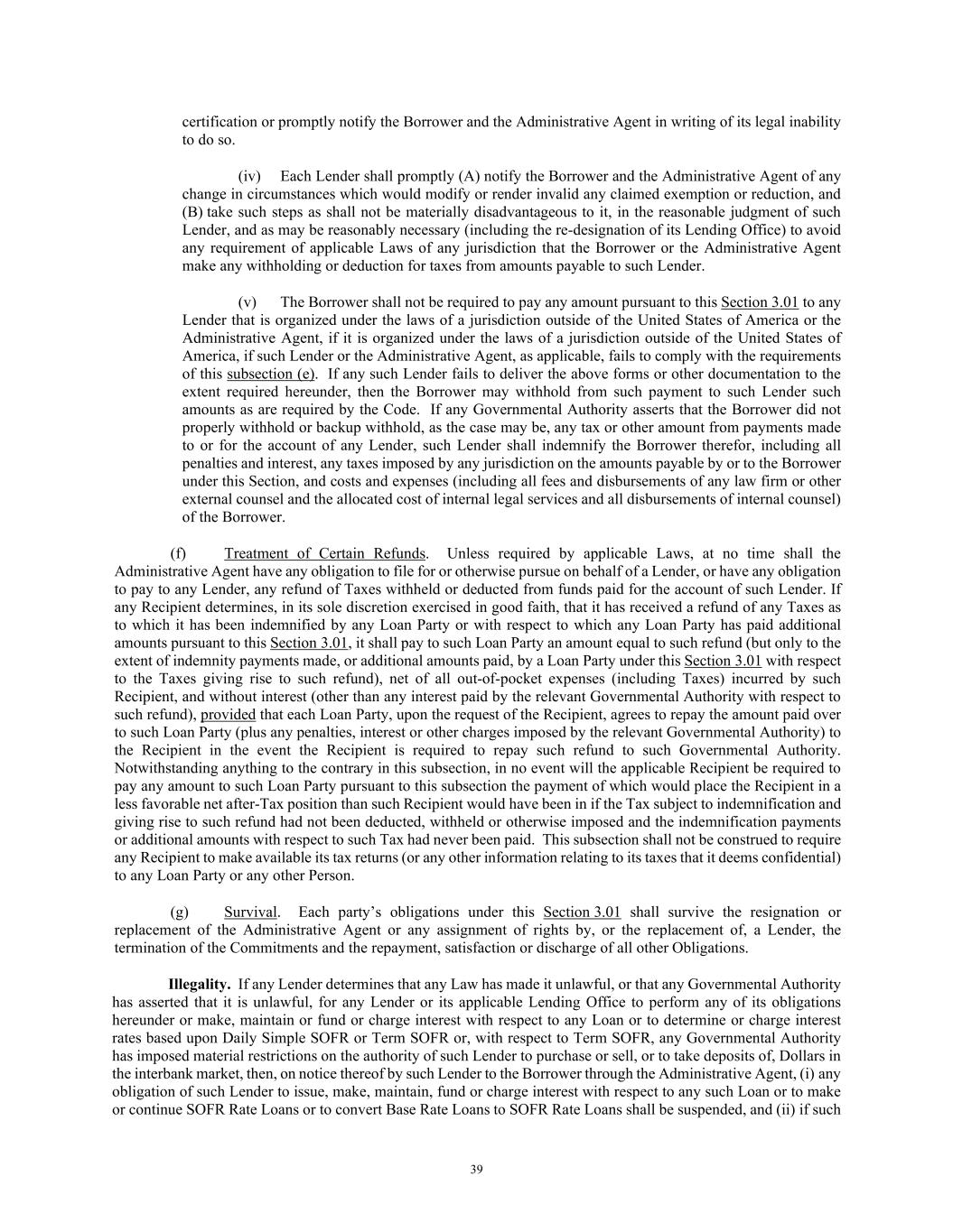 39 certification or promptly notify the Borrower and the Administrative Agent in writing of its legal inability to do so. (iv) Each Lender shall promptly (A) notify the Borrower and the Administrative Agent of any change in circumstances which would modify or render invalid any claimed exemption or reduction, and (B) take such steps as shall not be materially disadvantageous to it, in the reasonable judgment of such Lender, and as may be reasonably necessary (including the re-designation of its Lending Office) to avoid any requirement of applicable Laws of any jurisdiction that the Borrower or the Administrative Agent make any withholding or deduction for taxes from amounts payable to such Lender. (v) The Borrower shall not be required to pay any amount pursuant to this Section 3.01 to any Lender that is organized under the laws of a jurisdiction outside of the United States of America or the Administrative Agent, if it is organized under the laws of a jurisdiction outside of the United States of America, if such Lender or the Administrative Agent, as applicable, fails to comply with the requirements of this subsection (e). If any such Lender fails to deliver the above forms or other documentation to the extent required hereunder, then the Borrower may withhold from such payment to such Lender such amounts as are required by the Code. If any Governmental Authority asserts that the Borrower did not properly withhold or backup withhold, as the case may be, any tax or other amount from payments made to or for the account of any Lender, such Lender shall indemnify the Borrower therefor, including all penalties and interest, any taxes imposed by any jurisdiction on the amounts payable by or to the Borrower under this Section, and costs and expenses (including all fees and disbursements of any law firm or other external counsel and the allocated cost of internal legal services and all disbursements of internal counsel) of the Borrower. (f) Treatment of Certain Refunds. Unless required by applicable Laws, at no time shall the Administrative Agent have any obligation to file for or otherwise pursue on behalf of a Lender, or have any obligation to pay to any Lender, any refund of Taxes withheld or deducted from funds paid for the account of such Lender. If any Recipient determines, in its sole discretion exercised in good faith, that it has received a refund of any Taxes as to which it has been indemnified by any Loan Party or with respect to which any Loan Party has paid additional amounts pursuant to this Section 3.01, it shall pay to such Loan Party an amount equal to such refund (but only to the extent of indemnity payments made, or additional amounts paid, by a Loan Party under this Section 3.01 with respect to the Taxes giving rise to such refund), net of all out-of-pocket expenses (including Taxes) incurred by such Recipient, and without interest (other than any interest paid by the relevant Governmental Authority with respect to such refund), provided that each Loan Party, upon the request of the Recipient, agrees to repay the amount paid over to such Loan Party (plus any penalties, interest or other charges imposed by the relevant Governmental Authority) to the Recipient in the event the Recipient is required to repay such refund to such Governmental Authority. Notwithstanding anything to the contrary in this subsection, in no event will the applicable Recipient be required to pay any amount to such Loan Party pursuant to this subsection the payment of which would place the Recipient in a less favorable net after-Tax position than such Recipient would have been in if the Tax subject to indemnification and giving rise to such refund had not been deducted, withheld or otherwise imposed and the indemnification payments or additional amounts with respect to such Tax had never been paid. This subsection shall not be construed to require any Recipient to make available its tax returns (or any other information relating to its taxes that it deems confidential) to any Loan Party or any other Person. (g) Survival. Each party’s obligations under this Section 3.01 shall survive the resignation or replacement of the Administrative Agent or any assignment of rights by, or the replacement of, a Lender, the termination of the Commitments and the repayment, satisfaction or discharge of all other Obligations. Illegality. If any Lender determines that any Law has made it unlawful, or that any Governmental Authority has asserted that it is unlawful, for any Lender or its applicable Lending Office to perform any of its obligations hereunder or make, maintain or fund or charge interest with respect to any Loan or to determine or charge interest rates based upon Daily Simple SOFR or Term SOFR or, with respect to Term SOFR, any Governmental Authority has imposed material restrictions on the authority of such Lender to purchase or sell, or to take deposits of, Dollars in the interbank market, then, on notice thereof by such Lender to the Borrower through the Administrative Agent, (i) any obligation of such Lender to issue, make, maintain, fund or charge interest with respect to any such Loan or to make or continue SOFR Rate Loans or to convert Base Rate Loans to SOFR Rate Loans shall be suspended, and (ii) if such