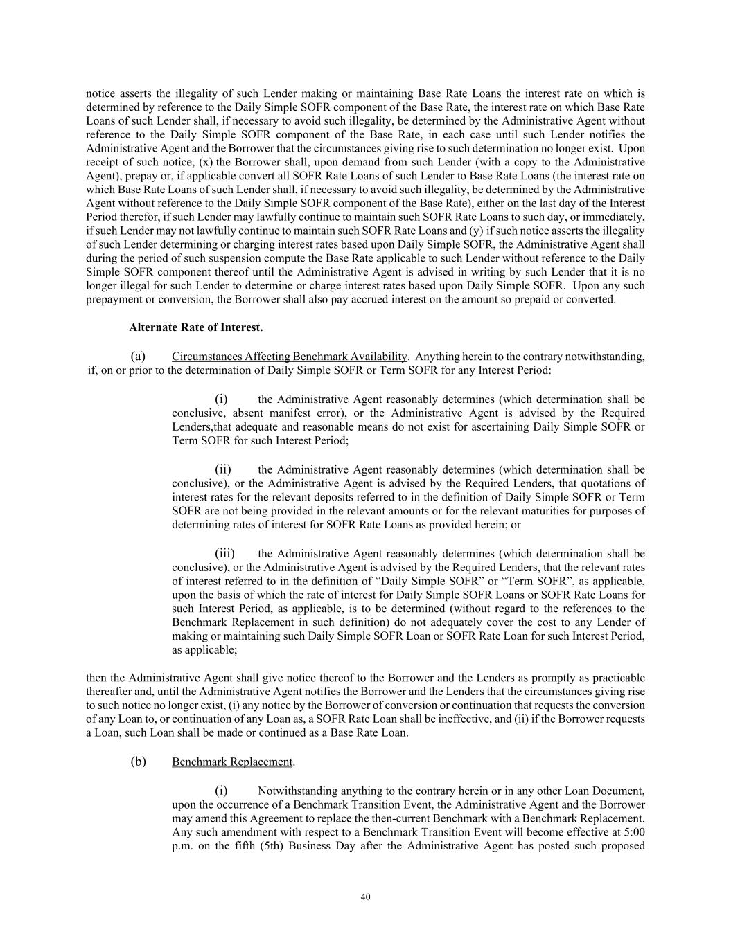 40 notice asserts the illegality of such Lender making or maintaining Base Rate Loans the interest rate on which is determined by reference to the Daily Simple SOFR component of the Base Rate, the interest rate on which Base Rate Loans of such Lender shall, if necessary to avoid such illegality, be determined by the Administrative Agent without reference to the Daily Simple SOFR component of the Base Rate, in each case until such Lender notifies the Administrative Agent and the Borrower that the circumstances giving rise to such determination no longer exist. Upon receipt of such notice, (x) the Borrower shall, upon demand from such Lender (with a copy to the Administrative Agent), prepay or, if applicable convert all SOFR Rate Loans of such Lender to Base Rate Loans (the interest rate on which Base Rate Loans of such Lender shall, if necessary to avoid such illegality, be determined by the Administrative Agent without reference to the Daily Simple SOFR component of the Base Rate), either on the last day of the Interest Period therefor, if such Lender may lawfully continue to maintain such SOFR Rate Loans to such day, or immediately, if such Lender may not lawfully continue to maintain such SOFR Rate Loans and (y) if such notice asserts the illegality of such Lender determining or charging interest rates based upon Daily Simple SOFR, the Administrative Agent shall during the period of such suspension compute the Base Rate applicable to such Lender without reference to the Daily Simple SOFR component thereof until the Administrative Agent is advised in writing by such Lender that it is no longer illegal for such Lender to determine or charge interest rates based upon Daily Simple SOFR. Upon any such prepayment or conversion, the Borrower shall also pay accrued interest on the amount so prepaid or converted. Alternate Rate of Interest. (a) Circumstances Affecting Benchmark Availability. Anything herein to the contrary notwithstanding, if, on or prior to the determination of Daily Simple SOFR or Term SOFR for any Interest Period: (i) the Administrative Agent reasonably determines (which determination shall be conclusive, absent manifest error), or the Administrative Agent is advised by the Required Lenders,that adequate and reasonable means do not exist for ascertaining Daily Simple SOFR or Term SOFR for such Interest Period; (ii) the Administrative Agent reasonably determines (which determination shall be conclusive), or the Administrative Agent is advised by the Required Lenders, that quotations of interest rates for the relevant deposits referred to in the definition of Daily Simple SOFR or Term SOFR are not being provided in the relevant amounts or for the relevant maturities for purposes of determining rates of interest for SOFR Rate Loans as provided herein; or (iii) the Administrative Agent reasonably determines (which determination shall be conclusive), or the Administrative Agent is advised by the Required Lenders, that the relevant rates of interest referred to in the definition of “Daily Simple SOFR” or “Term SOFR”, as applicable, upon the basis of which the rate of interest for Daily Simple SOFR Loans or SOFR Rate Loans for such Interest Period, as applicable, is to be determined (without regard to the references to the Benchmark Replacement in such definition) do not adequately cover the cost to any Lender of making or maintaining such Daily Simple SOFR Loan or SOFR Rate Loan for such Interest Period, as applicable; then the Administrative Agent shall give notice thereof to the Borrower and the Lenders as promptly as practicable thereafter and, until the Administrative Agent notifies the Borrower and the Lenders that the circumstances giving rise to such notice no longer exist, (i) any notice by the Borrower of conversion or continuation that requests the conversion of any Loan to, or continuation of any Loan as, a SOFR Rate Loan shall be ineffective, and (ii) if the Borrower requests a Loan, such Loan shall be made or continued as a Base Rate Loan. (b) Benchmark Replacement. (i) Notwithstanding anything to the contrary herein or in any other Loan Document, upon the occurrence of a Benchmark Transition Event, the Administrative Agent and the Borrower may amend this Agreement to replace the then-current Benchmark with a Benchmark Replacement. Any such amendment with respect to a Benchmark Transition Event will become effective at 5:00 p.m. on the fifth (5th) Business Day after the Administrative Agent has posted such proposed