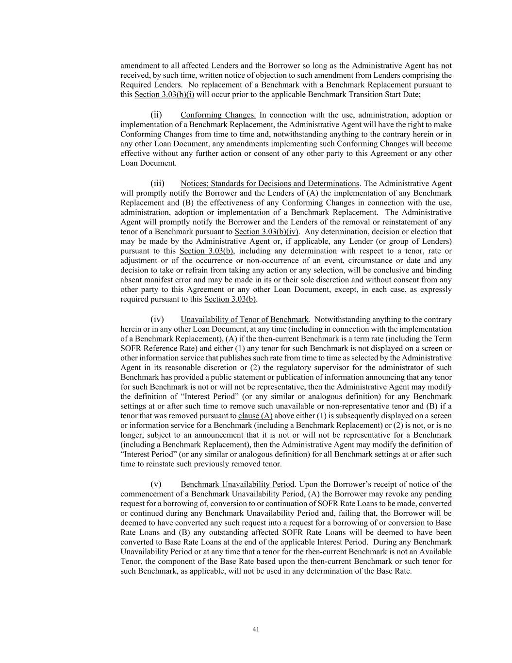 41 amendment to all affected Lenders and the Borrower so long as the Administrative Agent has not received, by such time, written notice of objection to such amendment from Lenders comprising the Required Lenders. No replacement of a Benchmark with a Benchmark Replacement pursuant to this Section 3.03(b)(i) will occur prior to the applicable Benchmark Transition Start Date; (ii) Conforming Changes. In connection with the use, administration, adoption or implementation of a Benchmark Replacement, the Administrative Agent will have the right to make Conforming Changes from time to time and, notwithstanding anything to the contrary herein or in any other Loan Document, any amendments implementing such Conforming Changes will become effective without any further action or consent of any other party to this Agreement or any other Loan Document. (iii) Notices; Standards for Decisions and Determinations. The Administrative Agent will promptly notify the Borrower and the Lenders of (A) the implementation of any Benchmark Replacement and (B) the effectiveness of any Conforming Changes in connection with the use, administration, adoption or implementation of a Benchmark Replacement. The Administrative Agent will promptly notify the Borrower and the Lenders of the removal or reinstatement of any tenor of a Benchmark pursuant to Section 3.03(b)(iv). Any determination, decision or election that may be made by the Administrative Agent or, if applicable, any Lender (or group of Lenders) pursuant to this Section 3.03(b), including any determination with respect to a tenor, rate or adjustment or of the occurrence or non-occurrence of an event, circumstance or date and any decision to take or refrain from taking any action or any selection, will be conclusive and binding absent manifest error and may be made in its or their sole discretion and without consent from any other party to this Agreement or any other Loan Document, except, in each case, as expressly required pursuant to this Section 3.03(b). (iv) Unavailability of Tenor of Benchmark. Notwithstanding anything to the contrary herein or in any other Loan Document, at any time (including in connection with the implementation of a Benchmark Replacement), (A) if the then-current Benchmark is a term rate (including the Term SOFR Reference Rate) and either (1) any tenor for such Benchmark is not displayed on a screen or other information service that publishes such rate from time to time as selected by the Administrative Agent in its reasonable discretion or (2) the regulatory supervisor for the administrator of such Benchmark has provided a public statement or publication of information announcing that any tenor for such Benchmark is not or will not be representative, then the Administrative Agent may modify the definition of “Interest Period” (or any similar or analogous definition) for any Benchmark settings at or after such time to remove such unavailable or non-representative tenor and (B) if a tenor that was removed pursuant to clause (A) above either (1) is subsequently displayed on a screen or information service for a Benchmark (including a Benchmark Replacement) or (2) is not, or is no longer, subject to an announcement that it is not or will not be representative for a Benchmark (including a Benchmark Replacement), then the Administrative Agent may modify the definition of “Interest Period” (or any similar or analogous definition) for all Benchmark settings at or after such time to reinstate such previously removed tenor. (v) Benchmark Unavailability Period. Upon the Borrower’s receipt of notice of the commencement of a Benchmark Unavailability Period, (A) the Borrower may revoke any pending request for a borrowing of, conversion to or continuation of SOFR Rate Loans to be made, converted or continued during any Benchmark Unavailability Period and, failing that, the Borrower will be deemed to have converted any such request into a request for a borrowing of or conversion to Base Rate Loans and (B) any outstanding affected SOFR Rate Loans will be deemed to have been converted to Base Rate Loans at the end of the applicable Interest Period. During any Benchmark Unavailability Period or at any time that a tenor for the then-current Benchmark is not an Available Tenor, the component of the Base Rate based upon the then-current Benchmark or such tenor for such Benchmark, as applicable, will not be used in any determination of the Base Rate.