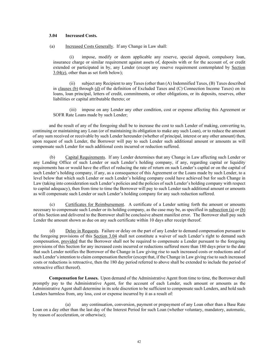 42 3.04 Increased Costs. (a) Increased Costs Generally. If any Change in Law shall: (i) impose, modify or deem applicable any reserve, special deposit, compulsory loan, insurance charge or similar requirement against assets of, deposits with or for the account of, or credit extended or participated in by, any Lender (except any reserve requirement contemplated by Section 3.04(e), other than as set forth below); (ii) subject any Recipient to any Taxes (other than (A) Indemnified Taxes, (B) Taxes described in clauses (b) through (d) of the definition of Excluded Taxes and (C) Connection Income Taxes) on its loans, loan principal, letters of credit, commitments, or other obligations, or its deposits, reserves, other liabilities or capital attributable thereto; or (iii) impose on any Lender any other condition, cost or expense affecting this Agreement or SOFR Rate Loans made by such Lender; and the result of any of the foregoing shall be to increase the cost to such Lender of making, converting to, continuing or maintaining any Loan (or of maintaining its obligation to make any such Loan), or to reduce the amount of any sum received or receivable by such Lender hereunder (whether of principal, interest or any other amount) then, upon request of such Lender, the Borrower will pay to such Lender such additional amount or amounts as will compensate such Lender for such additional costs incurred or reduction suffered. (b) Capital Requirements. If any Lender determines that any Change in Law affecting such Lender or any Lending Office of such Lender or such Lender’s holding company, if any, regarding capital or liquidity requirements has or would have the effect of reducing the rate of return on such Lender’s capital or on the capital of such Lender’s holding company, if any, as a consequence of this Agreement or the Loans made by such Lender, to a level below that which such Lender or such Lender’s holding company could have achieved but for such Change in Law (taking into consideration such Lender’s policies and the policies of such Lender’s holding company with respect to capital adequacy), then from time to time the Borrower will pay to such Lender such additional amount or amounts as will compensate such Lender or such Lender’s holding company for any such reduction suffered. (c) Certificates for Reimbursement. A certificate of a Lender setting forth the amount or amounts necessary to compensate such Lender or its holding company, as the case may be, as specified in subsection (a) or (b) of this Section and delivered to the Borrower shall be conclusive absent manifest error. The Borrower shall pay such Lender the amount shown as due on any such certificate within 10 days after receipt thereof. (d) Delay in Requests. Failure or delay on the part of any Lender to demand compensation pursuant to the foregoing provisions of this Section 3.04 shall not constitute a waiver of such Lender’s right to demand such compensation, provided that the Borrower shall not be required to compensate a Lender pursuant to the foregoing provisions of this Section for any increased costs incurred or reductions suffered more than 180 days prior to the date that such Lender notifies the Borrower of the Change in Law giving rise to such increased costs or reductions and of such Lender’s intention to claim compensation therefor (except that, if the Change in Law giving rise to such increased costs or reductions is retroactive, then the 180 day period referred to above shall be extended to include the period of retroactive effect thereof). Compensation for Losses. Upon demand of the Administrative Agent from time to time, the Borrower shall promptly pay to the Administrative Agent, for the account of each Lender, such amount or amounts as the Administrative Agent shall determine in its sole discretion to be sufficient to compensate such Lenders, and hold such Lenders harmless from, any loss, cost or expense incurred by it as a result of: (a) any continuation, conversion, payment or prepayment of any Loan other than a Base Rate Loan on a day other than the last day of the Interest Period for such Loan (whether voluntary, mandatory, automatic, by reason of acceleration, or otherwise);
