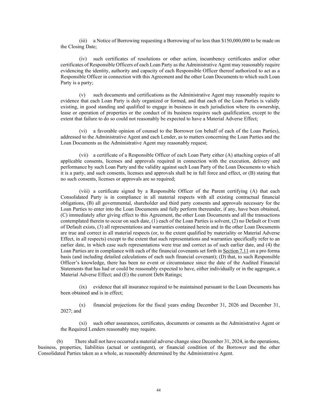44 (iii) a Notice of Borrowing requesting a Borrowing of no less than $150,000,000 to be made on the Closing Date; (iv) such certificates of resolutions or other action, incumbency certificates and/or other certificates of Responsible Officers of each Loan Party as the Administrative Agent may reasonably require evidencing the identity, authority and capacity of each Responsible Officer thereof authorized to act as a Responsible Officer in connection with this Agreement and the other Loan Documents to which such Loan Party is a party; (v) such documents and certifications as the Administrative Agent may reasonably require to evidence that each Loan Party is duly organized or formed, and that each of the Loan Parties is validly existing, in good standing and qualified to engage in business in each jurisdiction where its ownership, lease or operation of properties or the conduct of its business requires such qualification, except to the extent that failure to do so could not reasonably be expected to have a Material Adverse Effect; (vi) a favorable opinion of counsel to the Borrower (on behalf of each of the Loan Parties), addressed to the Administrative Agent and each Lender, as to matters concerning the Loan Parties and the Loan Documents as the Administrative Agent may reasonably request; (vii) a certificate of a Responsible Officer of each Loan Party either (A) attaching copies of all applicable consents, licenses and approvals required in connection with the execution, delivery and performance by such Loan Party and the validity against such Loan Party of the Loan Documents to which it is a party, and such consents, licenses and approvals shall be in full force and effect, or (B) stating that no such consents, licenses or approvals are so required; (viii) a certificate signed by a Responsible Officer of the Parent certifying (A) that each Consolidated Party is in compliance in all material respects with all existing contractual financial obligations, (B) all governmental, shareholder and third party consents and approvals necessary for the Loan Parties to enter into the Loan Documents and fully perform thereunder, if any, have been obtained, (C) immediately after giving effect to this Agreement, the other Loan Documents and all the transactions contemplated therein to occur on such date, (1) each of the Loan Parties is solvent, (2) no Default or Event of Default exists, (3) all representations and warranties contained herein and in the other Loan Documents are true and correct in all material respects (or, to the extent qualified by materiality or Material Adverse Effect, in all respects) except to the extent that such representations and warranties specifically refer to an earlier date, in which case such representations were true and correct as of such earlier date, and (4) the Loan Parties are in compliance with each of the financial covenants set forth in Section 7.11 on a pro forma basis (and including detailed calculations of each such financial covenant); (D) that, to such Responsible Officer’s knowledge, there has been no event or circumstance since the date of the Audited Financial Statements that has had or could be reasonably expected to have, either individually or in the aggregate, a Material Adverse Effect; and (E) the current Debt Ratings; (ix) evidence that all insurance required to be maintained pursuant to the Loan Documents has been obtained and is in effect; (x) financial projections for the fiscal years ending December 31, 2026 and December 31, 2027; and (xi) such other assurances, certificates, documents or consents as the Administrative Agent or the Required Lenders reasonably may require. (b) There shall not have occurred a material adverse change since December 31, 2024, in the operations, business, properties, liabilities (actual or contingent), or financial condition of the Borrower and the other Consolidated Parties taken as a whole, as reasonably determined by the Administrative Agent.