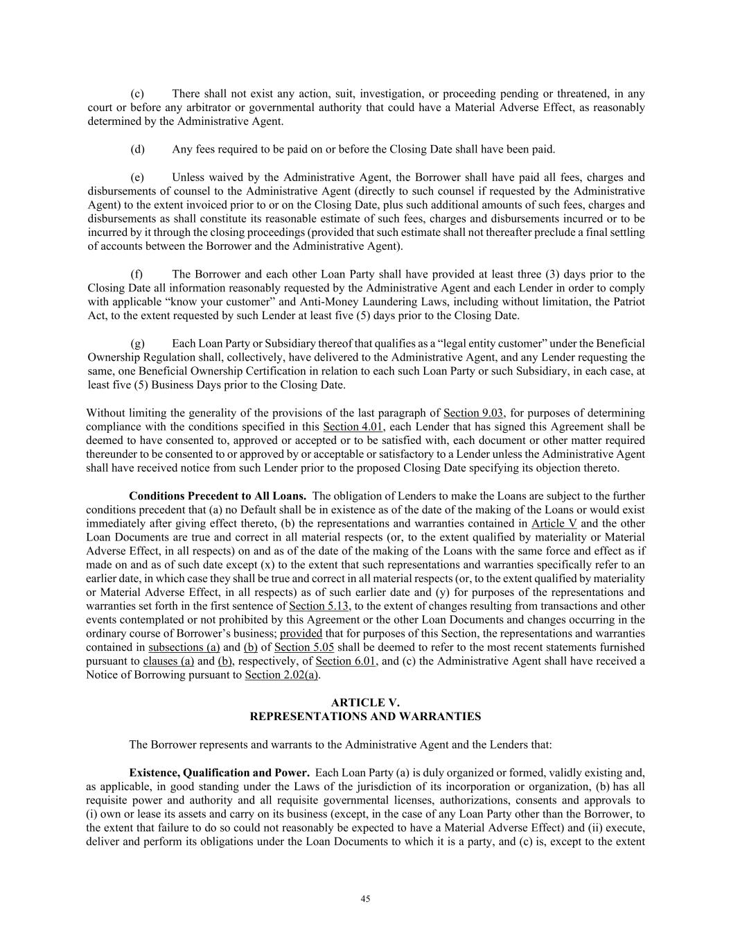 45 (c) There shall not exist any action, suit, investigation, or proceeding pending or threatened, in any court or before any arbitrator or governmental authority that could have a Material Adverse Effect, as reasonably determined by the Administrative Agent. (d) Any fees required to be paid on or before the Closing Date shall have been paid. (e) Unless waived by the Administrative Agent, the Borrower shall have paid all fees, charges and disbursements of counsel to the Administrative Agent (directly to such counsel if requested by the Administrative Agent) to the extent invoiced prior to or on the Closing Date, plus such additional amounts of such fees, charges and disbursements as shall constitute its reasonable estimate of such fees, charges and disbursements incurred or to be incurred by it through the closing proceedings (provided that such estimate shall not thereafter preclude a final settling of accounts between the Borrower and the Administrative Agent). (f) The Borrower and each other Loan Party shall have provided at least three (3) days prior to the Closing Date all information reasonably requested by the Administrative Agent and each Lender in order to comply with applicable “know your customer” and Anti-Money Laundering Laws, including without limitation, the Patriot Act, to the extent requested by such Lender at least five (5) days prior to the Closing Date. (g) Each Loan Party or Subsidiary thereof that qualifies as a “legal entity customer” under the Beneficial Ownership Regulation shall, collectively, have delivered to the Administrative Agent, and any Lender requesting the same, one Beneficial Ownership Certification in relation to each such Loan Party or such Subsidiary, in each case, at least five (5) Business Days prior to the Closing Date. Without limiting the generality of the provisions of the last paragraph of Section 9.03, for purposes of determining compliance with the conditions specified in this Section 4.01, each Lender that has signed this Agreement shall be deemed to have consented to, approved or accepted or to be satisfied with, each document or other matter required thereunder to be consented to or approved by or acceptable or satisfactory to a Lender unless the Administrative Agent shall have received notice from such Lender prior to the proposed Closing Date specifying its objection thereto. Conditions Precedent to All Loans. The obligation of Lenders to make the Loans are subject to the further conditions precedent that (a) no Default shall be in existence as of the date of the making of the Loans or would exist immediately after giving effect thereto, (b) the representations and warranties contained in Article V and the other Loan Documents are true and correct in all material respects (or, to the extent qualified by materiality or Material Adverse Effect, in all respects) on and as of the date of the making of the Loans with the same force and effect as if made on and as of such date except (x) to the extent that such representations and warranties specifically refer to an earlier date, in which case they shall be true and correct in all material respects (or, to the extent qualified by materiality or Material Adverse Effect, in all respects) as of such earlier date and (y) for purposes of the representations and warranties set forth in the first sentence of Section 5.13, to the extent of changes resulting from transactions and other events contemplated or not prohibited by this Agreement or the other Loan Documents and changes occurring in the ordinary course of Borrower’s business; provided that for purposes of this Section, the representations and warranties contained in subsections (a) and (b) of Section 5.05 shall be deemed to refer to the most recent statements furnished pursuant to clauses (a) and (b), respectively, of Section 6.01, and (c) the Administrative Agent shall have received a Notice of Borrowing pursuant to Section 2.02(a). ARTICLE V. REPRESENTATIONS AND WARRANTIES The Borrower represents and warrants to the Administrative Agent and the Lenders that: Existence, Qualification and Power. Each Loan Party (a) is duly organized or formed, validly existing and, as applicable, in good standing under the Laws of the jurisdiction of its incorporation or organization, (b) has all requisite power and authority and all requisite governmental licenses, authorizations, consents and approvals to (i) own or lease its assets and carry on its business (except, in the case of any Loan Party other than the Borrower, to the extent that failure to do so could not reasonably be expected to have a Material Adverse Effect) and (ii) execute, deliver and perform its obligations under the Loan Documents to which it is a party, and (c) is, except to the extent