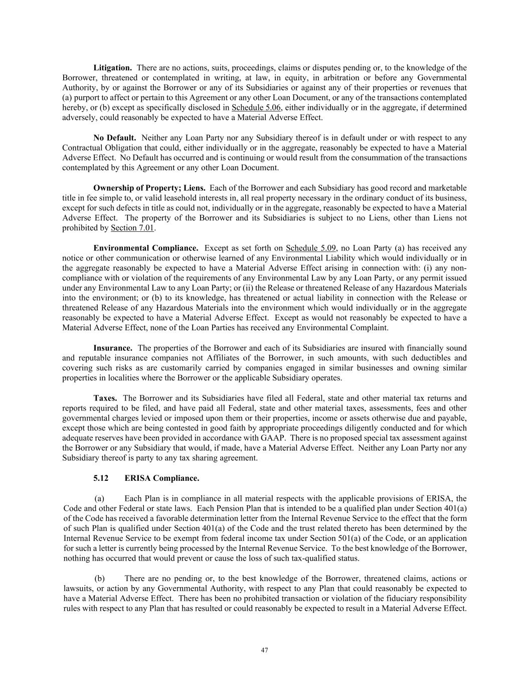 47 Litigation. There are no actions, suits, proceedings, claims or disputes pending or, to the knowledge of the Borrower, threatened or contemplated in writing, at law, in equity, in arbitration or before any Governmental Authority, by or against the Borrower or any of its Subsidiaries or against any of their properties or revenues that (a) purport to affect or pertain to this Agreement or any other Loan Document, or any of the transactions contemplated hereby, or (b) except as specifically disclosed in Schedule 5.06, either individually or in the aggregate, if determined adversely, could reasonably be expected to have a Material Adverse Effect. No Default. Neither any Loan Party nor any Subsidiary thereof is in default under or with respect to any Contractual Obligation that could, either individually or in the aggregate, reasonably be expected to have a Material Adverse Effect. No Default has occurred and is continuing or would result from the consummation of the transactions contemplated by this Agreement or any other Loan Document. Ownership of Property; Liens. Each of the Borrower and each Subsidiary has good record and marketable title in fee simple to, or valid leasehold interests in, all real property necessary in the ordinary conduct of its business, except for such defects in title as could not, individually or in the aggregate, reasonably be expected to have a Material Adverse Effect. The property of the Borrower and its Subsidiaries is subject to no Liens, other than Liens not prohibited by Section 7.01. Environmental Compliance. Except as set forth on Schedule 5.09, no Loan Party (a) has received any notice or other communication or otherwise learned of any Environmental Liability which would individually or in the aggregate reasonably be expected to have a Material Adverse Effect arising in connection with: (i) any non- compliance with or violation of the requirements of any Environmental Law by any Loan Party, or any permit issued under any Environmental Law to any Loan Party; or (ii) the Release or threatened Release of any Hazardous Materials into the environment; or (b) to its knowledge, has threatened or actual liability in connection with the Release or threatened Release of any Hazardous Materials into the environment which would individually or in the aggregate reasonably be expected to have a Material Adverse Effect. Except as would not reasonably be expected to have a Material Adverse Effect, none of the Loan Parties has received any Environmental Complaint. Insurance. The properties of the Borrower and each of its Subsidiaries are insured with financially sound and reputable insurance companies not Affiliates of the Borrower, in such amounts, with such deductibles and covering such risks as are customarily carried by companies engaged in similar businesses and owning similar properties in localities where the Borrower or the applicable Subsidiary operates. Taxes. The Borrower and its Subsidiaries have filed all Federal, state and other material tax returns and reports required to be filed, and have paid all Federal, state and other material taxes, assessments, fees and other governmental charges levied or imposed upon them or their properties, income or assets otherwise due and payable, except those which are being contested in good faith by appropriate proceedings diligently conducted and for which adequate reserves have been provided in accordance with GAAP. There is no proposed special tax assessment against the Borrower or any Subsidiary that would, if made, have a Material Adverse Effect. Neither any Loan Party nor any Subsidiary thereof is party to any tax sharing agreement. 5.12 ERISA Compliance. (a) Each Plan is in compliance in all material respects with the applicable provisions of ERISA, the Code and other Federal or state laws. Each Pension Plan that is intended to be a qualified plan under Section 401(a) of the Code has received a favorable determination letter from the Internal Revenue Service to the effect that the form of such Plan is qualified under Section 401(a) of the Code and the trust related thereto has been determined by the Internal Revenue Service to be exempt from federal income tax under Section 501(a) of the Code, or an application for such a letter is currently being processed by the Internal Revenue Service. To the best knowledge of the Borrower, nothing has occurred that would prevent or cause the loss of such tax-qualified status. (b) There are no pending or, to the best knowledge of the Borrower, threatened claims, actions or lawsuits, or action by any Governmental Authority, with respect to any Plan that could reasonably be expected to have a Material Adverse Effect. There has been no prohibited transaction or violation of the fiduciary responsibility rules with respect to any Plan that has resulted or could reasonably be expected to result in a Material Adverse Effect.