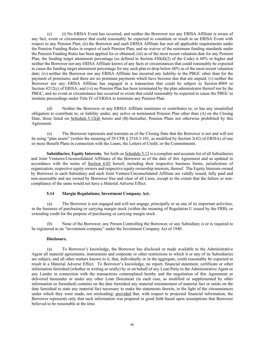 48 (c) (i) No ERISA Event has occurred, and neither the Borrower nor any ERISA Affiliate is aware of any fact, event or circumstance that could reasonably be expected to constitute or result in an ERISA Event with respect to any Pension Plan; (ii) the Borrower and each ERISA Affiliate has met all applicable requirements under the Pension Funding Rules in respect of each Pension Plan, and no waiver of the minimum funding standards under the Pension Funding Rules has been applied for or obtained; (iii) as of the most recent valuation date for any Pension Plan, the funding target attainment percentage (as defined in Section 430(d)(2) of the Code) is 60% or higher and neither the Borrower nor any ERISA Affiliate knows of any facts or circumstances that could reasonably be expected to cause the funding target attainment percentage for any such plan to drop below 60% as of the most recent valuation date; (iv) neither the Borrower nor any ERISA Affiliate has incurred any liability to the PBGC other than for the payment of premiums, and there are no premium payments which have become due that are unpaid; (v) neither the Borrower nor any ERISA Affiliate has engaged in a transaction that could be subject to Section 4069 or Section 4212(c) of ERISA; and (vi) no Pension Plan has been terminated by the plan administrator thereof nor by the PBGC, and no event or circumstance has occurred or exists that could reasonably be expected to cause the PBGC to institute proceedings under Title IV of ERISA to terminate any Pension Plan. (d) Neither the Borrower or any ERISA Affiliate maintains or contributes to, or has any unsatisfied obligation to contribute to, or liability under, any active or terminated Pension Plan other than (A) on the Closing Date, those listed on Schedule 5.12(d) hereto and (B) thereafter, Pension Plans not otherwise prohibited by this Agreement. (e) The Borrower represents and warrants as of the Closing Date that the Borrower is not and will not be using “plan assets” (within the meaning of 29 CFR § 2510.3-101, as modified by Section 3(42) of ERISA) of one or more Benefit Plans in connection with the Loans, the Letters of Credit, or the Commitments. Subsidiaries; Equity Interests. Set forth on Schedule 5.13 is a complete and accurate list of all Subsidiaries and Joint Ventures/Unconsolidated Affiliates of the Borrower as of the date of this Agreement and as updated in accordance with the terms of Section 6.02 hereof, including their respective business forms, jurisdictions of organization, respective equity owners and respective equity ownership interests, thereof. The Equity Interests owned by Borrower in each Subsidiary and each Joint Venture/Unconsolidated Affiliate are validly issued, fully paid and non-assessable and are owned by Borrower free and clear of all Liens, except to the extent that the failure or non- compliance of the same would not have a Material Adverse Effect. 5.14 Margin Regulations; Investment Company Act. (a) The Borrower is not engaged and will not engage, principally or as one of its important activities, in the business of purchasing or carrying margin stock (within the meaning of Regulation U issued by the FRB), or extending credit for the purpose of purchasing or carrying margin stock. (b) None of the Borrower, any Person Controlling the Borrower, or any Subsidiary is or is required to be registered as an “investment company” under the Investment Company Act of 1940. Disclosure. (a) To Borrower’s knowledge, the Borrower has disclosed or made available to the Administrative Agent all material agreements, instruments and corporate or other restrictions to which it or any of its Subsidiaries are subject, and all other matters known to it, that, individually or in the aggregate, could reasonably be expected to result in a Material Adverse Effect. To Borrower’s knowledge, no report, financial statement, certificate or other information furnished (whether in writing or orally) by or on behalf of any Loan Party to the Administrative Agent or any Lender in connection with the transactions contemplated hereby and the negotiation of this Agreement or delivered hereunder or under any other Loan Document (in each case, as modified or supplemented by other information so furnished) contains on the date furnished any material misstatement of material fact or omits on the date furnished to state any material fact necessary to make the statements therein, in the light of the circumstances under which they were made, not misleading; provided that, with respect to projected financial information, the Borrower represents only that such information was prepared in good faith based upon assumptions that Borrower believed to be reasonable at the time.