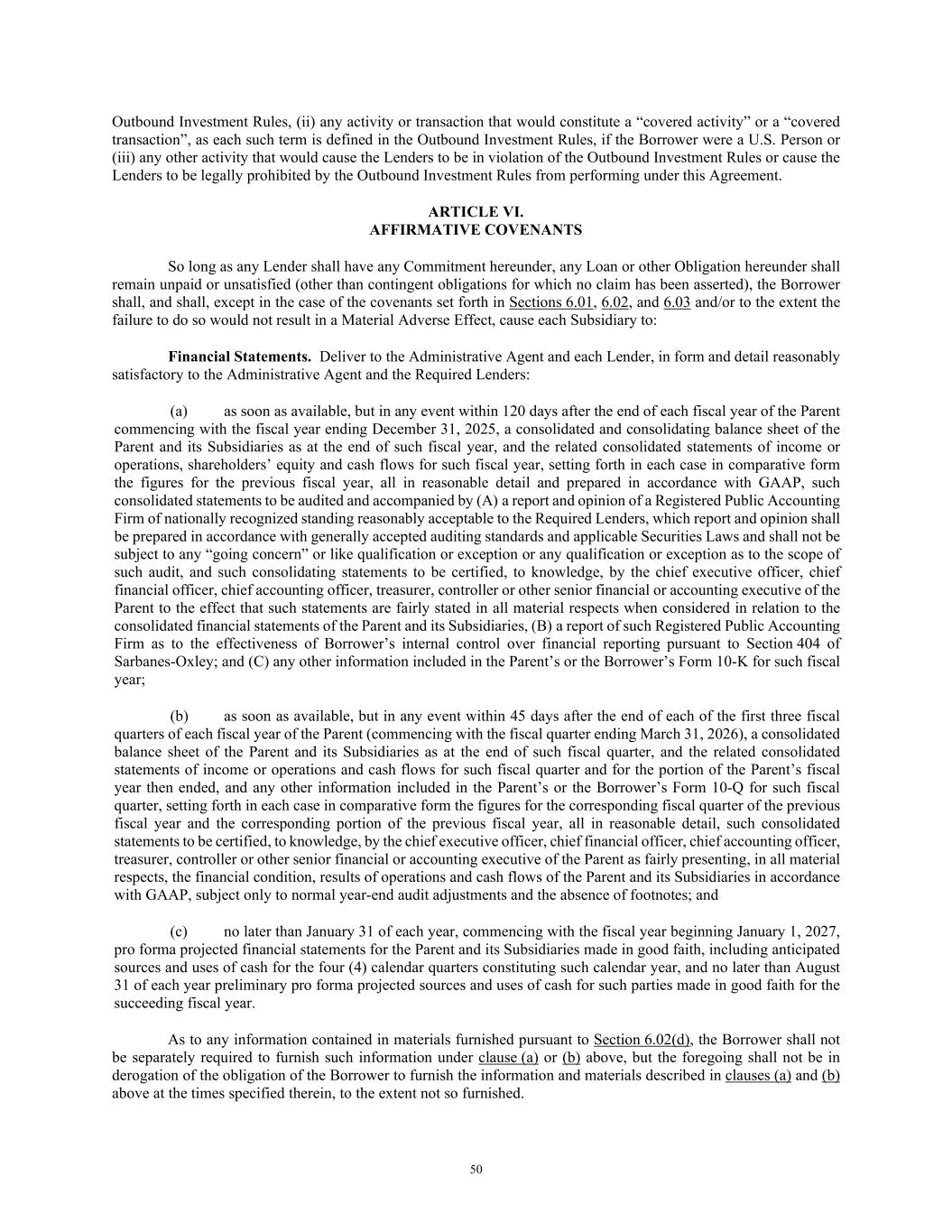 50 Outbound Investment Rules, (ii) any activity or transaction that would constitute a “covered activity” or a “covered transaction”, as each such term is defined in the Outbound Investment Rules, if the Borrower were a U.S. Person or (iii) any other activity that would cause the Lenders to be in violation of the Outbound Investment Rules or cause the Lenders to be legally prohibited by the Outbound Investment Rules from performing under this Agreement. ARTICLE VI. AFFIRMATIVE COVENANTS So long as any Lender shall have any Commitment hereunder, any Loan or other Obligation hereunder shall remain unpaid or unsatisfied (other than contingent obligations for which no claim has been asserted), the Borrower shall, and shall, except in the case of the covenants set forth in Sections 6.01, 6.02, and 6.03 and/or to the extent the failure to do so would not result in a Material Adverse Effect, cause each Subsidiary to: Financial Statements. Deliver to the Administrative Agent and each Lender, in form and detail reasonably satisfactory to the Administrative Agent and the Required Lenders: (a) as soon as available, but in any event within 120 days after the end of each fiscal year of the Parent commencing with the fiscal year ending December 31, 2025, a consolidated and consolidating balance sheet of the Parent and its Subsidiaries as at the end of such fiscal year, and the related consolidated statements of income or operations, shareholders’ equity and cash flows for such fiscal year, setting forth in each case in comparative form the figures for the previous fiscal year, all in reasonable detail and prepared in accordance with GAAP, such consolidated statements to be audited and accompanied by (A) a report and opinion of a Registered Public Accounting Firm of nationally recognized standing reasonably acceptable to the Required Lenders, which report and opinion shall be prepared in accordance with generally accepted auditing standards and applicable Securities Laws and shall not be subject to any “going concern” or like qualification or exception or any qualification or exception as to the scope of such audit, and such consolidating statements to be certified, to knowledge, by the chief executive officer, chief financial officer, chief accounting officer, treasurer, controller or other senior financial or accounting executive of the Parent to the effect that such statements are fairly stated in all material respects when considered in relation to the consolidated financial statements of the Parent and its Subsidiaries, (B) a report of such Registered Public Accounting Firm as to the effectiveness of Borrower’s internal control over financial reporting pursuant to Section 404 of Sarbanes-Oxley; and (C) any other information included in the Parent’s or the Borrower’s Form 10-K for such fiscal year; (b) as soon as available, but in any event within 45 days after the end of each of the first three fiscal quarters of each fiscal year of the Parent (commencing with the fiscal quarter ending March 31, 2026), a consolidated balance sheet of the Parent and its Subsidiaries as at the end of such fiscal quarter, and the related consolidated statements of income or operations and cash flows for such fiscal quarter and for the portion of the Parent’s fiscal year then ended, and any other information included in the Parent’s or the Borrower’s Form 10-Q for such fiscal quarter, setting forth in each case in comparative form the figures for the corresponding fiscal quarter of the previous fiscal year and the corresponding portion of the previous fiscal year, all in reasonable detail, such consolidated statements to be certified, to knowledge, by the chief executive officer, chief financial officer, chief accounting officer, treasurer, controller or other senior financial or accounting executive of the Parent as fairly presenting, in all material respects, the financial condition, results of operations and cash flows of the Parent and its Subsidiaries in accordance with GAAP, subject only to normal year-end audit adjustments and the absence of footnotes; and (c) no later than January 31 of each year, commencing with the fiscal year beginning January 1, 2027, pro forma projected financial statements for the Parent and its Subsidiaries made in good faith, including anticipated sources and uses of cash for the four (4) calendar quarters constituting such calendar year, and no later than August 31 of each year preliminary pro forma projected sources and uses of cash for such parties made in good faith for the succeeding fiscal year. As to any information contained in materials furnished pursuant to Section 6.02(d), the Borrower shall not be separately required to furnish such information under clause (a) or (b) above, but the foregoing shall not be in derogation of the obligation of the Borrower to furnish the information and materials described in clauses (a) and (b) above at the times specified therein, to the extent not so furnished.