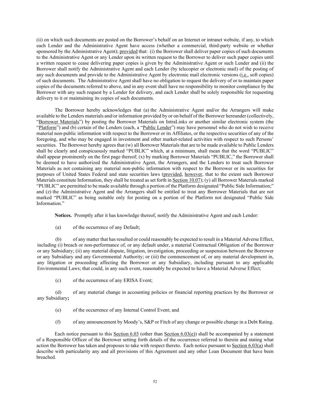 52 (ii) on which such documents are posted on the Borrower’s behalf on an Internet or intranet website, if any, to which each Lender and the Administrative Agent have access (whether a commercial, third-party website or whether sponsored by the Administrative Agent); provided that: (i) the Borrower shall deliver paper copies of such documents to the Administrative Agent or any Lender upon its written request to the Borrower to deliver such paper copies until a written request to cease delivering paper copies is given by the Administrative Agent or such Lender and (ii) the Borrower shall notify the Administrative Agent and each Lender (by telecopier or electronic mail) of the posting of any such documents and provide to the Administrative Agent by electronic mail electronic versions (i.e., soft copies) of such documents. The Administrative Agent shall have no obligation to request the delivery of or to maintain paper copies of the documents referred to above, and in any event shall have no responsibility to monitor compliance by the Borrower with any such request by a Lender for delivery, and each Lender shall be solely responsible for requesting delivery to it or maintaining its copies of such documents. The Borrower hereby acknowledges that (a) the Administrative Agent and/or the Arrangers will make available to the Lenders materials and/or information provided by or on behalf of the Borrower hereunder (collectively, “Borrower Materials”) by posting the Borrower Materials on IntraLinks or another similar electronic system (the “Platform”) and (b) certain of the Lenders (each, a “Public Lender”) may have personnel who do not wish to receive material non-public information with respect to the Borrower or its Affiliates, or the respective securities of any of the foregoing, and who may be engaged in investment and other market-related activities with respect to such Persons’ securities. The Borrower hereby agrees that (w) all Borrower Materials that are to be made available to Public Lenders shall be clearly and conspicuously marked “PUBLIC” which, at a minimum, shall mean that the word “PUBLIC” shall appear prominently on the first page thereof; (x) by marking Borrower Materials “PUBLIC,” the Borrower shall be deemed to have authorized the Administrative Agent, the Arrangers, and the Lenders to treat such Borrower Materials as not containing any material non-public information with respect to the Borrower or its securities for purposes of United States Federal and state securities laws (provided, however, that to the extent such Borrower Materials constitute Information, they shall be treated as set forth in Section 10.07); (y) all Borrower Materials marked “PUBLIC” are permitted to be made available through a portion of the Platform designated “Public Side Information;” and (z) the Administrative Agent and the Arrangers shall be entitled to treat any Borrower Materials that are not marked “PUBLIC” as being suitable only for posting on a portion of the Platform not designated “Public Side Information.” Notices. Promptly after it has knowledge thereof, notify the Administrative Agent and each Lender: (a) of the occurrence of any Default; (b) of any matter that has resulted or could reasonably be expected to result in a Material Adverse Effect, including (i) breach or non-performance of, or any default under, a material Contractual Obligation of the Borrower or any Subsidiary; (ii) any material dispute, litigation, investigation, proceeding or suspension between the Borrower or any Subsidiary and any Governmental Authority; or (iii) the commencement of, or any material development in, any litigation or proceeding affecting the Borrower or any Subsidiary, including pursuant to any applicable Environmental Laws; that could, in any such event, reasonably be expected to have a Material Adverse Effect; (c) of the occurrence of any ERISA Event; (d) of any material change in accounting policies or financial reporting practices by the Borrower or any Subsidiary; (e) of the occurrence of any Internal Control Event; and (f) of any announcement by Moody’s, S&P or Fitch of any change or possible change in a Debt Rating. Each notice pursuant to this Section 6.03 (other than Section 6.03(e)) shall be accompanied by a statement of a Responsible Officer of the Borrower setting forth details of the occurrence referred to therein and stating what action the Borrower has taken and proposes to take with respect thereto. Each notice pursuant to Section 6.03(a) shall describe with particularity any and all provisions of this Agreement and any other Loan Document that have been breached.