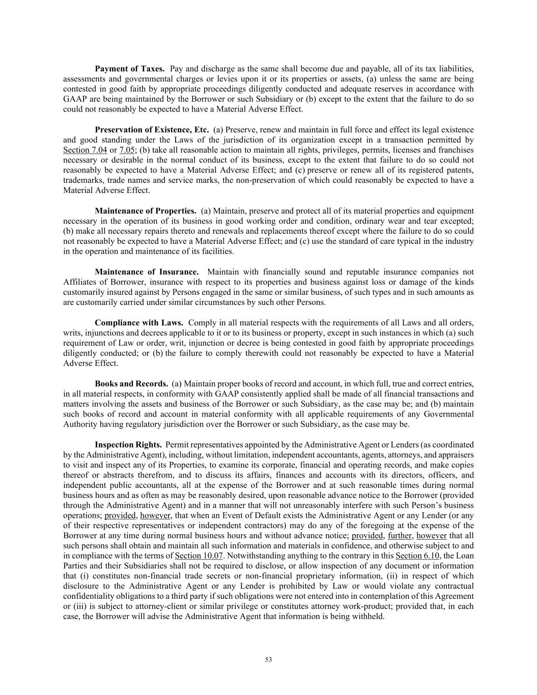 53 Payment of Taxes. Pay and discharge as the same shall become due and payable, all of its tax liabilities, assessments and governmental charges or levies upon it or its properties or assets, (a) unless the same are being contested in good faith by appropriate proceedings diligently conducted and adequate reserves in accordance with GAAP are being maintained by the Borrower or such Subsidiary or (b) except to the extent that the failure to do so could not reasonably be expected to have a Material Adverse Effect. Preservation of Existence, Etc. (a) Preserve, renew and maintain in full force and effect its legal existence and good standing under the Laws of the jurisdiction of its organization except in a transaction permitted by Section 7.04 or 7.05; (b) take all reasonable action to maintain all rights, privileges, permits, licenses and franchises necessary or desirable in the normal conduct of its business, except to the extent that failure to do so could not reasonably be expected to have a Material Adverse Effect; and (c) preserve or renew all of its registered patents, trademarks, trade names and service marks, the non-preservation of which could reasonably be expected to have a Material Adverse Effect. Maintenance of Properties. (a) Maintain, preserve and protect all of its material properties and equipment necessary in the operation of its business in good working order and condition, ordinary wear and tear excepted; (b) make all necessary repairs thereto and renewals and replacements thereof except where the failure to do so could not reasonably be expected to have a Material Adverse Effect; and (c) use the standard of care typical in the industry in the operation and maintenance of its facilities. Maintenance of Insurance. Maintain with financially sound and reputable insurance companies not Affiliates of Borrower, insurance with respect to its properties and business against loss or damage of the kinds customarily insured against by Persons engaged in the same or similar business, of such types and in such amounts as are customarily carried under similar circumstances by such other Persons. Compliance with Laws. Comply in all material respects with the requirements of all Laws and all orders, writs, injunctions and decrees applicable to it or to its business or property, except in such instances in which (a) such requirement of Law or order, writ, injunction or decree is being contested in good faith by appropriate proceedings diligently conducted; or (b) the failure to comply therewith could not reasonably be expected to have a Material Adverse Effect. Books and Records. (a) Maintain proper books of record and account, in which full, true and correct entries, in all material respects, in conformity with GAAP consistently applied shall be made of all financial transactions and matters involving the assets and business of the Borrower or such Subsidiary, as the case may be; and (b) maintain such books of record and account in material conformity with all applicable requirements of any Governmental Authority having regulatory jurisdiction over the Borrower or such Subsidiary, as the case may be. Inspection Rights. Permit representatives appointed by the Administrative Agent or Lenders (as coordinated by the Administrative Agent), including, without limitation, independent accountants, agents, attorneys, and appraisers to visit and inspect any of its Properties, to examine its corporate, financial and operating records, and make copies thereof or abstracts therefrom, and to discuss its affairs, finances and accounts with its directors, officers, and independent public accountants, all at the expense of the Borrower and at such reasonable times during normal business hours and as often as may be reasonably desired, upon reasonable advance notice to the Borrower (provided through the Administrative Agent) and in a manner that will not unreasonably interfere with such Person’s business operations; provided, however, that when an Event of Default exists the Administrative Agent or any Lender (or any of their respective representatives or independent contractors) may do any of the foregoing at the expense of the Borrower at any time during normal business hours and without advance notice; provided, further, however that all such persons shall obtain and maintain all such information and materials in confidence, and otherwise subject to and in compliance with the terms of Section 10.07. Notwithstanding anything to the contrary in this Section 6.10, the Loan Parties and their Subsidiaries shall not be required to disclose, or allow inspection of any document or information that (i) constitutes non-financial trade secrets or non-financial proprietary information, (ii) in respect of which disclosure to the Administrative Agent or any Lender is prohibited by Law or would violate any contractual confidentiality obligations to a third party if such obligations were not entered into in contemplation of this Agreement or (iii) is subject to attorney-client or similar privilege or constitutes attorney work-product; provided that, in each case, the Borrower will advise the Administrative Agent that information is being withheld.