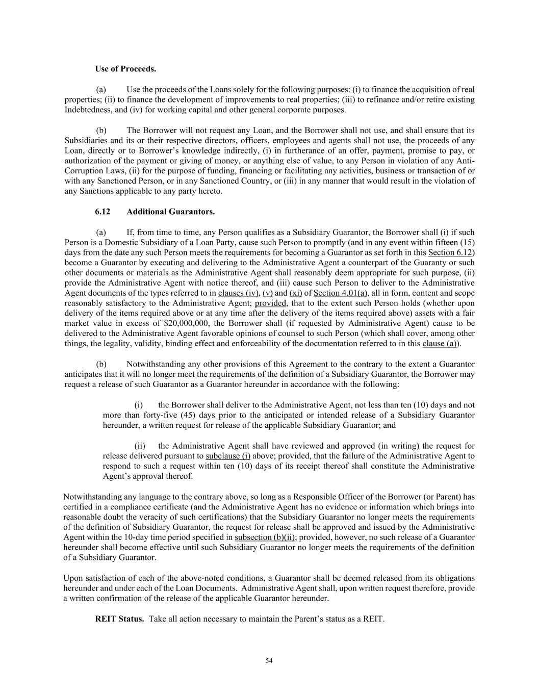 54 Use of Proceeds. (a) Use the proceeds of the Loans solely for the following purposes: (i) to finance the acquisition of real properties; (ii) to finance the development of improvements to real properties; (iii) to refinance and/or retire existing Indebtedness, and (iv) for working capital and other general corporate purposes. (b) The Borrower will not request any Loan, and the Borrower shall not use, and shall ensure that its Subsidiaries and its or their respective directors, officers, employees and agents shall not use, the proceeds of any Loan, directly or to Borrower’s knowledge indirectly, (i) in furtherance of an offer, payment, promise to pay, or authorization of the payment or giving of money, or anything else of value, to any Person in violation of any Anti- Corruption Laws, (ii) for the purpose of funding, financing or facilitating any activities, business or transaction of or with any Sanctioned Person, or in any Sanctioned Country, or (iii) in any manner that would result in the violation of any Sanctions applicable to any party hereto. 6.12 Additional Guarantors. (a) If, from time to time, any Person qualifies as a Subsidiary Guarantor, the Borrower shall (i) if such Person is a Domestic Subsidiary of a Loan Party, cause such Person to promptly (and in any event within fifteen (15) days from the date any such Person meets the requirements for becoming a Guarantor as set forth in this Section 6.12) become a Guarantor by executing and delivering to the Administrative Agent a counterpart of the Guaranty or such other documents or materials as the Administrative Agent shall reasonably deem appropriate for such purpose, (ii) provide the Administrative Agent with notice thereof, and (iii) cause such Person to deliver to the Administrative Agent documents of the types referred to in clauses (iv), (v) and (xi) of Section 4.01(a), all in form, content and scope reasonably satisfactory to the Administrative Agent; provided, that to the extent such Person holds (whether upon delivery of the items required above or at any time after the delivery of the items required above) assets with a fair market value in excess of $20,000,000, the Borrower shall (if requested by Administrative Agent) cause to be delivered to the Administrative Agent favorable opinions of counsel to such Person (which shall cover, among other things, the legality, validity, binding effect and enforceability of the documentation referred to in this clause (a)). (b) Notwithstanding any other provisions of this Agreement to the contrary to the extent a Guarantor anticipates that it will no longer meet the requirements of the definition of a Subsidiary Guarantor, the Borrower may request a release of such Guarantor as a Guarantor hereunder in accordance with the following: (i) the Borrower shall deliver to the Administrative Agent, not less than ten (10) days and not more than forty-five (45) days prior to the anticipated or intended release of a Subsidiary Guarantor hereunder, a written request for release of the applicable Subsidiary Guarantor; and (ii) the Administrative Agent shall have reviewed and approved (in writing) the request for release delivered pursuant to subclause (i) above; provided, that the failure of the Administrative Agent to respond to such a request within ten (10) days of its receipt thereof shall constitute the Administrative Agent’s approval thereof. Notwithstanding any language to the contrary above, so long as a Responsible Officer of the Borrower (or Parent) has certified in a compliance certificate (and the Administrative Agent has no evidence or information which brings into reasonable doubt the veracity of such certifications) that the Subsidiary Guarantor no longer meets the requirements of the definition of Subsidiary Guarantor, the request for release shall be approved and issued by the Administrative Agent within the 10-day time period specified in subsection (b)(ii); provided, however, no such release of a Guarantor hereunder shall become effective until such Subsidiary Guarantor no longer meets the requirements of the definition of a Subsidiary Guarantor. Upon satisfaction of each of the above-noted conditions, a Guarantor shall be deemed released from its obligations hereunder and under each of the Loan Documents. Administrative Agent shall, upon written request therefore, provide a written confirmation of the release of the applicable Guarantor hereunder. REIT Status. Take all action necessary to maintain the Parent’s status as a REIT.