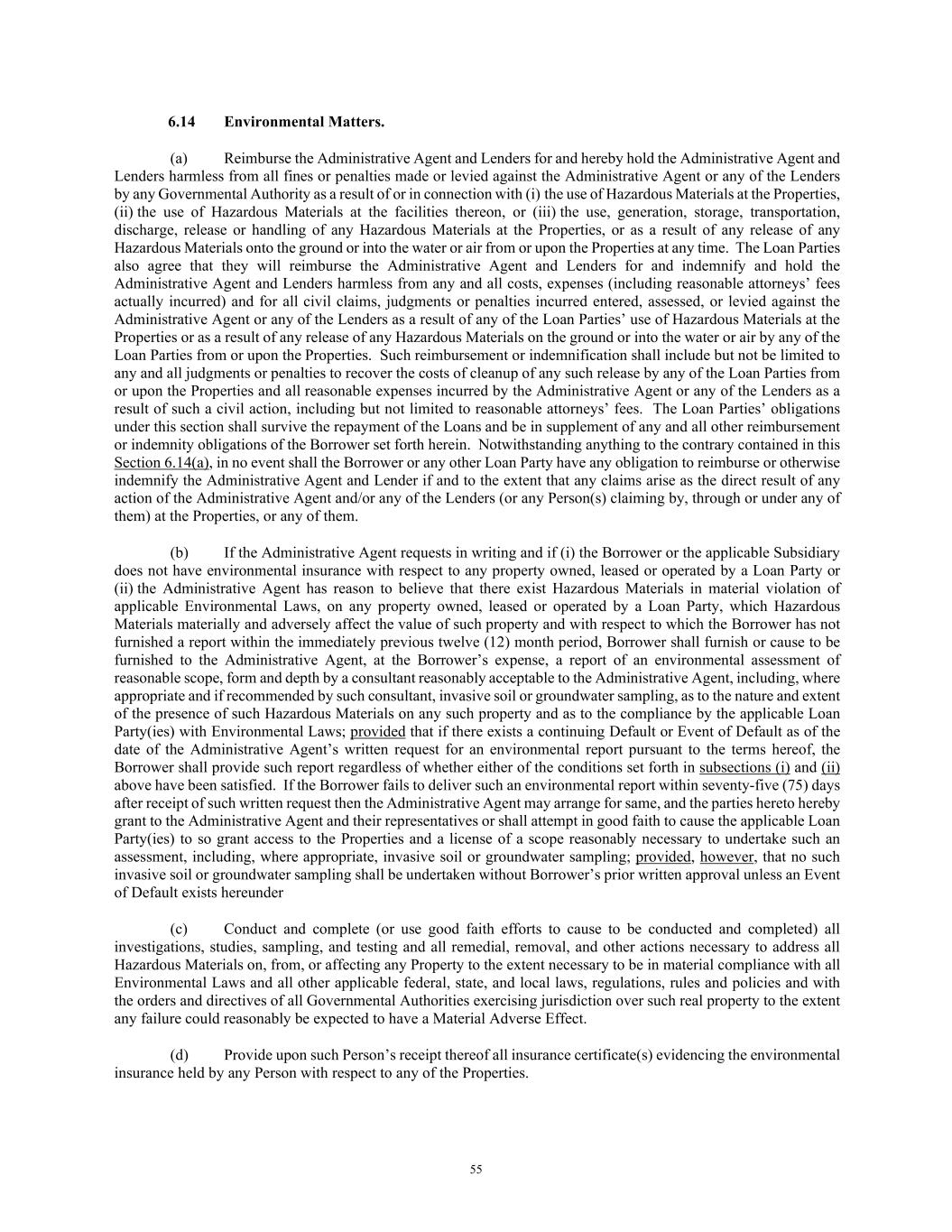 55 6.14 Environmental Matters. (a) Reimburse the Administrative Agent and Lenders for and hereby hold the Administrative Agent and Lenders harmless from all fines or penalties made or levied against the Administrative Agent or any of the Lenders by any Governmental Authority as a result of or in connection with (i) the use of Hazardous Materials at the Properties, (ii) the use of Hazardous Materials at the facilities thereon, or (iii) the use, generation, storage, transportation, discharge, release or handling of any Hazardous Materials at the Properties, or as a result of any release of any Hazardous Materials onto the ground or into the water or air from or upon the Properties at any time. The Loan Parties also agree that they will reimburse the Administrative Agent and Lenders for and indemnify and hold the Administrative Agent and Lenders harmless from any and all costs, expenses (including reasonable attorneys’ fees actually incurred) and for all civil claims, judgments or penalties incurred entered, assessed, or levied against the Administrative Agent or any of the Lenders as a result of any of the Loan Parties’ use of Hazardous Materials at the Properties or as a result of any release of any Hazardous Materials on the ground or into the water or air by any of the Loan Parties from or upon the Properties. Such reimbursement or indemnification shall include but not be limited to any and all judgments or penalties to recover the costs of cleanup of any such release by any of the Loan Parties from or upon the Properties and all reasonable expenses incurred by the Administrative Agent or any of the Lenders as a result of such a civil action, including but not limited to reasonable attorneys’ fees. The Loan Parties’ obligations under this section shall survive the repayment of the Loans and be in supplement of any and all other reimbursement or indemnity obligations of the Borrower set forth herein. Notwithstanding anything to the contrary contained in this Section 6.14(a), in no event shall the Borrower or any other Loan Party have any obligation to reimburse or otherwise indemnify the Administrative Agent and Lender if and to the extent that any claims arise as the direct result of any action of the Administrative Agent and/or any of the Lenders (or any Person(s) claiming by, through or under any of them) at the Properties, or any of them. (b) If the Administrative Agent requests in writing and if (i) the Borrower or the applicable Subsidiary does not have environmental insurance with respect to any property owned, leased or operated by a Loan Party or (ii) the Administrative Agent has reason to believe that there exist Hazardous Materials in material violation of applicable Environmental Laws, on any property owned, leased or operated by a Loan Party, which Hazardous Materials materially and adversely affect the value of such property and with respect to which the Borrower has not furnished a report within the immediately previous twelve (12) month period, Borrower shall furnish or cause to be furnished to the Administrative Agent, at the Borrower’s expense, a report of an environmental assessment of reasonable scope, form and depth by a consultant reasonably acceptable to the Administrative Agent, including, where appropriate and if recommended by such consultant, invasive soil or groundwater sampling, as to the nature and extent of the presence of such Hazardous Materials on any such property and as to the compliance by the applicable Loan Party(ies) with Environmental Laws; provided that if there exists a continuing Default or Event of Default as of the date of the Administrative Agent’s written request for an environmental report pursuant to the terms hereof, the Borrower shall provide such report regardless of whether either of the conditions set forth in subsections (i) and (ii) above have been satisfied. If the Borrower fails to deliver such an environmental report within seventy-five (75) days after receipt of such written request then the Administrative Agent may arrange for same, and the parties hereto hereby grant to the Administrative Agent and their representatives or shall attempt in good faith to cause the applicable Loan Party(ies) to so grant access to the Properties and a license of a scope reasonably necessary to undertake such an assessment, including, where appropriate, invasive soil or groundwater sampling; provided, however, that no such invasive soil or groundwater sampling shall be undertaken without Borrower’s prior written approval unless an Event of Default exists hereunder (c) Conduct and complete (or use good faith efforts to cause to be conducted and completed) all investigations, studies, sampling, and testing and all remedial, removal, and other actions necessary to address all Hazardous Materials on, from, or affecting any Property to the extent necessary to be in material compliance with all Environmental Laws and all other applicable federal, state, and local laws, regulations, rules and policies and with the orders and directives of all Governmental Authorities exercising jurisdiction over such real property to the extent any failure could reasonably be expected to have a Material Adverse Effect. (d) Provide upon such Person’s receipt thereof all insurance certificate(s) evidencing the environmental insurance held by any Person with respect to any of the Properties.