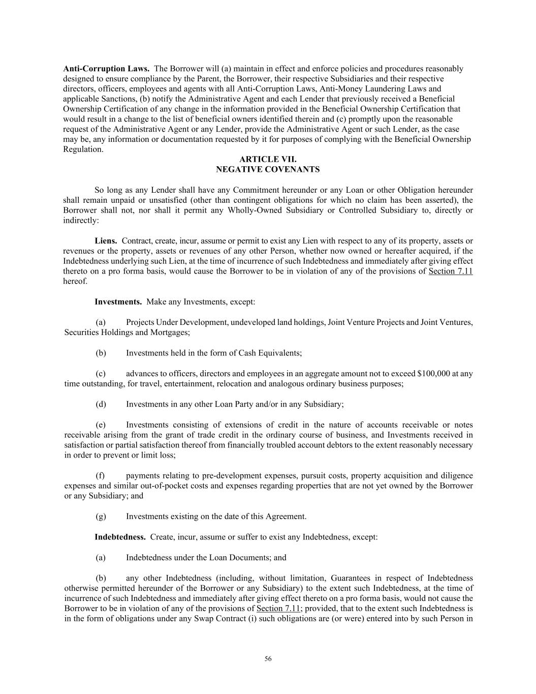56 Anti-Corruption Laws. The Borrower will (a) maintain in effect and enforce policies and procedures reasonably designed to ensure compliance by the Parent, the Borrower, their respective Subsidiaries and their respective directors, officers, employees and agents with all Anti-Corruption Laws, Anti-Money Laundering Laws and applicable Sanctions, (b) notify the Administrative Agent and each Lender that previously received a Beneficial Ownership Certification of any change in the information provided in the Beneficial Ownership Certification that would result in a change to the list of beneficial owners identified therein and (c) promptly upon the reasonable request of the Administrative Agent or any Lender, provide the Administrative Agent or such Lender, as the case may be, any information or documentation requested by it for purposes of complying with the Beneficial Ownership Regulation. ARTICLE VII. NEGATIVE COVENANTS So long as any Lender shall have any Commitment hereunder or any Loan or other Obligation hereunder shall remain unpaid or unsatisfied (other than contingent obligations for which no claim has been asserted), the Borrower shall not, nor shall it permit any Wholly-Owned Subsidiary or Controlled Subsidiary to, directly or indirectly: Liens. Contract, create, incur, assume or permit to exist any Lien with respect to any of its property, assets or revenues or the property, assets or revenues of any other Person, whether now owned or hereafter acquired, if the Indebtedness underlying such Lien, at the time of incurrence of such Indebtedness and immediately after giving effect thereto on a pro forma basis, would cause the Borrower to be in violation of any of the provisions of Section 7.11 hereof. Investments. Make any Investments, except: (a) Projects Under Development, undeveloped land holdings, Joint Venture Projects and Joint Ventures, Securities Holdings and Mortgages; (b) Investments held in the form of Cash Equivalents; (c) advances to officers, directors and employees in an aggregate amount not to exceed $100,000 at any time outstanding, for travel, entertainment, relocation and analogous ordinary business purposes; (d) Investments in any other Loan Party and/or in any Subsidiary; (e) Investments consisting of extensions of credit in the nature of accounts receivable or notes receivable arising from the grant of trade credit in the ordinary course of business, and Investments received in satisfaction or partial satisfaction thereof from financially troubled account debtors to the extent reasonably necessary in order to prevent or limit loss; (f) payments relating to pre-development expenses, pursuit costs, property acquisition and diligence expenses and similar out-of-pocket costs and expenses regarding properties that are not yet owned by the Borrower or any Subsidiary; and (g) Investments existing on the date of this Agreement. Indebtedness. Create, incur, assume or suffer to exist any Indebtedness, except: (a) Indebtedness under the Loan Documents; and (b) any other Indebtedness (including, without limitation, Guarantees in respect of Indebtedness otherwise permitted hereunder of the Borrower or any Subsidiary) to the extent such Indebtedness, at the time of incurrence of such Indebtedness and immediately after giving effect thereto on a pro forma basis, would not cause the Borrower to be in violation of any of the provisions of Section 7.11; provided, that to the extent such Indebtedness is in the form of obligations under any Swap Contract (i) such obligations are (or were) entered into by such Person in