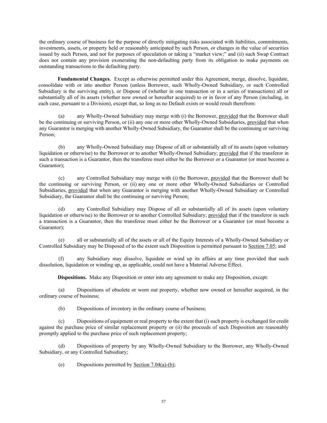 57 the ordinary course of business for the purpose of directly mitigating risks associated with liabilities, commitments, investments, assets, or property held or reasonably anticipated by such Person, or changes in the value of securities issued by such Person, and not for purposes of speculation or taking a “market view;” and (ii) such Swap Contract does not contain any provision exonerating the non-defaulting party from its obligation to make payments on outstanding transactions to the defaulting party. Fundamental Changes. Except as otherwise permitted under this Agreement, merge, dissolve, liquidate, consolidate with or into another Person (unless Borrower, such Wholly-Owned Subsidiary, or such Controlled Subsidiary is the surviving entity), or Dispose of (whether in one transaction or in a series of transactions) all or substantially all of its assets (whether now owned or hereafter acquired) to or in favor of any Person (including, in each case, pursuant to a Division), except that, so long as no Default exists or would result therefrom: (a) any Wholly-Owned Subsidiary may merge with (i) the Borrower, provided that the Borrower shall be the continuing or surviving Person, or (ii) any one or more other Wholly-Owned Subsidiaries, provided that when any Guarantor is merging with another Wholly-Owned Subsidiary, the Guarantor shall be the continuing or surviving Person; (b) any Wholly-Owned Subsidiary may Dispose of all or substantially all of its assets (upon voluntary liquidation or otherwise) to the Borrower or to another Wholly-Owned Subsidiary; provided that if the transferor in such a transaction is a Guarantor, then the transferee must either be the Borrower or a Guarantor (or must become a Guarantor); (c) any Controlled Subsidiary may merge with (i) the Borrower, provided that the Borrower shall be the continuing or surviving Person, or (ii) any one or more other Wholly-Owned Subsidiaries or Controlled Subsidiaries, provided that when any Guarantor is merging with another Wholly-Owned Subsidiary or Controlled Subsidiary, the Guarantor shall be the continuing or surviving Person; (d) any Controlled Subsidiary may Dispose of all or substantially all of its assets (upon voluntary liquidation or otherwise) to the Borrower or to another Controlled Subsidiary; provided that if the transferor in such a transaction is a Guarantor, then the transferee must either be the Borrower or a Guarantor (or must become a Guarantor); (e) all or substantially all of the assets or all of the Equity Interests of a Wholly-Owned Subsidiary or Controlled Subsidiary may be Disposed of to the extent such Disposition is permitted pursuant to Section 7.05; and (f) any Subsidiary may dissolve, liquidate or wind up its affairs at any time provided that such dissolution, liquidation or winding up, as applicable, could not have a Material Adverse Effect. Dispositions. Make any Disposition or enter into any agreement to make any Disposition, except: (a) Dispositions of obsolete or worn out property, whether now owned or hereafter acquired, in the ordinary course of business; (b) Dispositions of inventory in the ordinary course of business; (c) Dispositions of equipment or real property to the extent that (i) such property is exchanged for credit against the purchase price of similar replacement property or (ii) the proceeds of such Disposition are reasonably promptly applied to the purchase price of such replacement property; (d) Dispositions of property by any Wholly-Owned Subsidiary to the Borrower, any Wholly-Owned Subsidiary, or any Controlled Subsidiary; (e) Dispositions permitted by Section 7.04(a)-(b);
