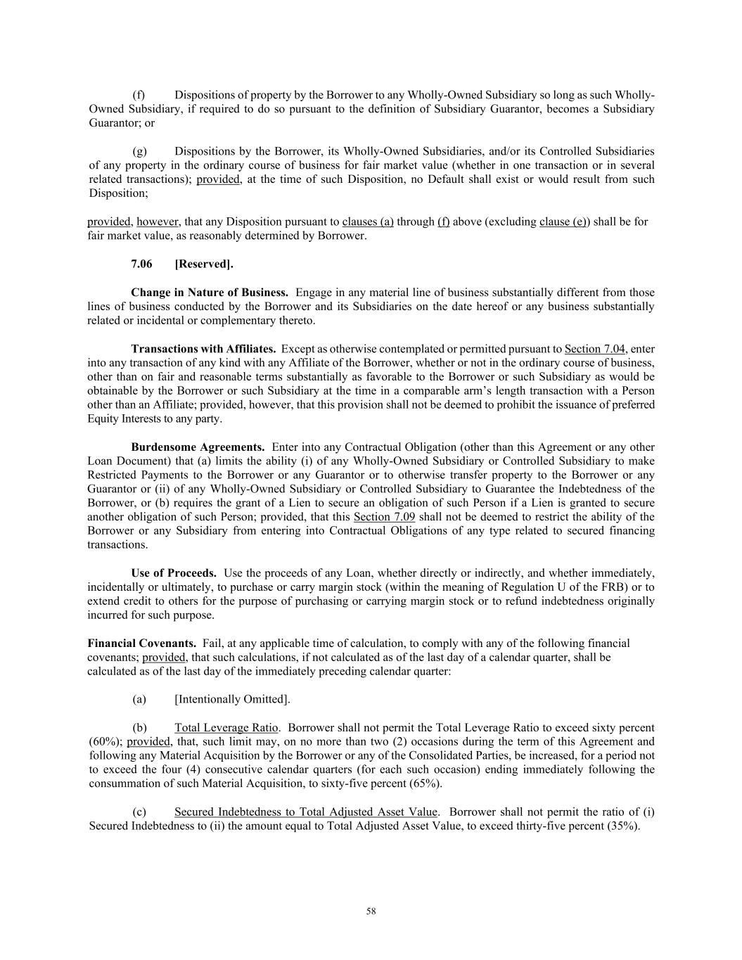 58 (f) Dispositions of property by the Borrower to any Wholly-Owned Subsidiary so long as such Wholly- Owned Subsidiary, if required to do so pursuant to the definition of Subsidiary Guarantor, becomes a Subsidiary Guarantor; or (g) Dispositions by the Borrower, its Wholly-Owned Subsidiaries, and/or its Controlled Subsidiaries of any property in the ordinary course of business for fair market value (whether in one transaction or in several related transactions); provided, at the time of such Disposition, no Default shall exist or would result from such Disposition; provided, however, that any Disposition pursuant to clauses (a) through (f) above (excluding clause (e)) shall be for fair market value, as reasonably determined by Borrower. 7.06 [Reserved]. Change in Nature of Business. Engage in any material line of business substantially different from those lines of business conducted by the Borrower and its Subsidiaries on the date hereof or any business substantially related or incidental or complementary thereto. Transactions with Affiliates. Except as otherwise contemplated or permitted pursuant to Section 7.04, enter into any transaction of any kind with any Affiliate of the Borrower, whether or not in the ordinary course of business, other than on fair and reasonable terms substantially as favorable to the Borrower or such Subsidiary as would be obtainable by the Borrower or such Subsidiary at the time in a comparable arm’s length transaction with a Person other than an Affiliate; provided, however, that this provision shall not be deemed to prohibit the issuance of preferred Equity Interests to any party. Burdensome Agreements. Enter into any Contractual Obligation (other than this Agreement or any other Loan Document) that (a) limits the ability (i) of any Wholly-Owned Subsidiary or Controlled Subsidiary to make Restricted Payments to the Borrower or any Guarantor or to otherwise transfer property to the Borrower or any Guarantor or (ii) of any Wholly-Owned Subsidiary or Controlled Subsidiary to Guarantee the Indebtedness of the Borrower, or (b) requires the grant of a Lien to secure an obligation of such Person if a Lien is granted to secure another obligation of such Person; provided, that this Section 7.09 shall not be deemed to restrict the ability of the Borrower or any Subsidiary from entering into Contractual Obligations of any type related to secured financing transactions. Use of Proceeds. Use the proceeds of any Loan, whether directly or indirectly, and whether immediately, incidentally or ultimately, to purchase or carry margin stock (within the meaning of Regulation U of the FRB) or to extend credit to others for the purpose of purchasing or carrying margin stock or to refund indebtedness originally incurred for such purpose. Financial Covenants. Fail, at any applicable time of calculation, to comply with any of the following financial covenants; provided, that such calculations, if not calculated as of the last day of a calendar quarter, shall be calculated as of the last day of the immediately preceding calendar quarter: (a) [Intentionally Omitted]. (b) Total Leverage Ratio. Borrower shall not permit the Total Leverage Ratio to exceed sixty percent (60%); provided, that, such limit may, on no more than two (2) occasions during the term of this Agreement and following any Material Acquisition by the Borrower or any of the Consolidated Parties, be increased, for a period not to exceed the four (4) consecutive calendar quarters (for each such occasion) ending immediately following the consummation of such Material Acquisition, to sixty-five percent (65%). (c) Secured Indebtedness to Total Adjusted Asset Value. Borrower shall not permit the ratio of (i) Secured Indebtedness to (ii) the amount equal to Total Adjusted Asset Value, to exceed thirty-five percent (35%).