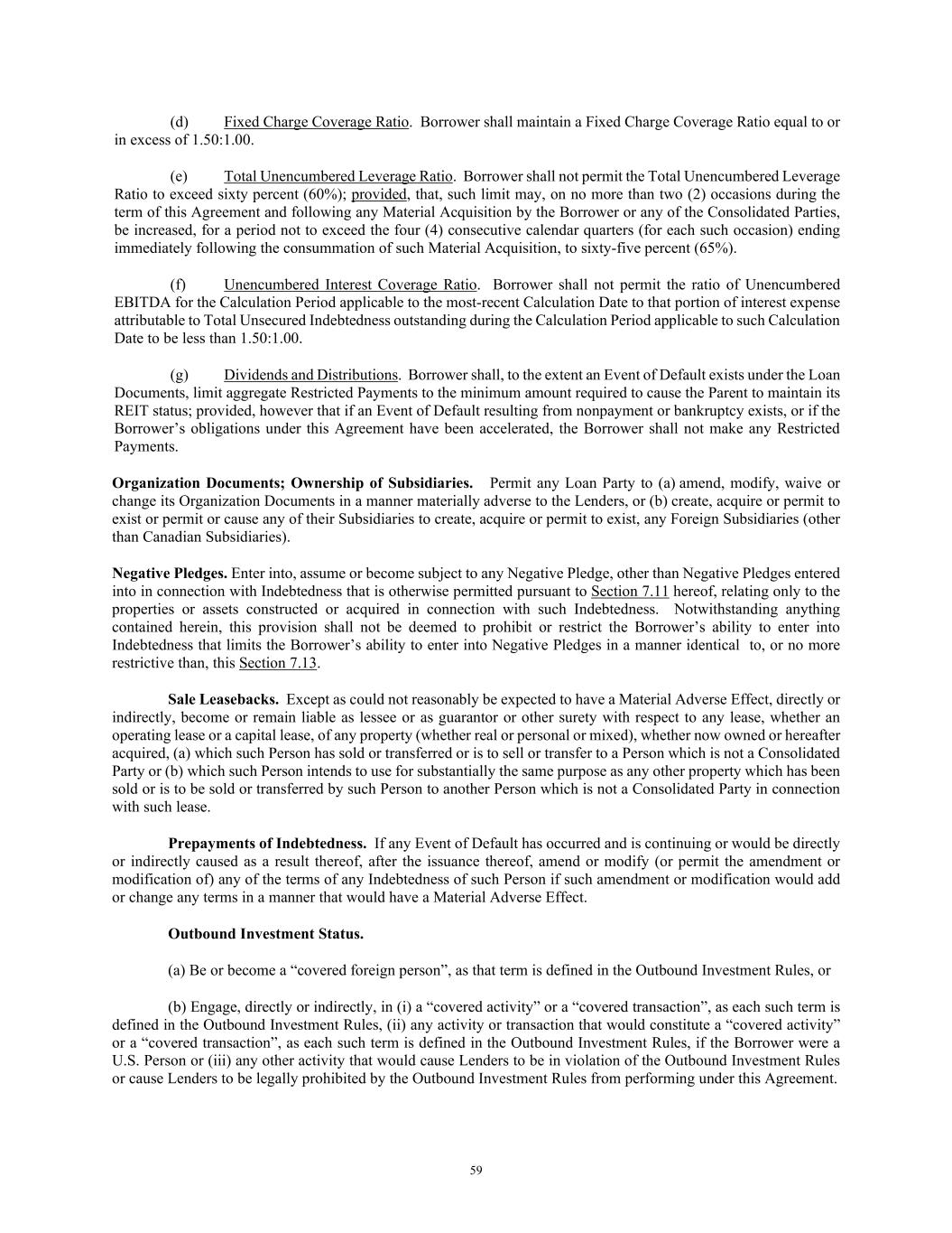 59 (d) Fixed Charge Coverage Ratio. Borrower shall maintain a Fixed Charge Coverage Ratio equal to or in excess of 1.50:1.00. (e) Total Unencumbered Leverage Ratio. Borrower shall not permit the Total Unencumbered Leverage Ratio to exceed sixty percent (60%); provided, that, such limit may, on no more than two (2) occasions during the term of this Agreement and following any Material Acquisition by the Borrower or any of the Consolidated Parties, be increased, for a period not to exceed the four (4) consecutive calendar quarters (for each such occasion) ending immediately following the consummation of such Material Acquisition, to sixty-five percent (65%). (f) Unencumbered Interest Coverage Ratio. Borrower shall not permit the ratio of Unencumbered EBITDA for the Calculation Period applicable to the most-recent Calculation Date to that portion of interest expense attributable to Total Unsecured Indebtedness outstanding during the Calculation Period applicable to such Calculation Date to be less than 1.50:1.00. (g) Dividends and Distributions. Borrower shall, to the extent an Event of Default exists under the Loan Documents, limit aggregate Restricted Payments to the minimum amount required to cause the Parent to maintain its REIT status; provided, however that if an Event of Default resulting from nonpayment or bankruptcy exists, or if the Borrower’s obligations under this Agreement have been accelerated, the Borrower shall not make any Restricted Payments. Organization Documents; Ownership of Subsidiaries. Permit any Loan Party to (a) amend, modify, waive or change its Organization Documents in a manner materially adverse to the Lenders, or (b) create, acquire or permit to exist or permit or cause any of their Subsidiaries to create, acquire or permit to exist, any Foreign Subsidiaries (other than Canadian Subsidiaries). Negative Pledges. Enter into, assume or become subject to any Negative Pledge, other than Negative Pledges entered into in connection with Indebtedness that is otherwise permitted pursuant to Section 7.11 hereof, relating only to the properties or assets constructed or acquired in connection with such Indebtedness. Notwithstanding anything contained herein, this provision shall not be deemed to prohibit or restrict the Borrower’s ability to enter into Indebtedness that limits the Borrower’s ability to enter into Negative Pledges in a manner identical to, or no more restrictive than, this Section 7.13. Sale Leasebacks. Except as could not reasonably be expected to have a Material Adverse Effect, directly or indirectly, become or remain liable as lessee or as guarantor or other surety with respect to any lease, whether an operating lease or a capital lease, of any property (whether real or personal or mixed), whether now owned or hereafter acquired, (a) which such Person has sold or transferred or is to sell or transfer to a Person which is not a Consolidated Party or (b) which such Person intends to use for substantially the same purpose as any other property which has been sold or is to be sold or transferred by such Person to another Person which is not a Consolidated Party in connection with such lease. Prepayments of Indebtedness. If any Event of Default has occurred and is continuing or would be directly or indirectly caused as a result thereof, after the issuance thereof, amend or modify (or permit the amendment or modification of) any of the terms of any Indebtedness of such Person if such amendment or modification would add or change any terms in a manner that would have a Material Adverse Effect. Outbound Investment Status. (a) Be or become a “covered foreign person”, as that term is defined in the Outbound Investment Rules, or (b) Engage, directly or indirectly, in (i) a “covered activity” or a “covered transaction”, as each such term is defined in the Outbound Investment Rules, (ii) any activity or transaction that would constitute a “covered activity” or a “covered transaction”, as each such term is defined in the Outbound Investment Rules, if the Borrower were a U.S. Person or (iii) any other activity that would cause Lenders to be in violation of the Outbound Investment Rules or cause Lenders to be legally prohibited by the Outbound Investment Rules from performing under this Agreement.