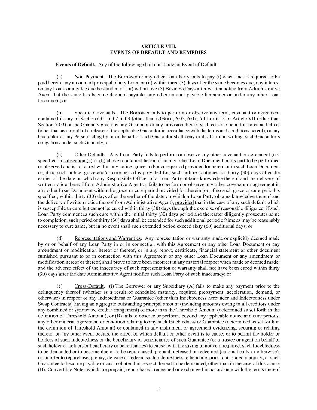 60 ARTICLE VIII. EVENTS OF DEFAULT AND REMEDIES Events of Default. Any of the following shall constitute an Event of Default: (a) Non-Payment. The Borrower or any other Loan Party fails to pay (i) when and as required to be paid herein, any amount of principal of any Loan, or (ii) within three (3) days after the same becomes due, any interest on any Loan, or any fee due hereunder, or (iii) within five (5) Business Days after written notice from Administrative Agent that the same has become due and payable, any other amount payable hereunder or under any other Loan Document; or (b) Specific Covenants. The Borrower fails to perform or observe any term, covenant or agreement contained in any of Section 6.01, 6.02, 6.03 (other than 6.03(a)), 6.05, 6.07, 6.11 or 6.13 or Article VII (other than Section 7.09) or the Guaranty given by any Guarantor or any provision thereof shall cease to be in full force and effect (other than as a result of a release of the applicable Guarantor in accordance with the terms and conditions hereof), or any Guarantor or any Person acting by or on behalf of such Guarantor shall deny or disaffirm, in writing, such Guarantor’s obligations under such Guaranty; or (c) Other Defaults. Any Loan Party fails to perform or observe any other covenant or agreement (not specified in subsection (a) or (b) above) contained herein or in any other Loan Document on its part to be performed or observed and is not cured within any notice, grace and/or cure period provided for herein or in such Loan Document or, if no such notice, grace and/or cure period is provided for, such failure continues for thirty (30) days after the earlier of the date on which any Responsible Officer of a Loan Party obtains knowledge thereof and the delivery of written notice thereof from Administrative Agent or fails to perform or observe any other covenant or agreement in any other Loan Document within the grace or cure period provided for therein (or, if no such grace or cure period is specified, within thirty (30) days after the earlier of the date on which a Loan Party obtains knowledge thereof and the delivery of written notice thereof from Administrative Agent), provided that in the case of any such default which is susceptible to cure but cannot be cured within thirty (30) days through the exercise of reasonable diligence, if such Loan Party commences such cure within the initial thirty (30) days period and thereafter diligently prosecutes same to completion, such period of thirty (30) days shall be extended for such additional period of time as may be reasonably necessary to cure same, but in no event shall such extended period exceed sixty (60) additional days; or (d) Representations and Warranties. Any representation or warranty made or explicitly deemed made by or on behalf of any Loan Party in or in connection with this Agreement or any other Loan Document or any amendment or modification hereof or thereof, or in any report, certificate, financial statement or other document furnished pursuant to or in connection with this Agreement or any other Loan Document or any amendment or modification hereof or thereof, shall prove to have been incorrect in any material respect when made or deemed made; and the adverse effect of the inaccuracy of such representation or warranty shall not have been cured within thirty (30) days after the date Administrative Agent notifies such Loan Party of such inaccuracy; or (e) Cross-Default. (i) The Borrower or any Subsidiary (A) fails to make any payment prior to the delinquency thereof (whether as a result of scheduled maturity, required prepayment, acceleration, demand, or otherwise) in respect of any Indebtedness or Guarantee (other than Indebtedness hereunder and Indebtedness under Swap Contracts) having an aggregate outstanding principal amount (including amounts owing to all creditors under any combined or syndicated credit arrangement) of more than the Threshold Amount (determined as set forth in the definition of Threshold Amount), or (B) fails to observe or perform, beyond any applicable notice and cure periods, any other material agreement or condition relating to any such Indebtedness or Guarantee (determined as set forth in the definition of Threshold Amount) or contained in any instrument or agreement evidencing, securing or relating thereto, or any other event occurs, the effect of which default or other event is to cause, or to permit the holder or holders of such Indebtedness or the beneficiary or beneficiaries of such Guarantee (or a trustee or agent on behalf of such holder or holders or beneficiary or beneficiaries) to cause, with the giving of notice if required, such Indebtedness to be demanded or to become due or to be repurchased, prepaid, defeased or redeemed (automatically or otherwise), or an offer to repurchase, prepay, defease or redeem such Indebtedness to be made, prior to its stated maturity, or such Guarantee to become payable or cash collateral in respect thereof to be demanded, other than in the case of this clause (B), Convertible Notes which are prepaid, repurchased, redeemed or exchanged in accordance with the terms thereof